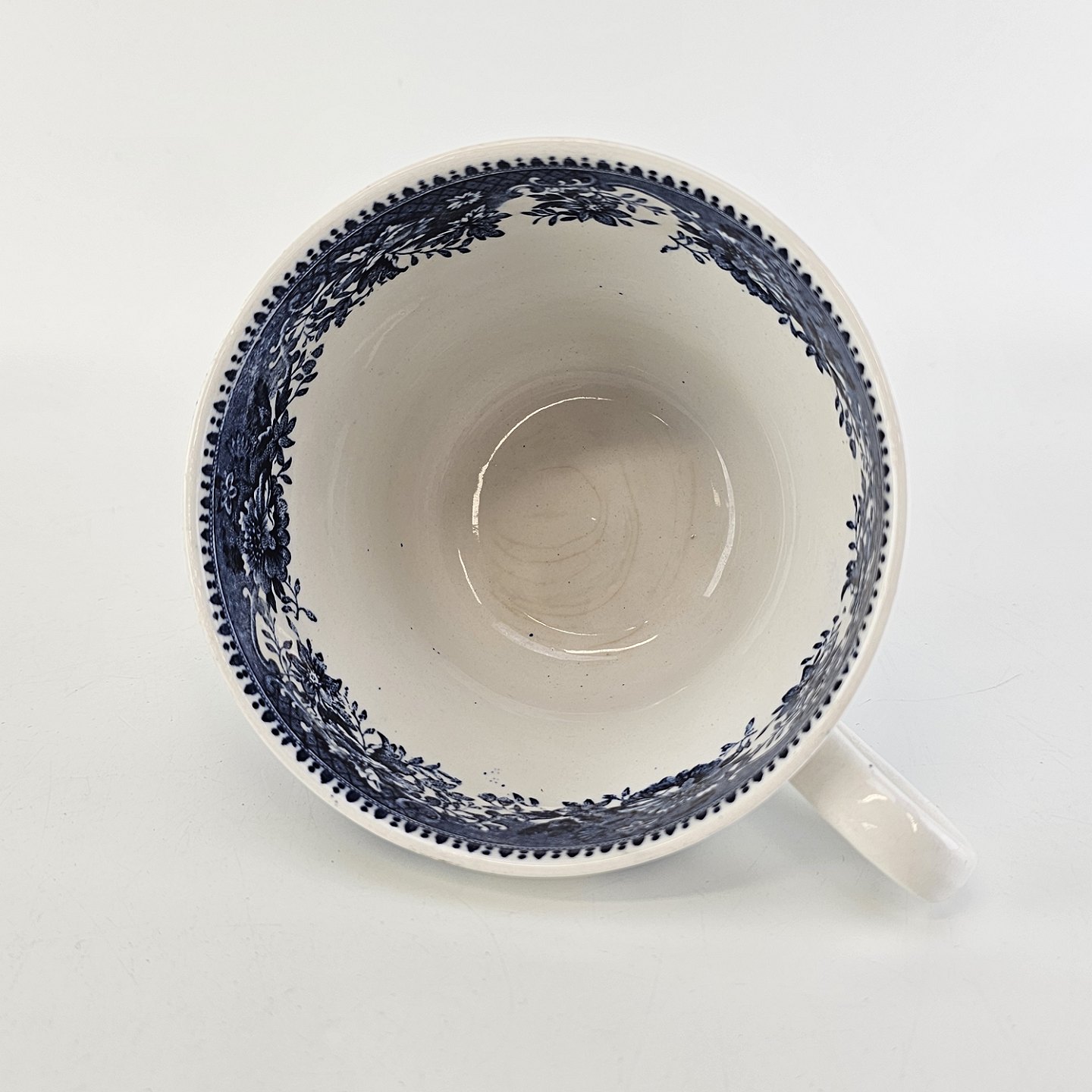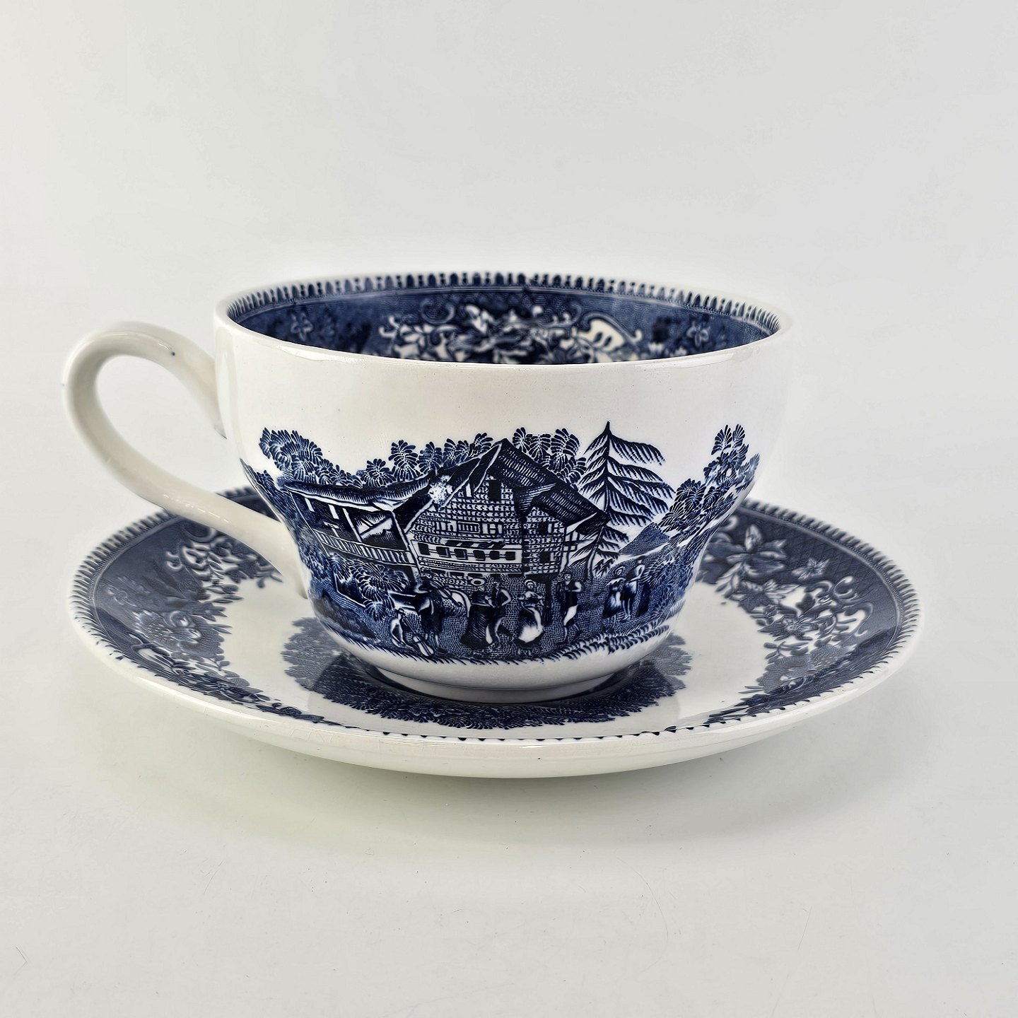 Blå kop og underkop i engelsk fajance fra stellet Avon Cottage
