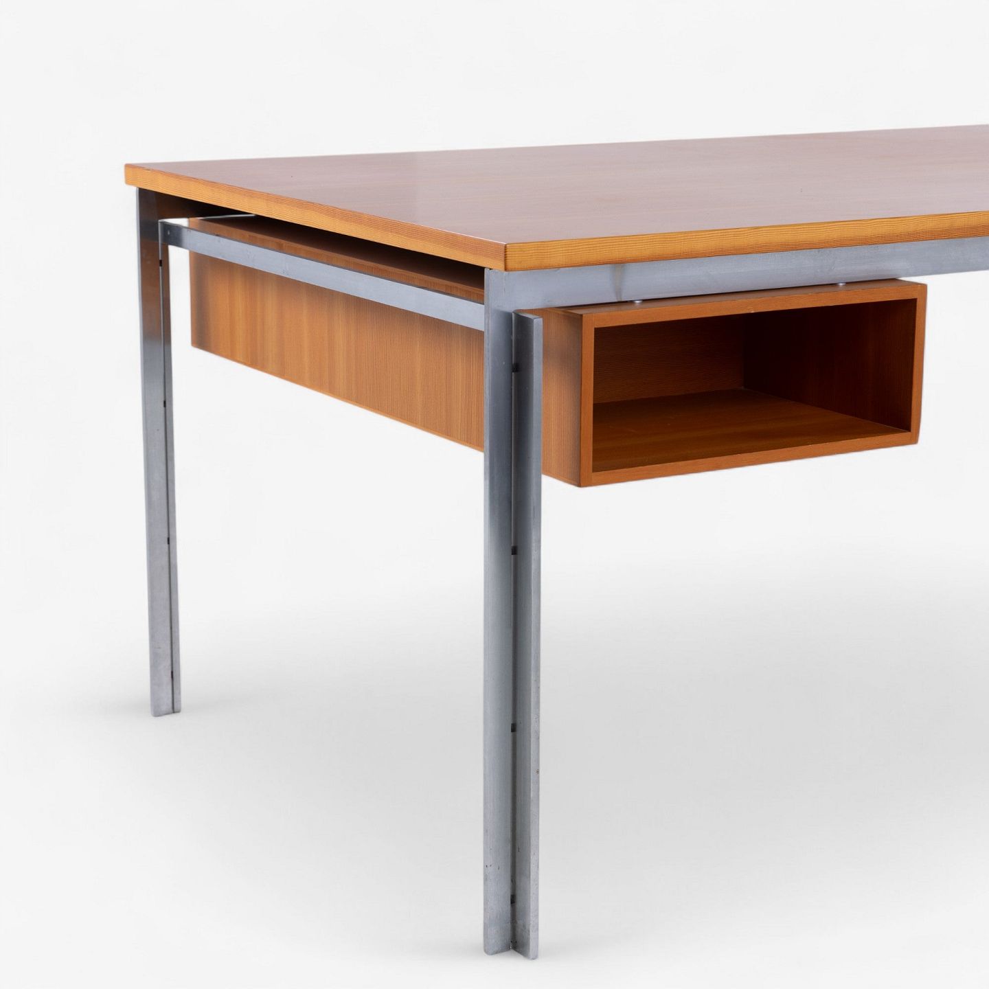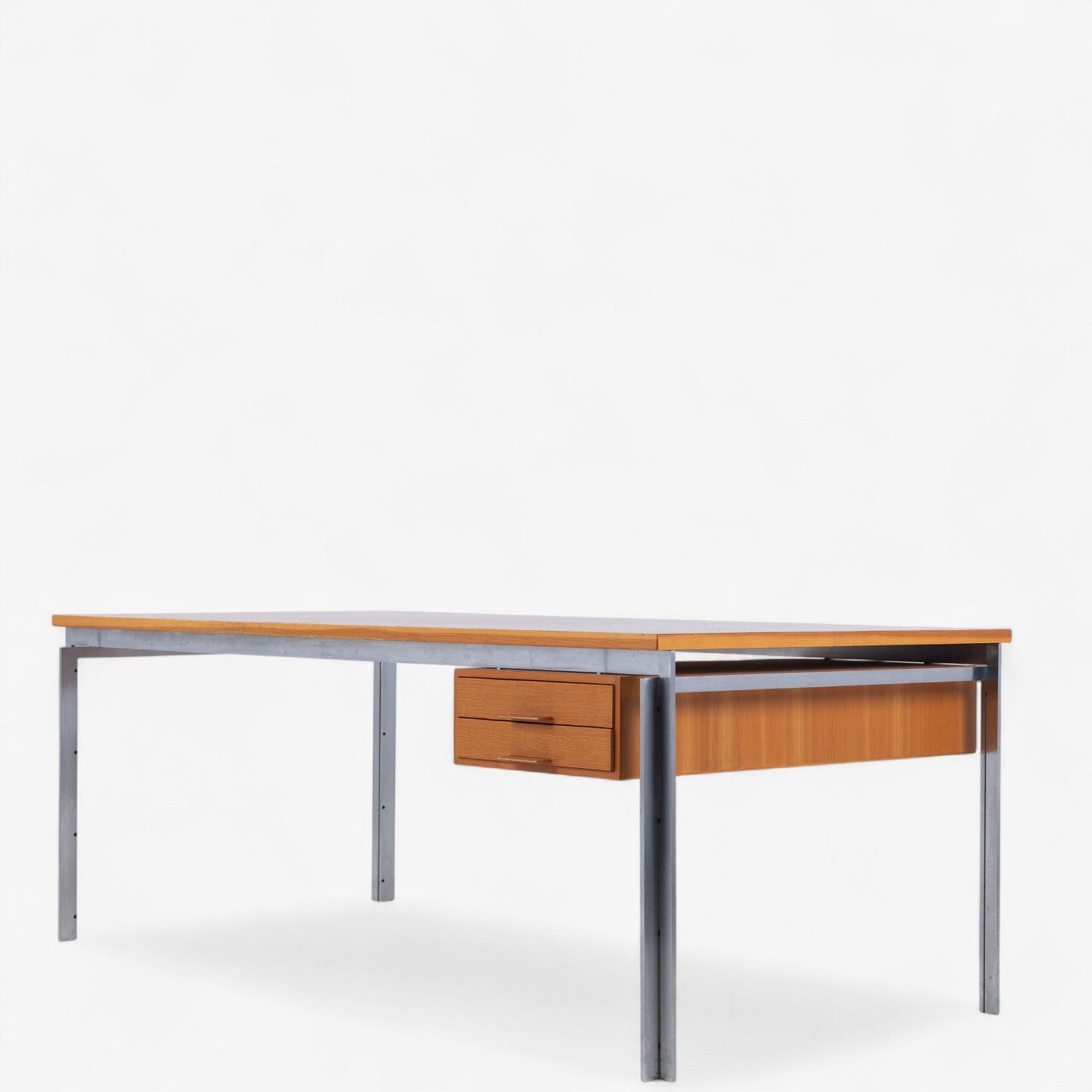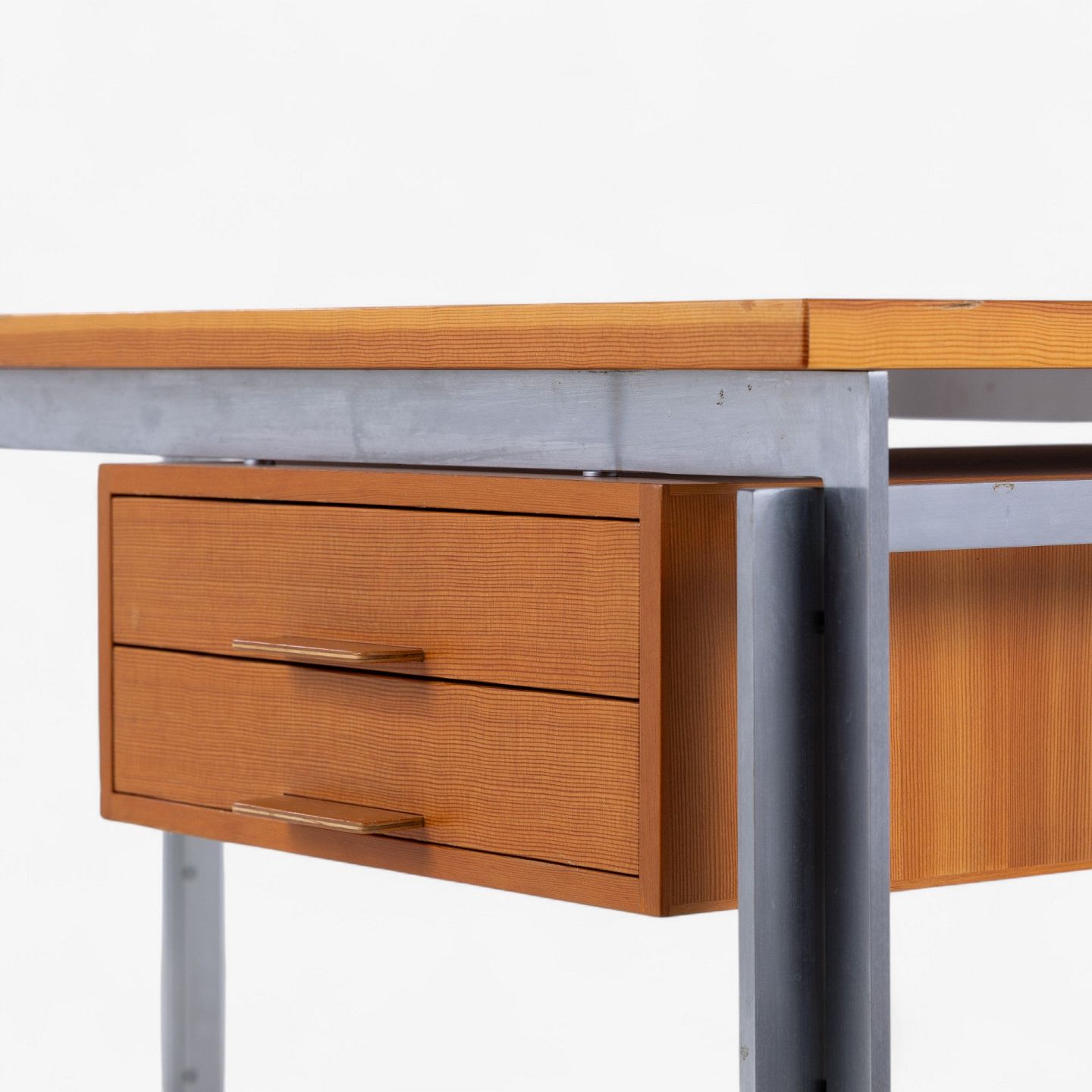 PK 55 - Arbejdsbord/skrivebord med plade og skuffemodul i oregon pine og stel i stål. Fra 1985. Mærket fra producent.
