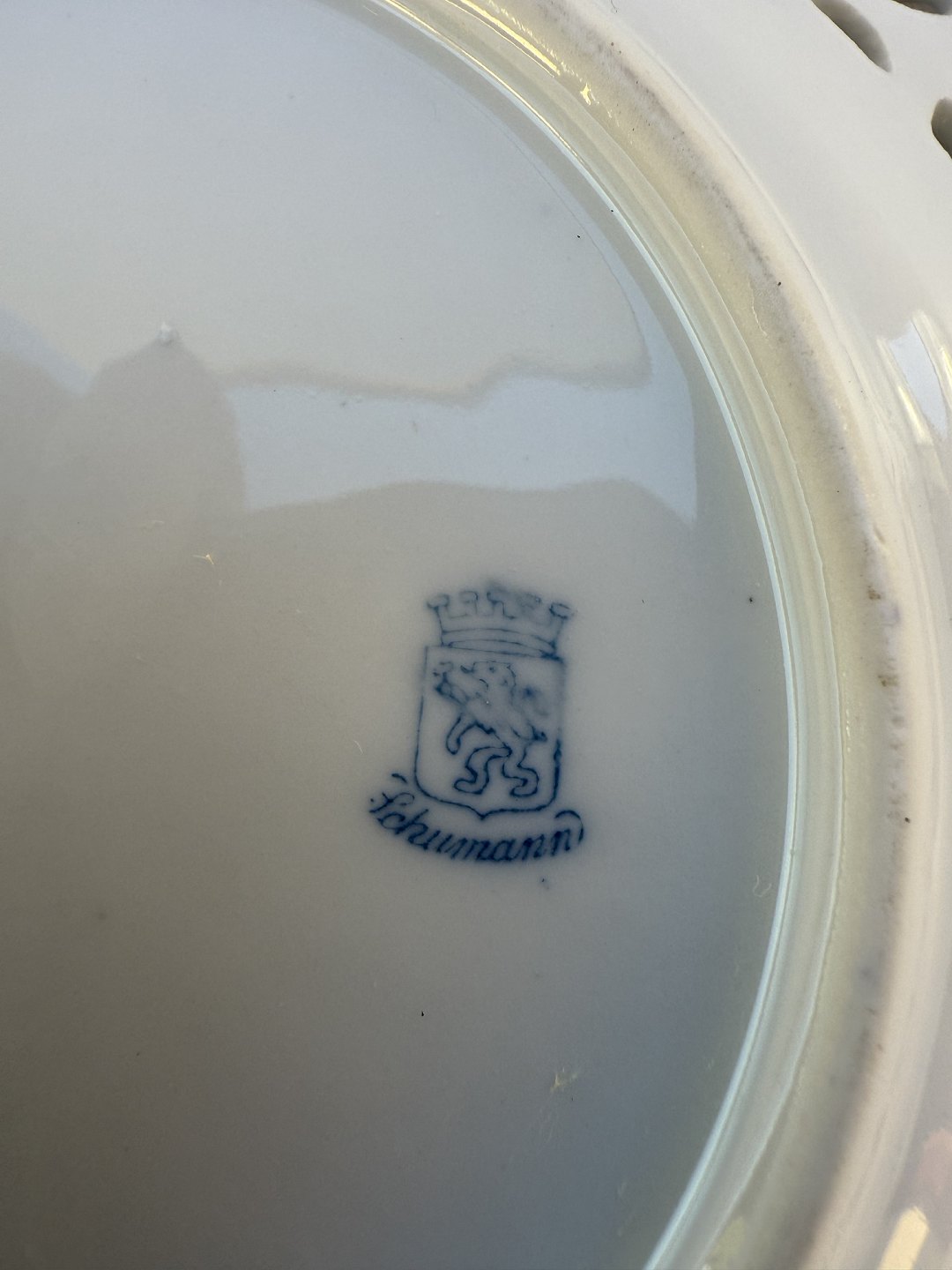 Schumann, Deutschland, Schüssel und 8 Teller mit durchbrochenem Rand, etwas Abnutzung am Goldrand der Schüssel, sonst guter Zustand, Tellerdurchmesser 19 cm, Schüsseldurchmesser 23 cm.