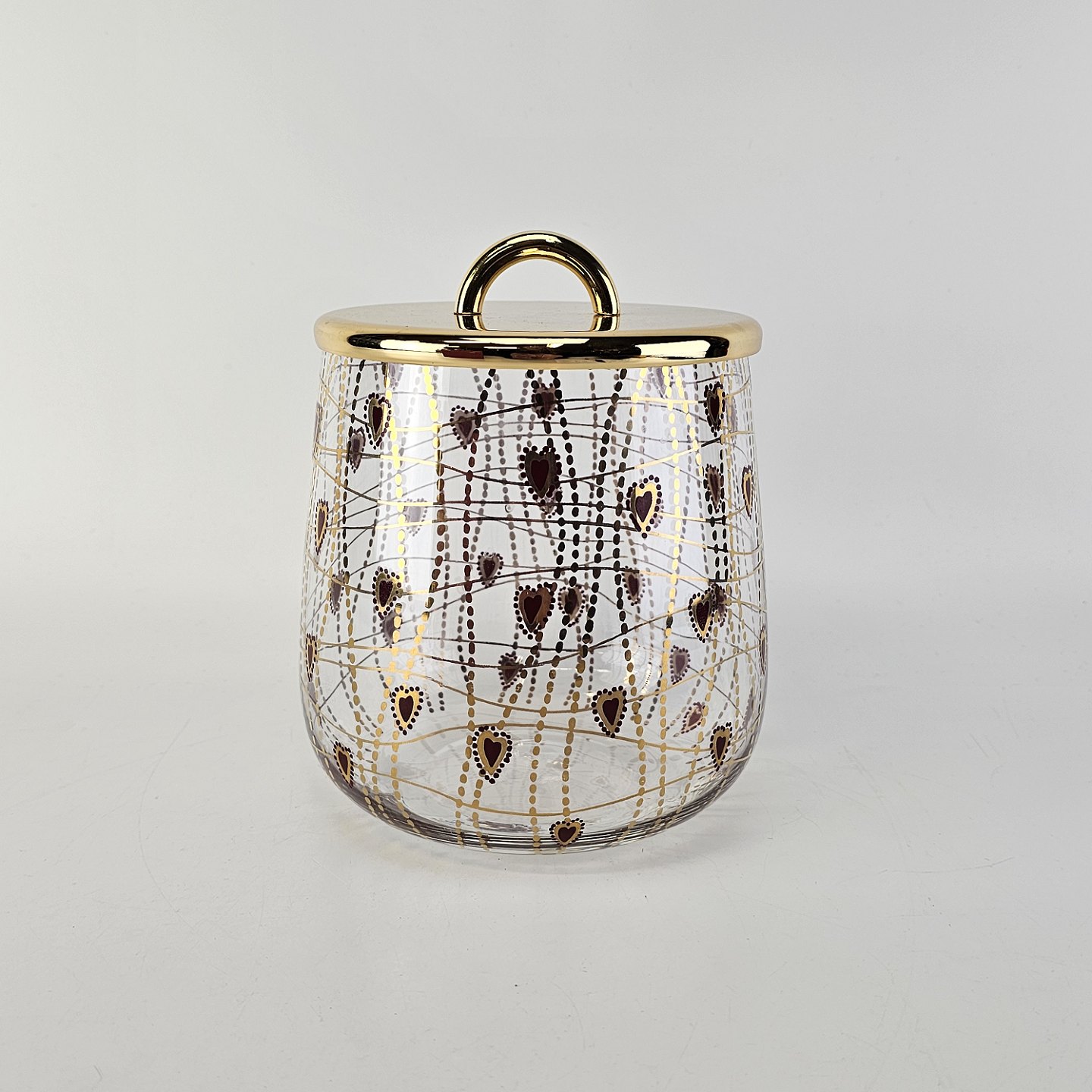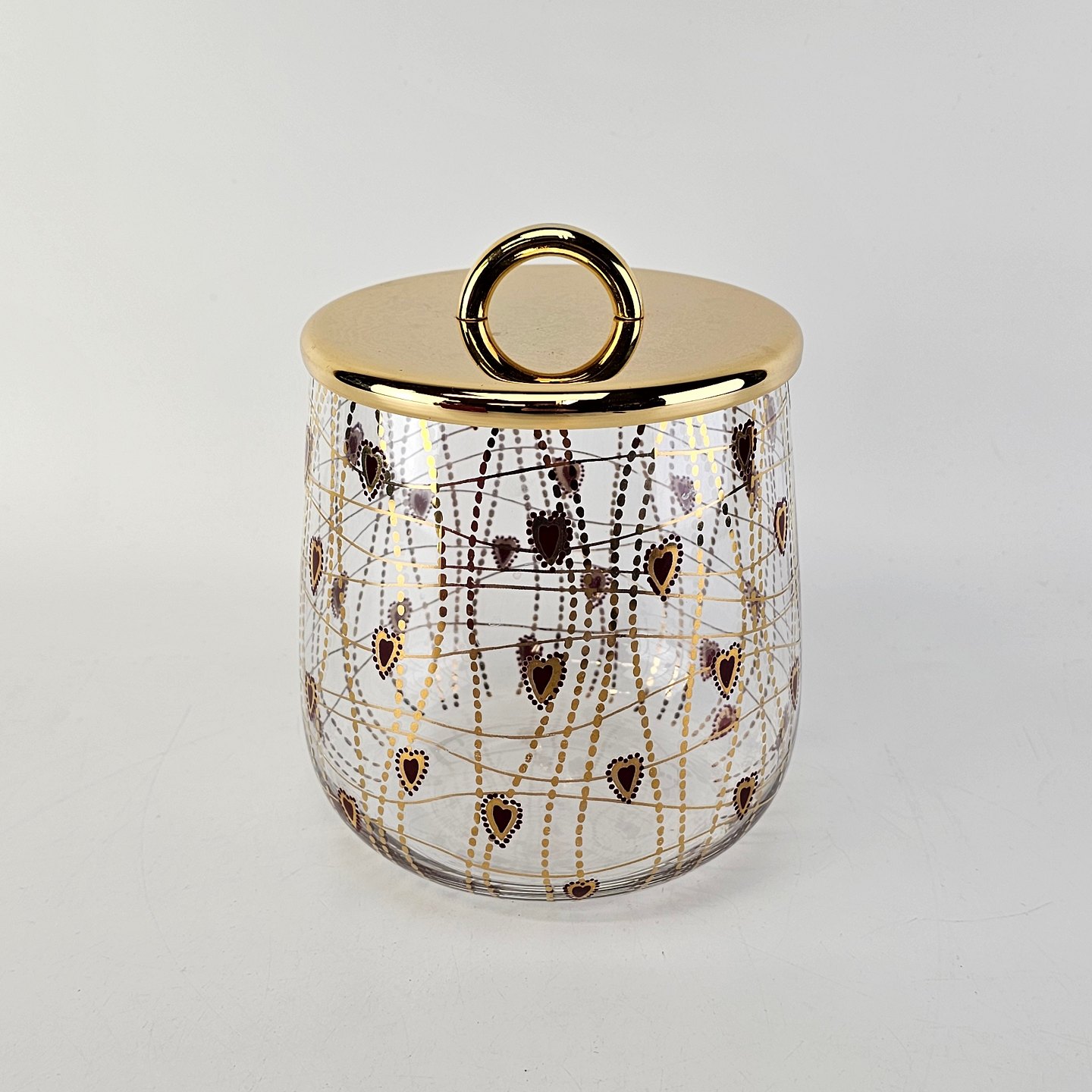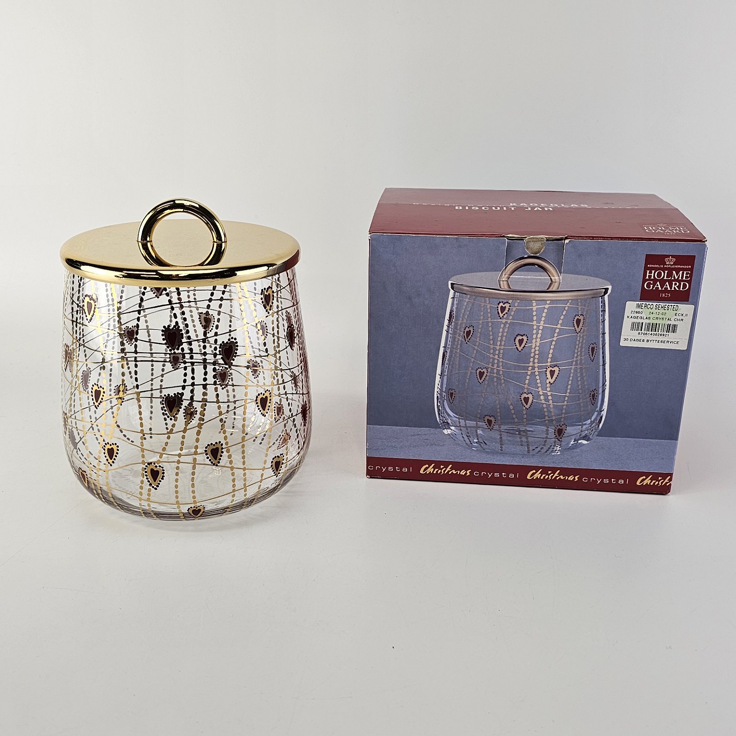 Text zugänglich auf Dänische: Kagedåse af glas med mønster af røde hjerter og guldstreger, og gyldent låg