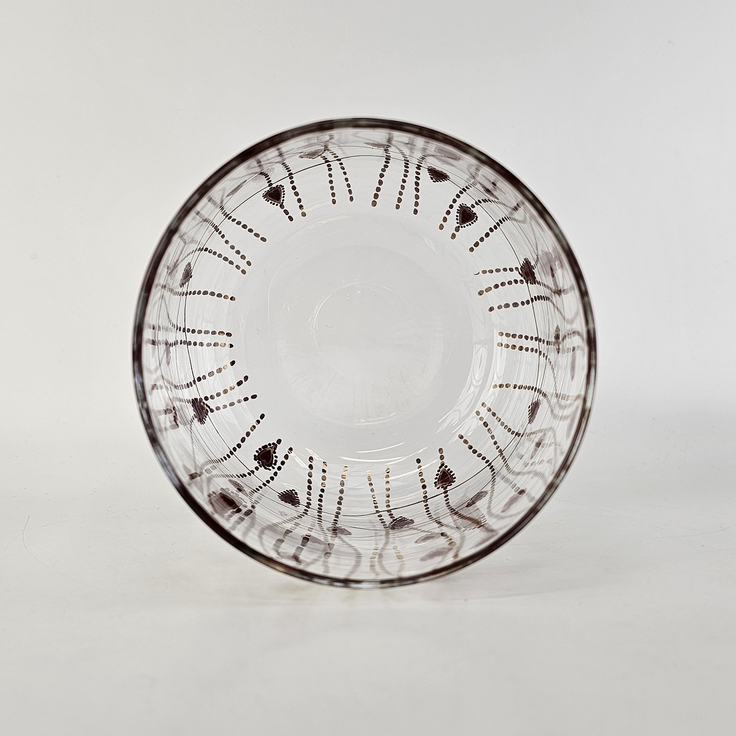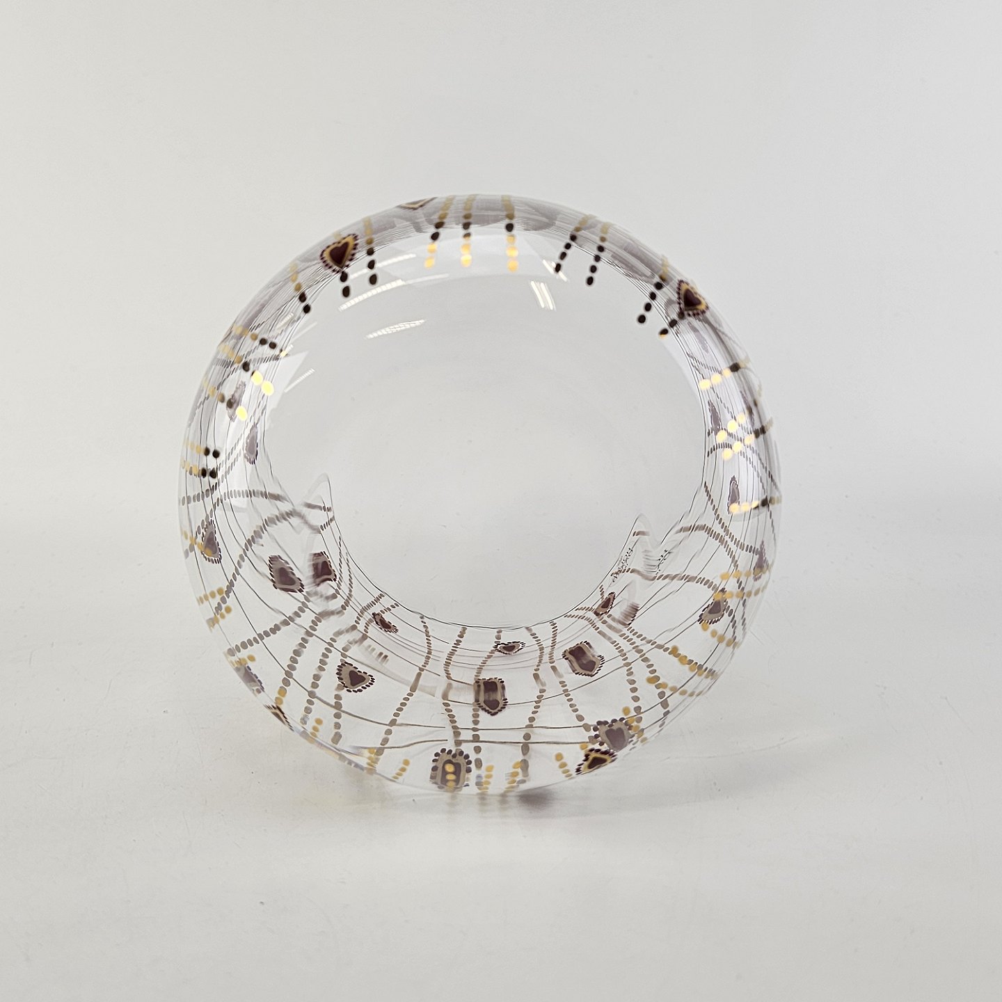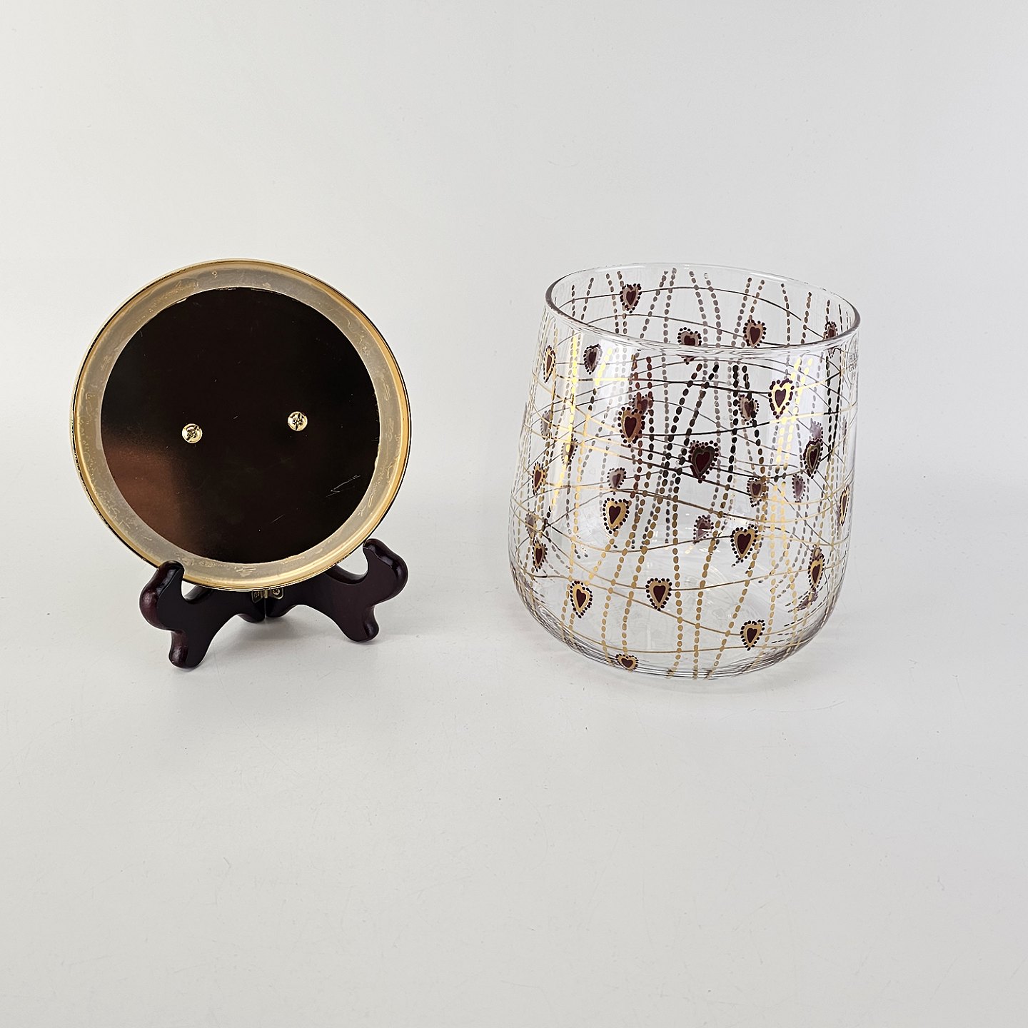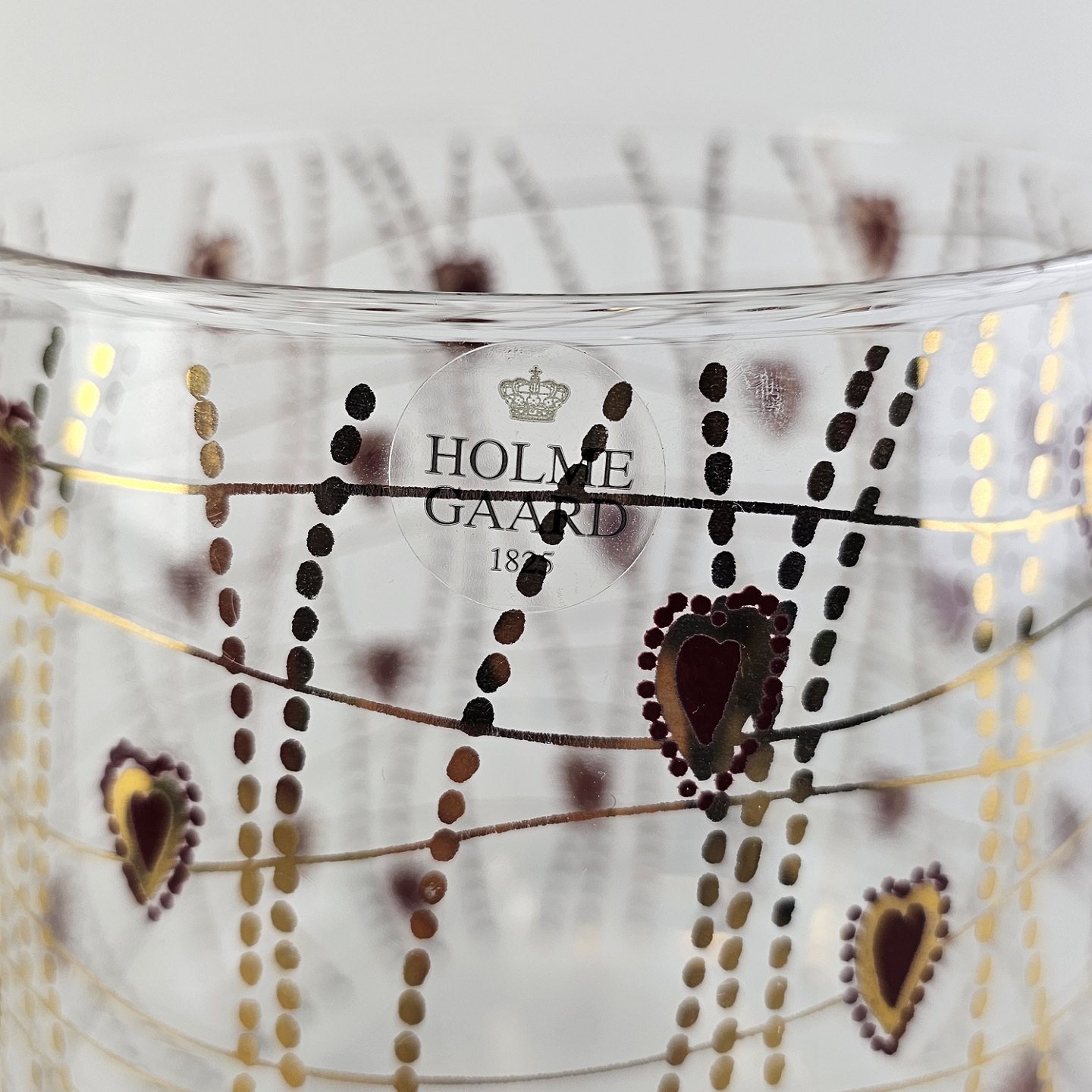 Text zugänglich auf Dänische: Kagedåse af glas med mønster af røde hjerter og guldstreger, og gyldent låg