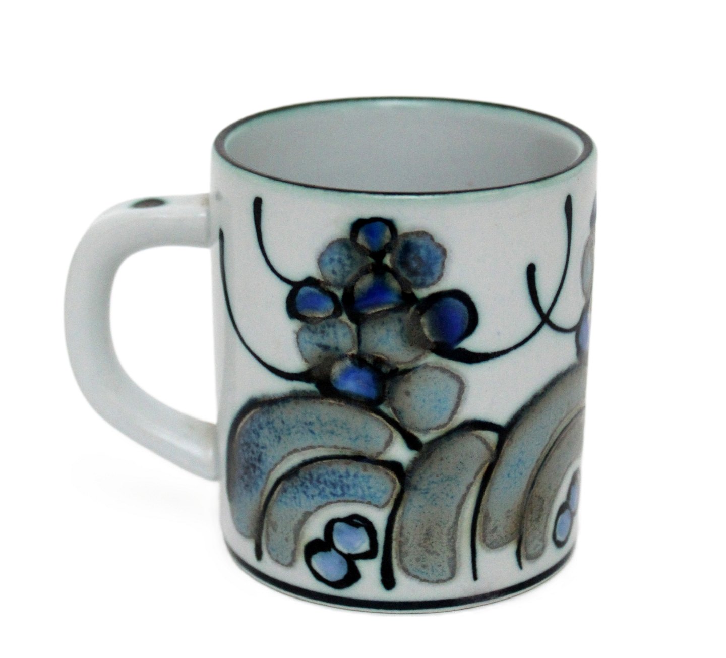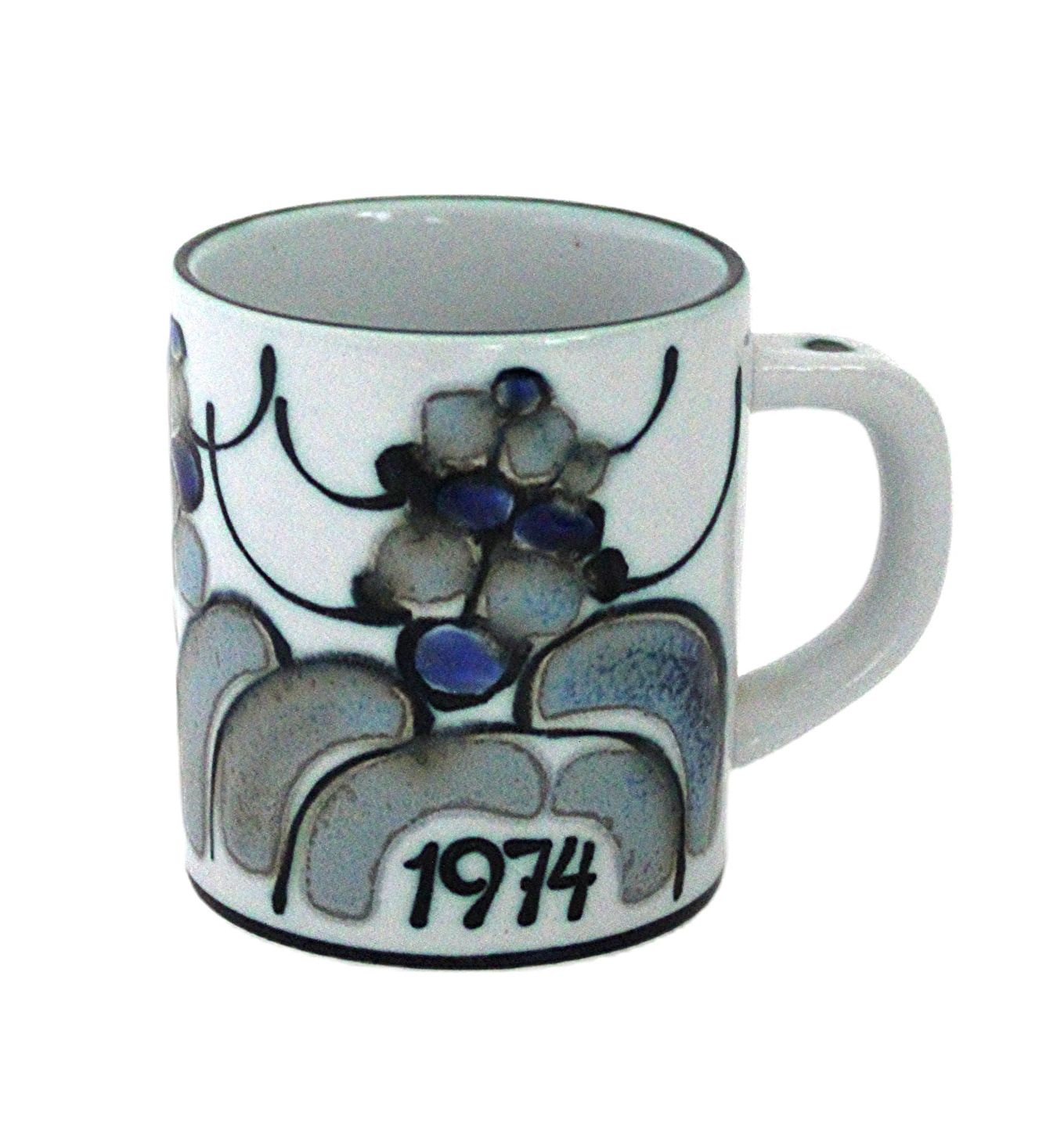 Text zugänglich auf Dänische: Royal Copenhagen, Lille årskrus 1974. Designer Ellen Malmer. Nr. 3495. Årskrus er produceret fra 1967 til 2014. Højde 7,5 cm. Diameter 6,5 cm. Pris: 125 kr. stk. Lager: 1