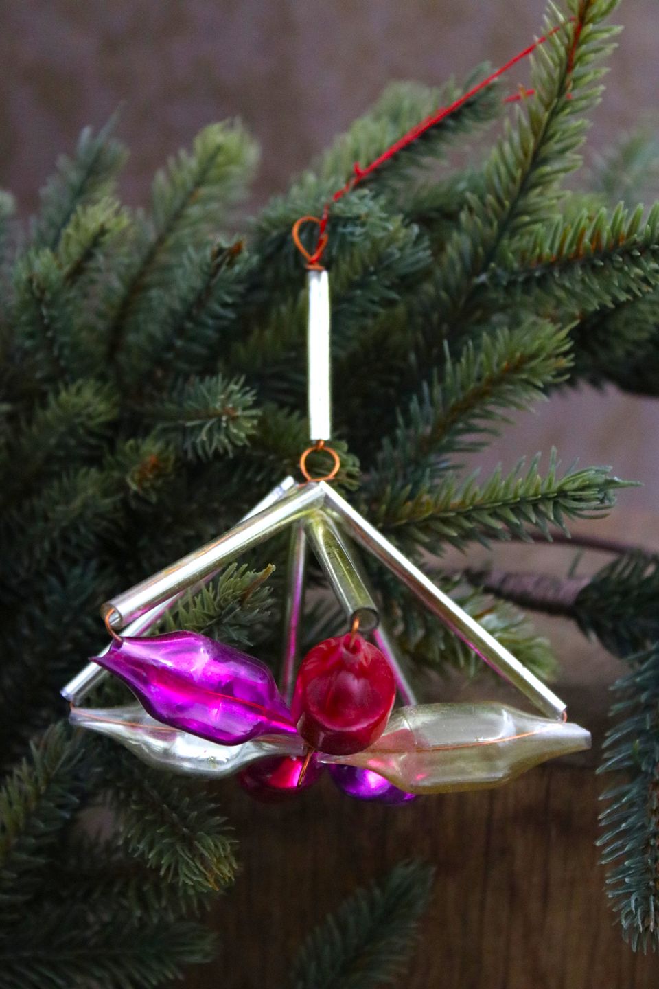 Gammelt juletræspynt i form af farvet glas pynt fra omkring 1940.