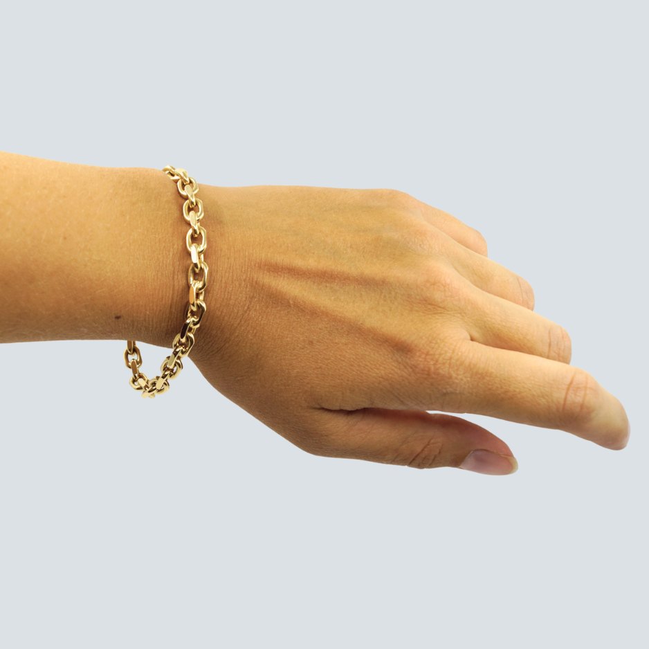 Text zugänglich auf Dänische: Anker-facet armbånd i 14 kt. guld. Ankerarmbånd med facetslebne led. Monteret med kasselås samt to sikkerhedslåse.