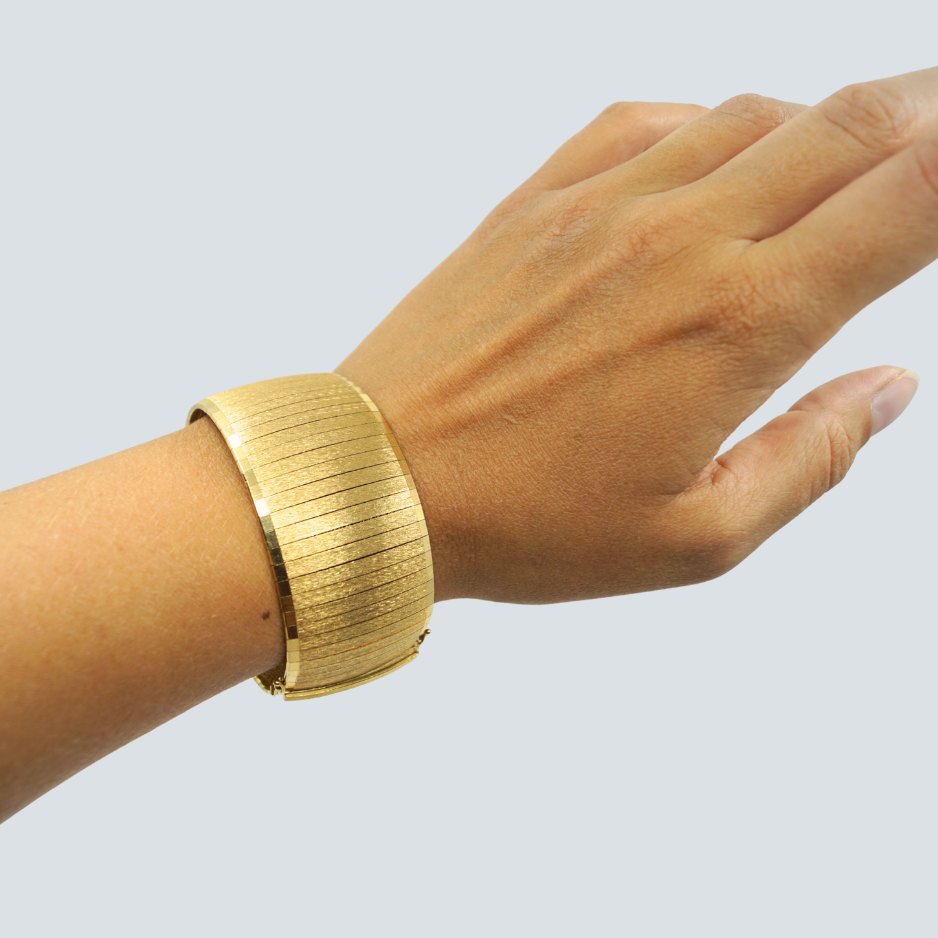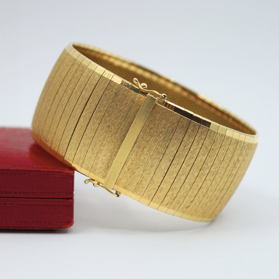 Text zugänglich auf Dänische: Meget bredt armbånd af 18 kt. guld i kraftig kvalitet.