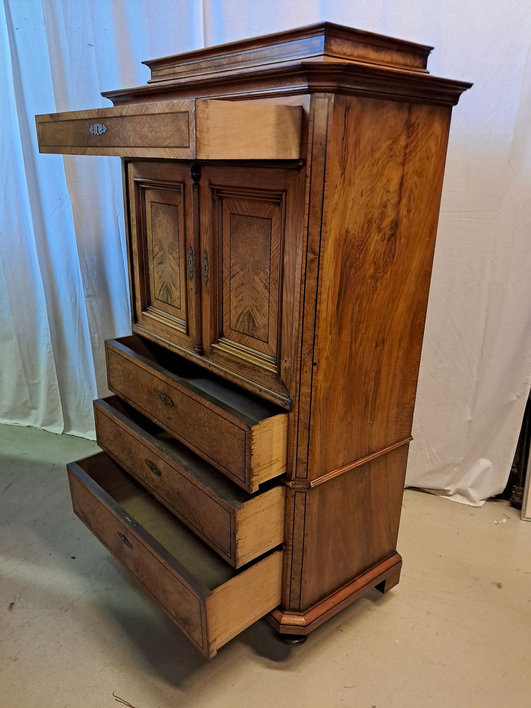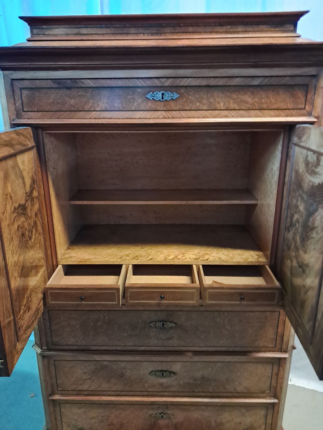 Sølvtøjsskab i fineret nødetræ og mahogni, fra 1900erne.