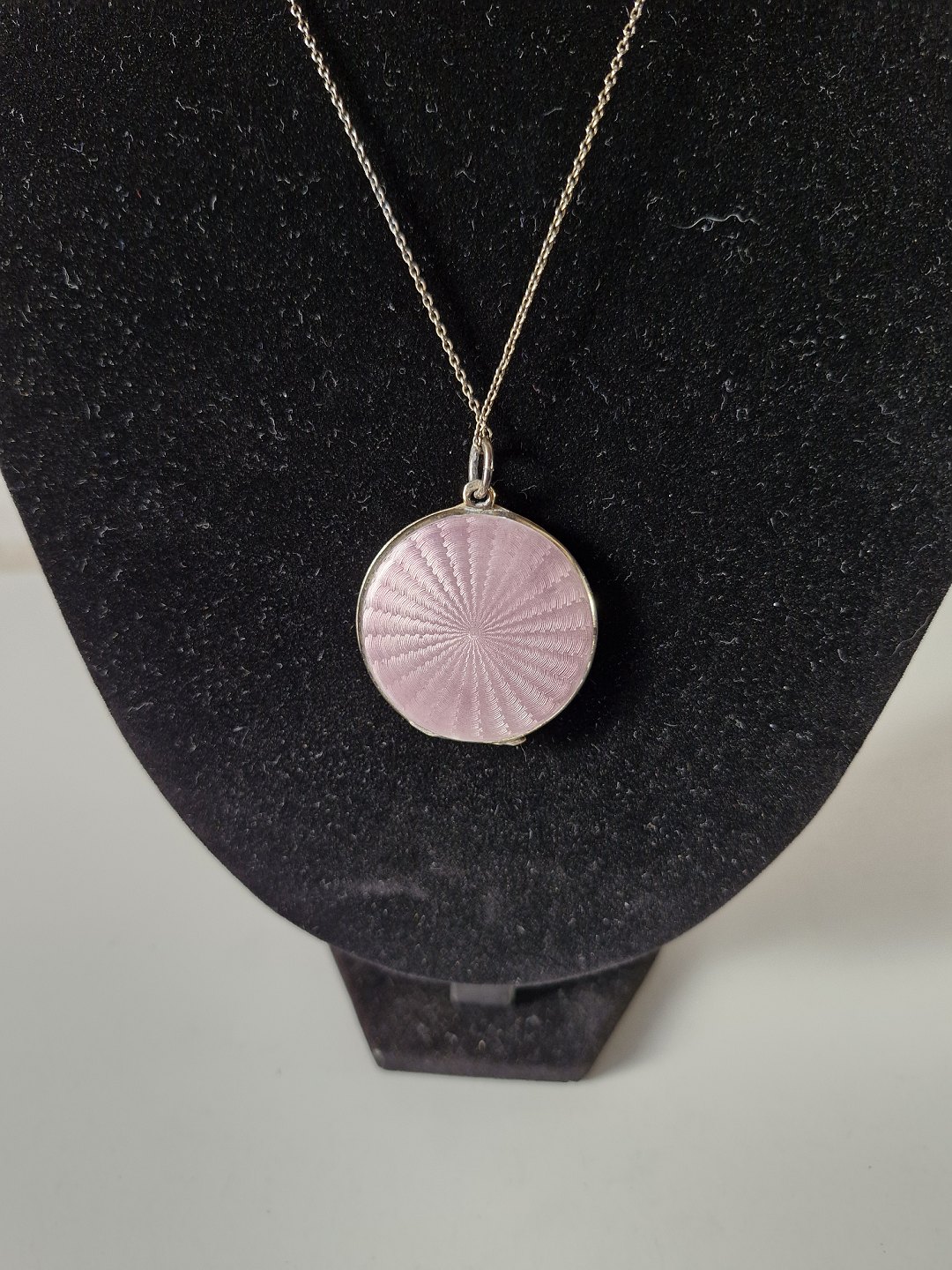 Text zugänglich auf Dänische: Smuk svensk medaljon med kæde i forgyldt sølv og lyslilla/lyserød emalje dekoreret med kirsebærblomster