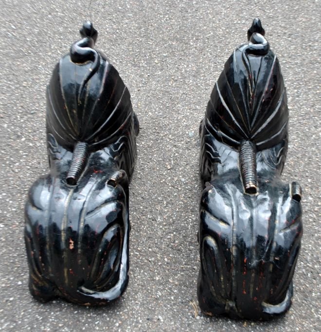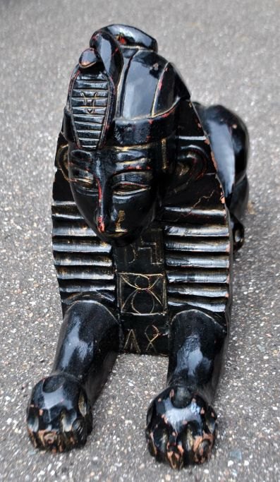 Paar große, dekorative, schwarz bemalte Sphinxen aus Holz, 20. Jahrhundert, Ägypten.