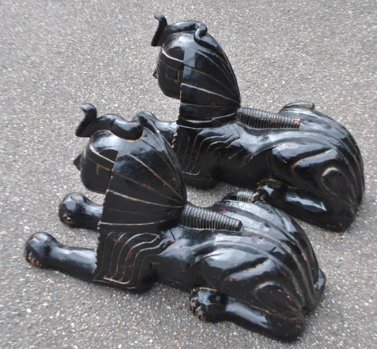 Paar große, dekorative, schwarz bemalte Sphinxen aus Holz, 20. Jahrhundert, Ägypten. L.: 65 cm. B.: 22 cm. H.: 44 cm.