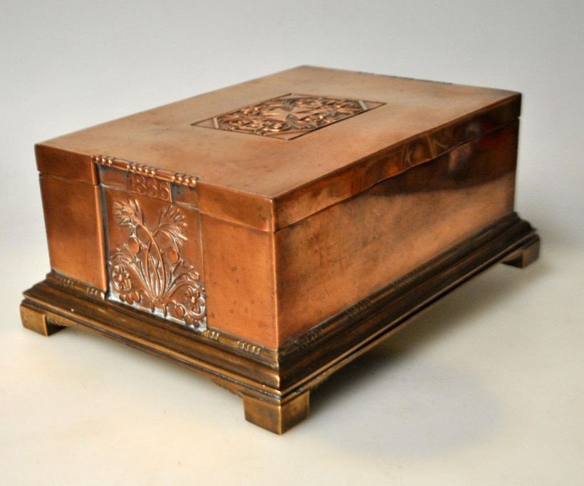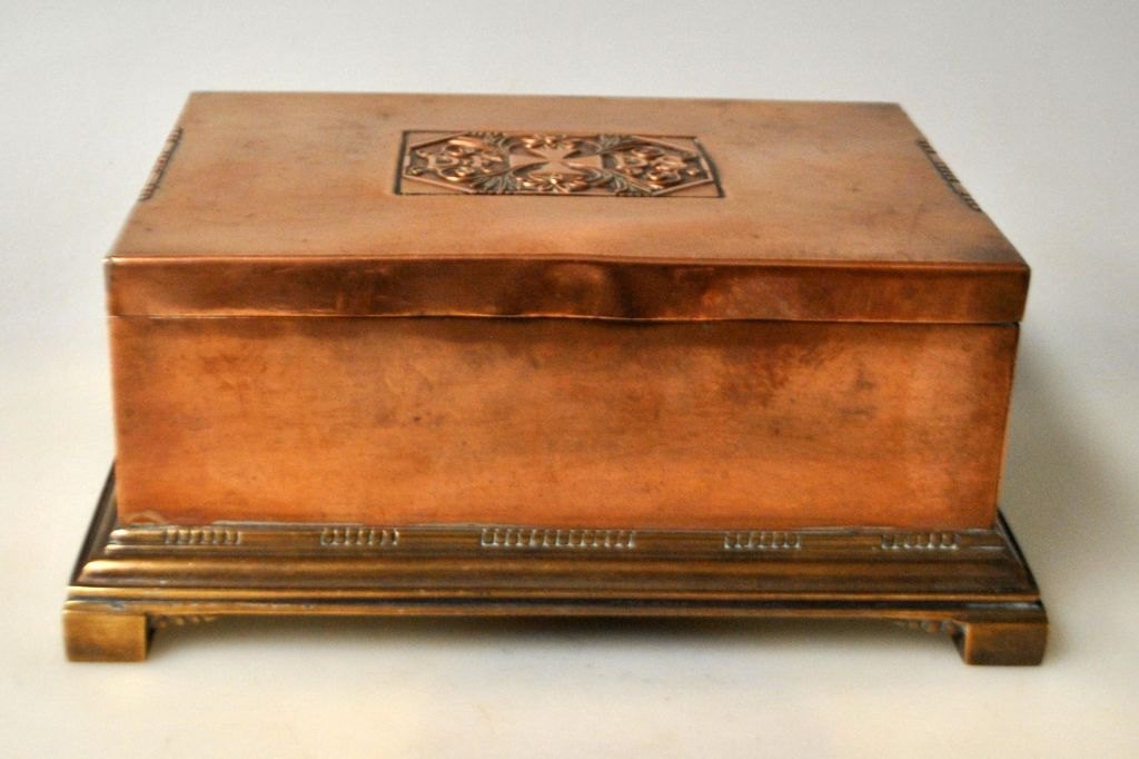DFDS-Zigarrenkiste aus Kupfer und Messing, innen mit Holz. 1916. Johan Rohde für Georg Jensen. Geprägt mit künstlerischen Motiven und DFDS 1866-1916. Innenplakette: Zur Erinnerung an das 50-jährige Jubiläum der United Steamship Company. H. 8,5 B. 19 T. 14 cm.