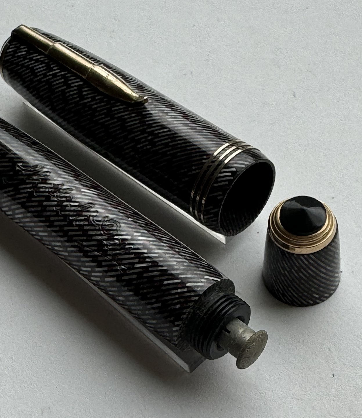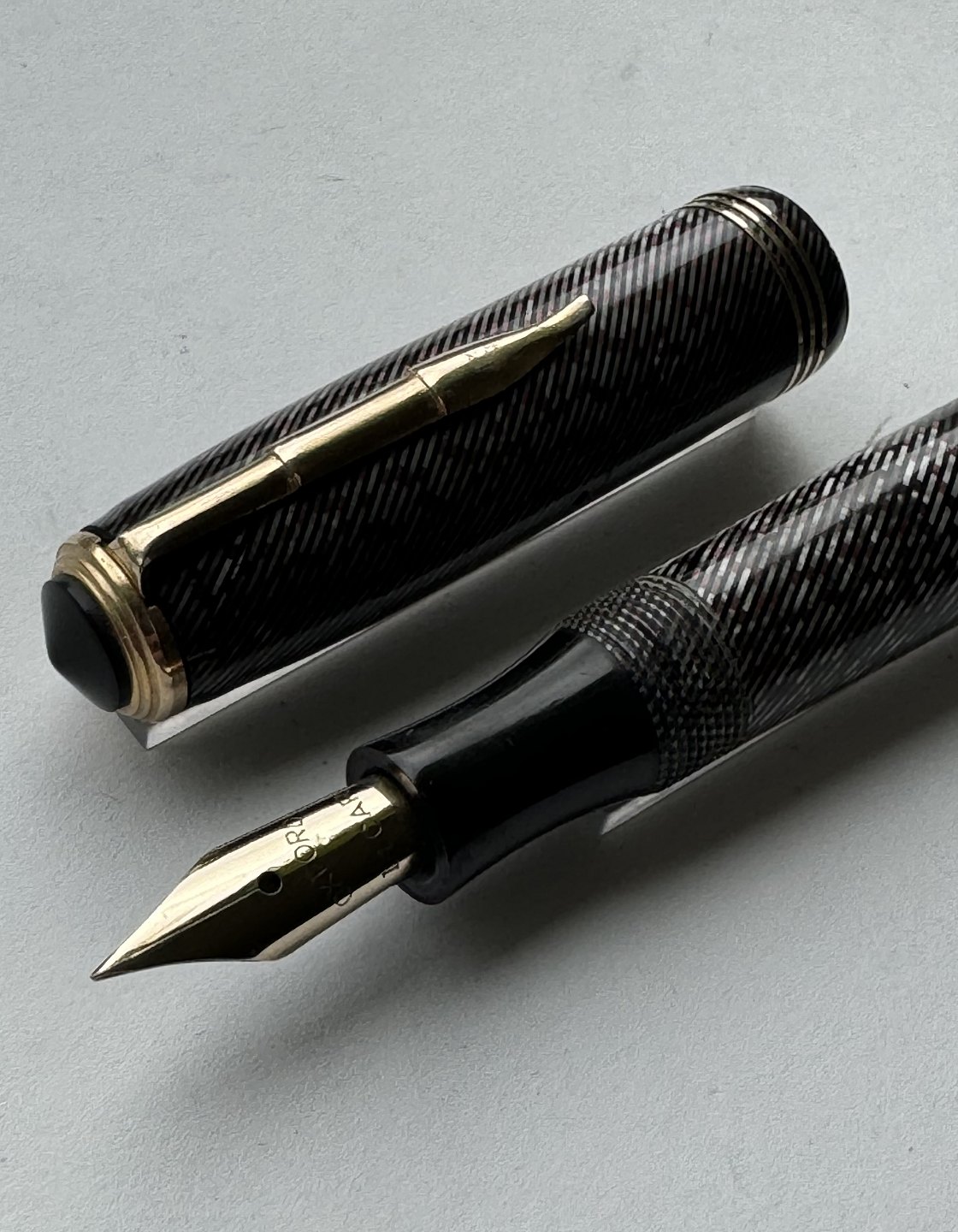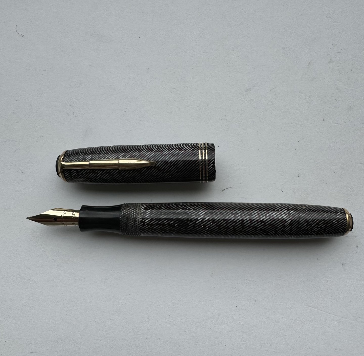 Sølv og grøn spiralstribet Sheffield Pen fyldepen fremstillet i 1940’erne. Spidsen er en 14 karat guldstoles fra Oxford. Muligvis et dansk produkt. Har F.eks. Lighed med fyldepenne fremstillet hos Penol. Fremstår i god stand. Fungerer ikke. Der skal indsættes ny gummisæk før end pennen kan optage blæk og skrive igen. Ny gummisæk kan indsættes mod et tillæg på kr. 250,- til fyldepennens pris. Mål: 12,2 cm