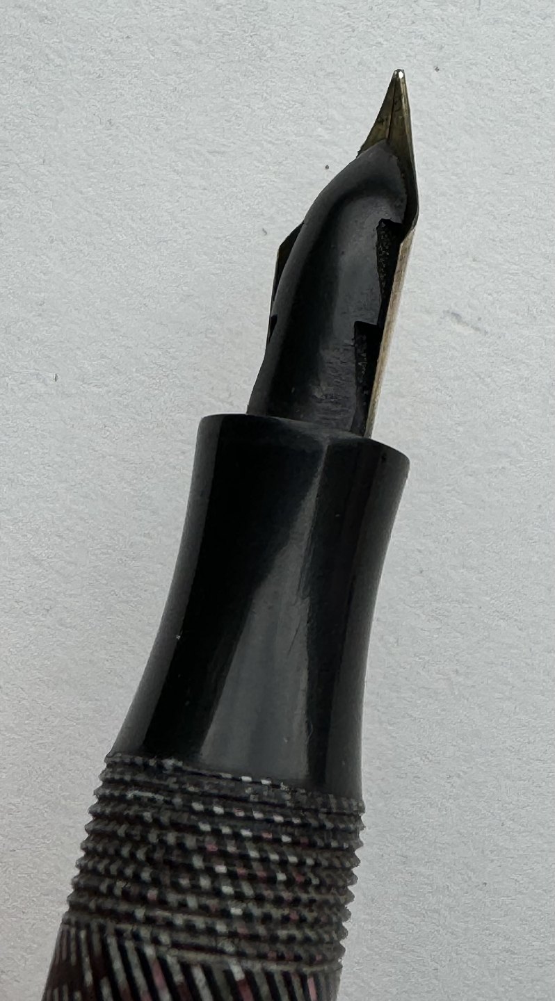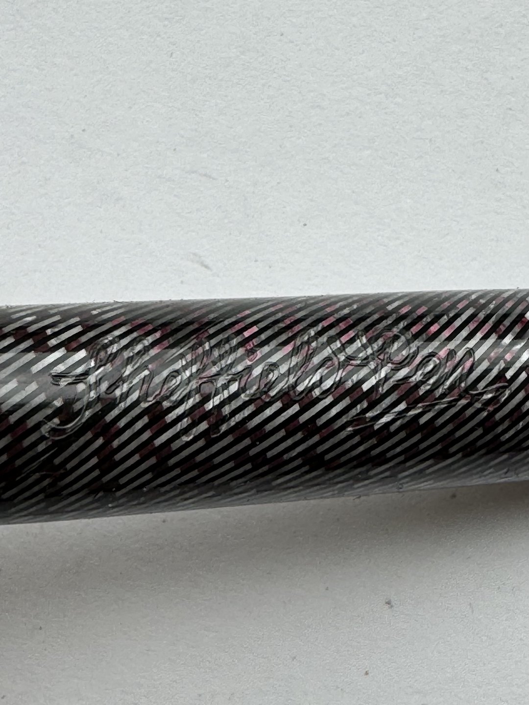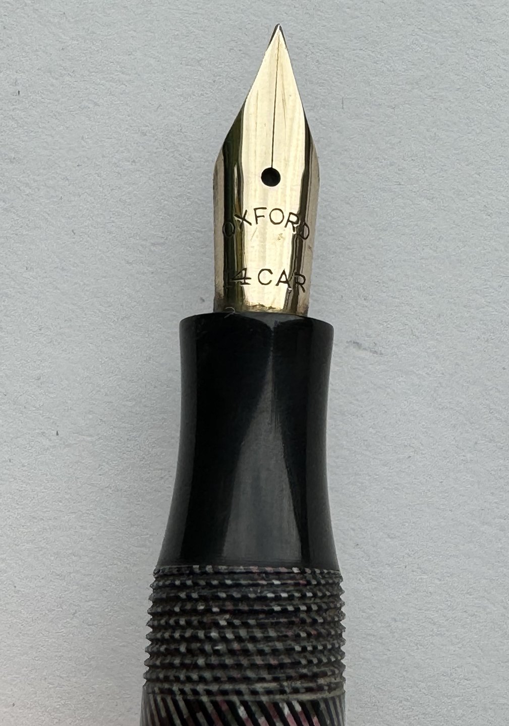 Sølv og grøn spiralstribet Sheffield Pen fyldepen fremstillet i 1940’erne. Spidsen er en 14 karat guldstoles fra Oxford. Muligvis et dansk produkt. Har F.eks. Lighed med fyldepenne fremstillet hos Penol. Fremstår i god stand. Fungerer ikke. Der skal indsættes ny gummisæk før end pennen kan optage blæk og skrive igen. Ny gummisæk kan indsættes mod et tillæg på kr. 250,- til fyldepennens pris. Mål: 12,2 cm