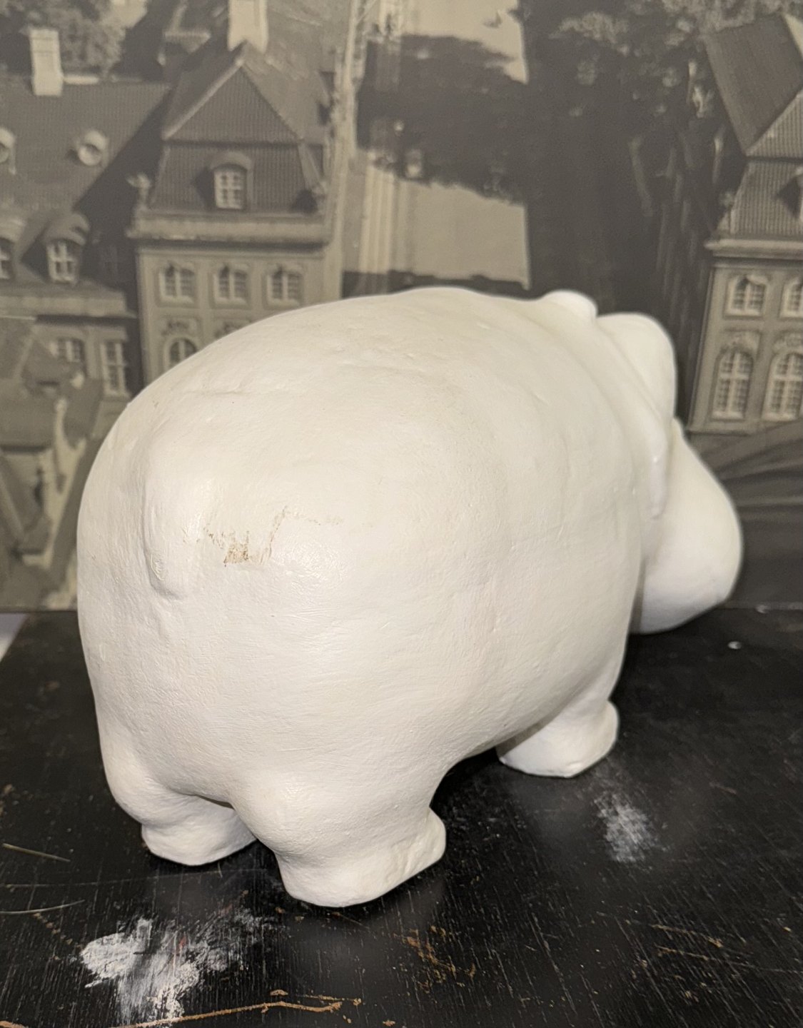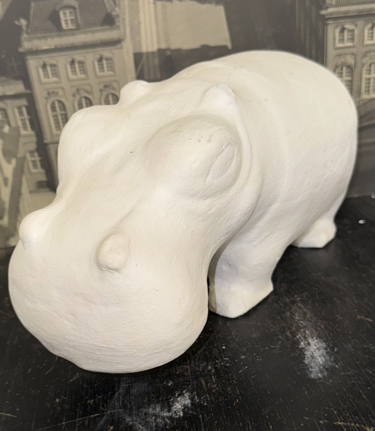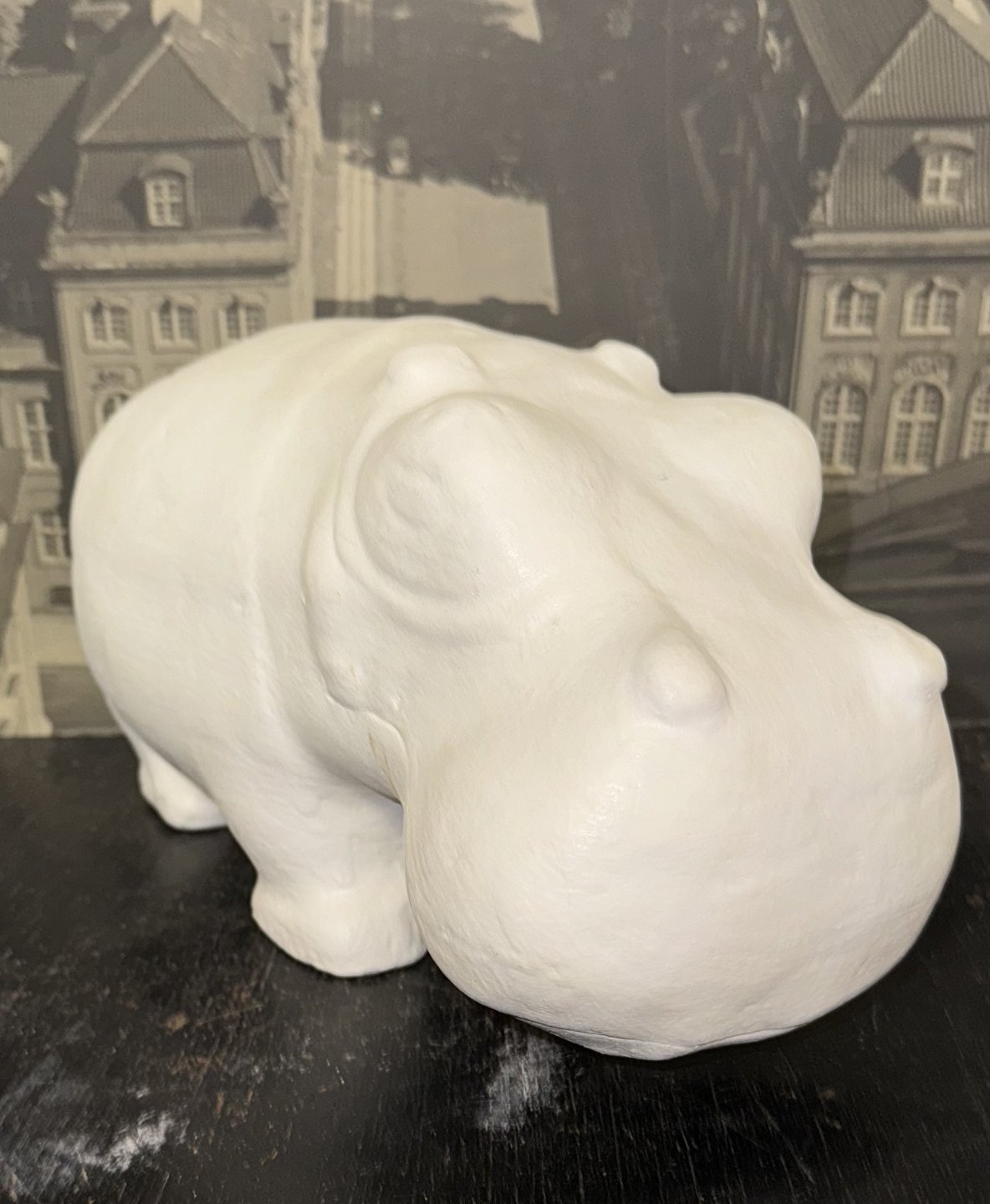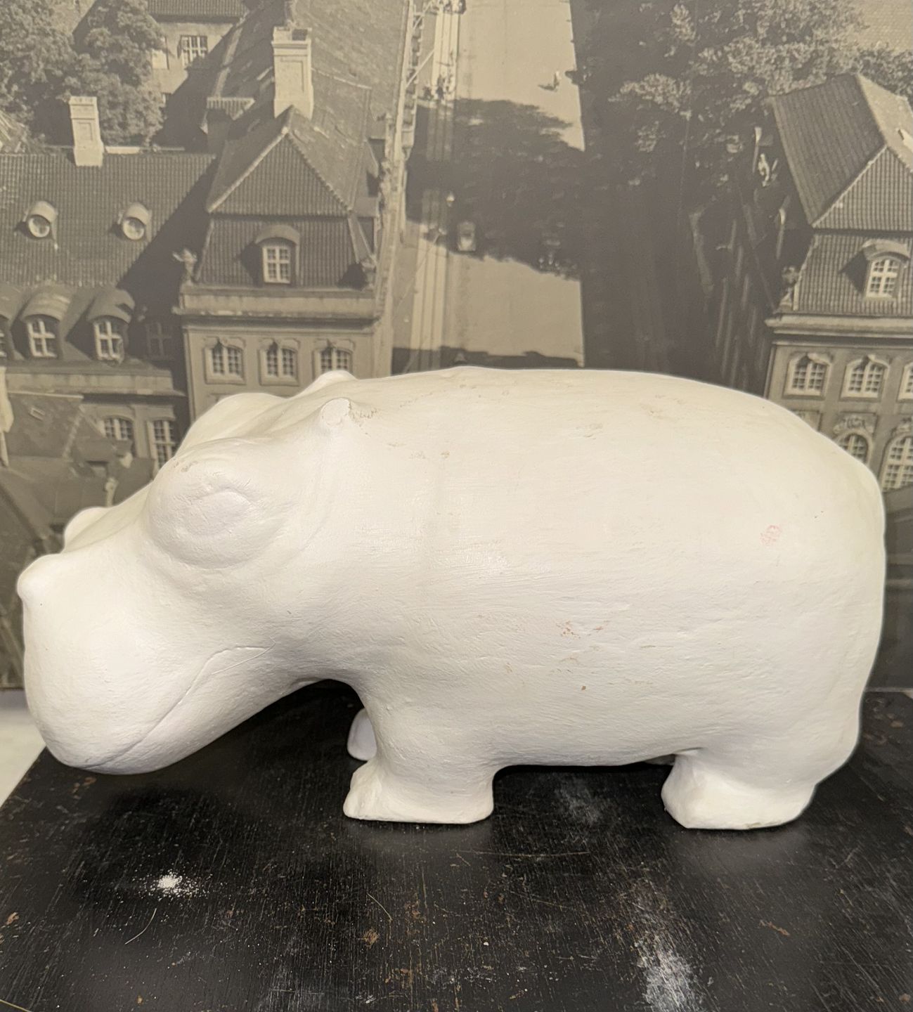 Stor figur af flodhest udført i ubemalet gips. Fremstår i god stand med få overflade brugsspor. Formodes fremstillet for Ny Carlsberg Glyptoteket i København. Figuren er formentlig en museums-kopi af flodhest i sten, der tilhører museets samling. Den oprindelige figur er cirka i samme størrelse og udført i keramik. Lignende figurer ses på museer rundt i verden. Nogle farvede andre uden farve. I oldtidens Egypten blev lignende flodhestestatuetter ofte placeret i grave for at beskytte den afdøde i efterlivet eller i hjem for at beskytte familien. I dag forventes figuren dog hovedsageligt at blive brugt som et dekorativt objekt i den private bolig. Mål: H. 14 cm, B. 12,5 cm og L. 29,5 cm.