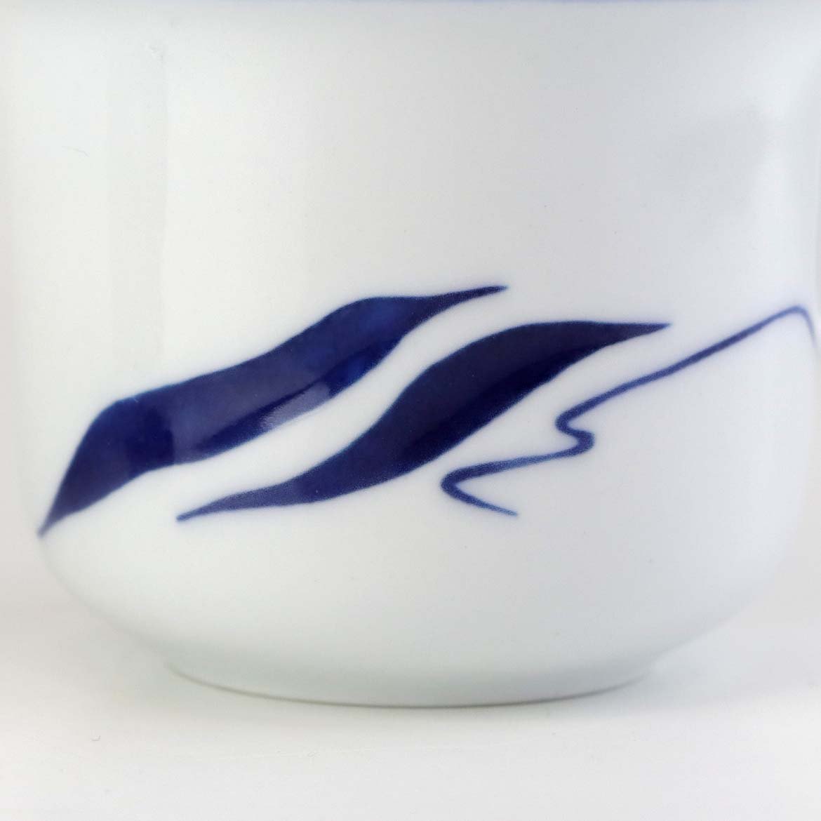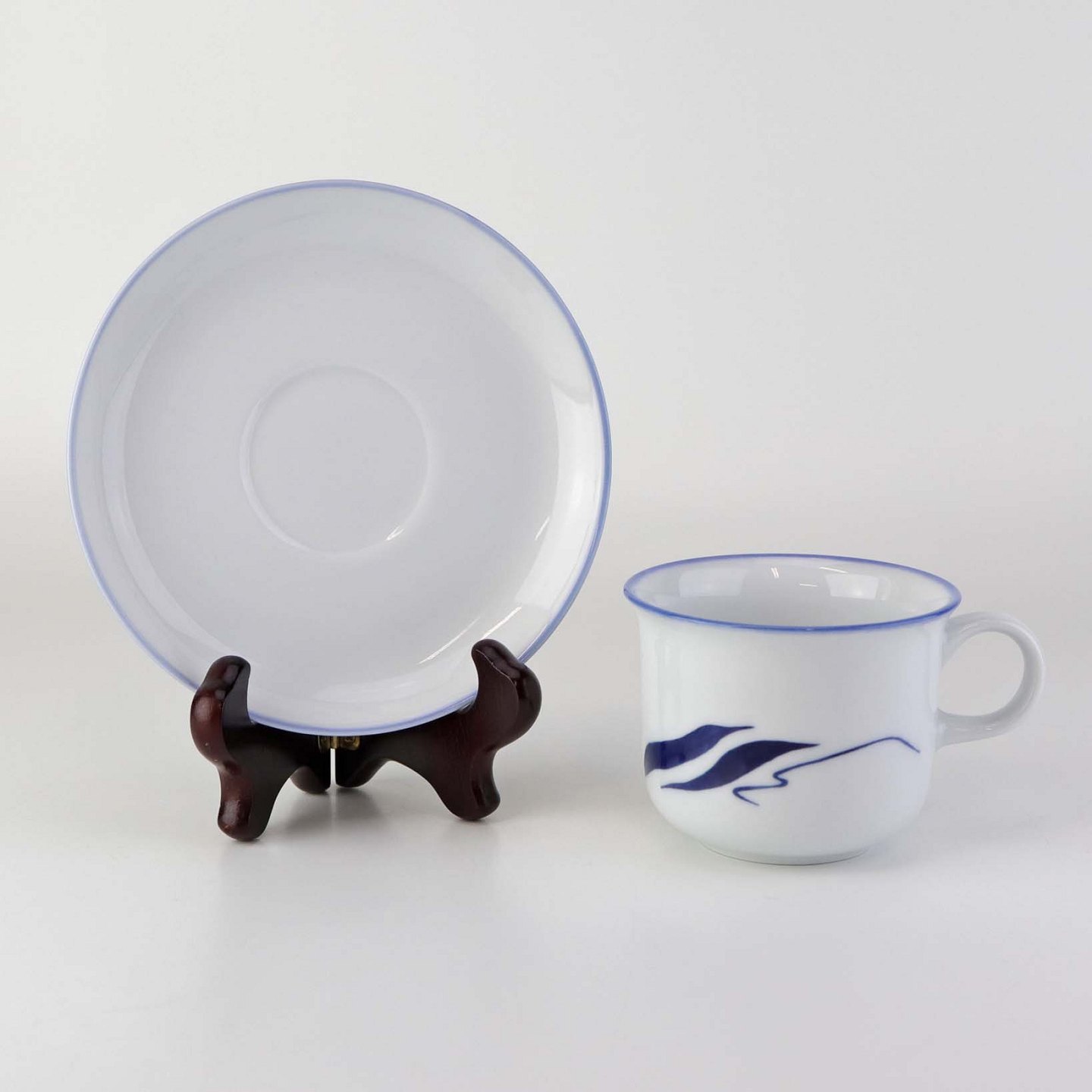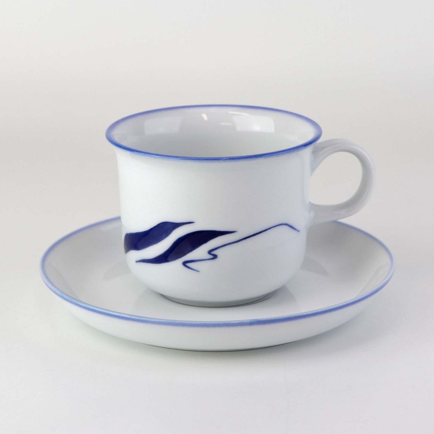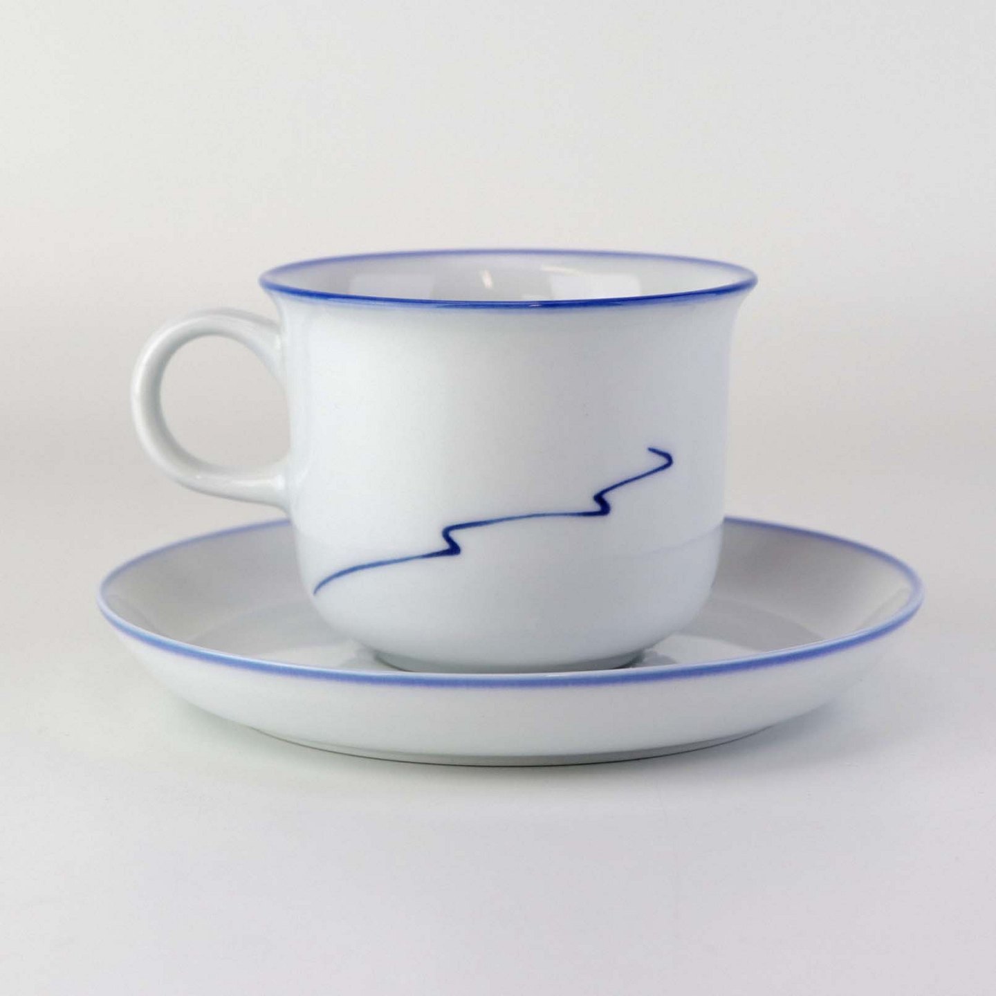 Stel i glat hvidt porcelæn med lyseblå kant og blåt bølget dekoration