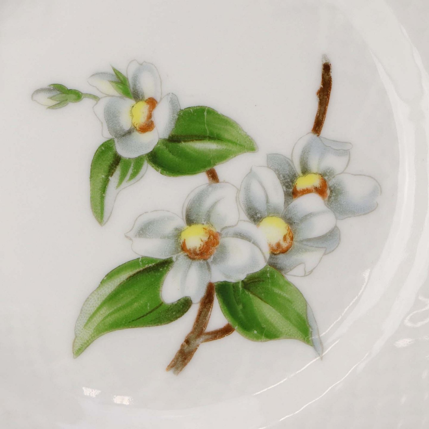 Heimdal er cremefarvet porcelæn i skælform, som dekoreret med jasminblomster, grene og en guldkant.