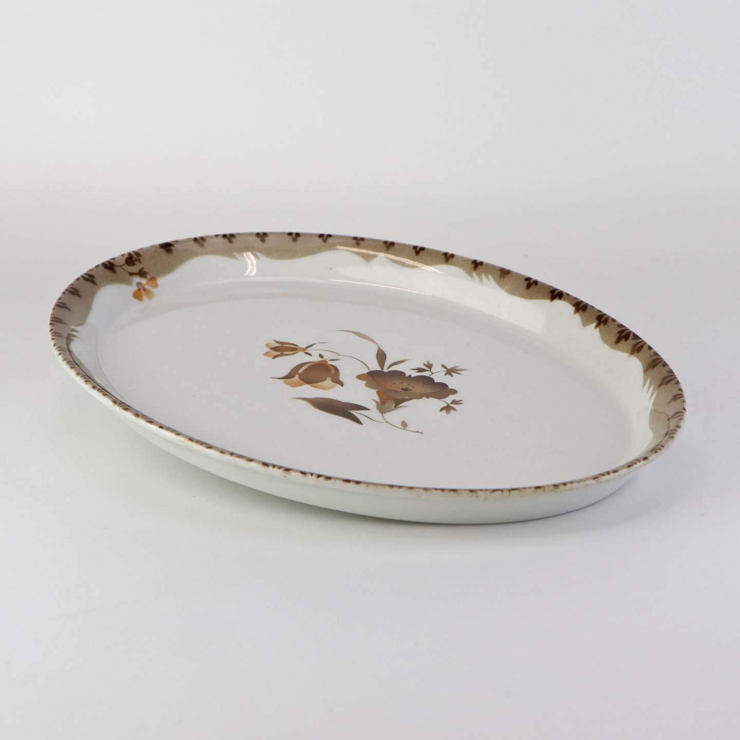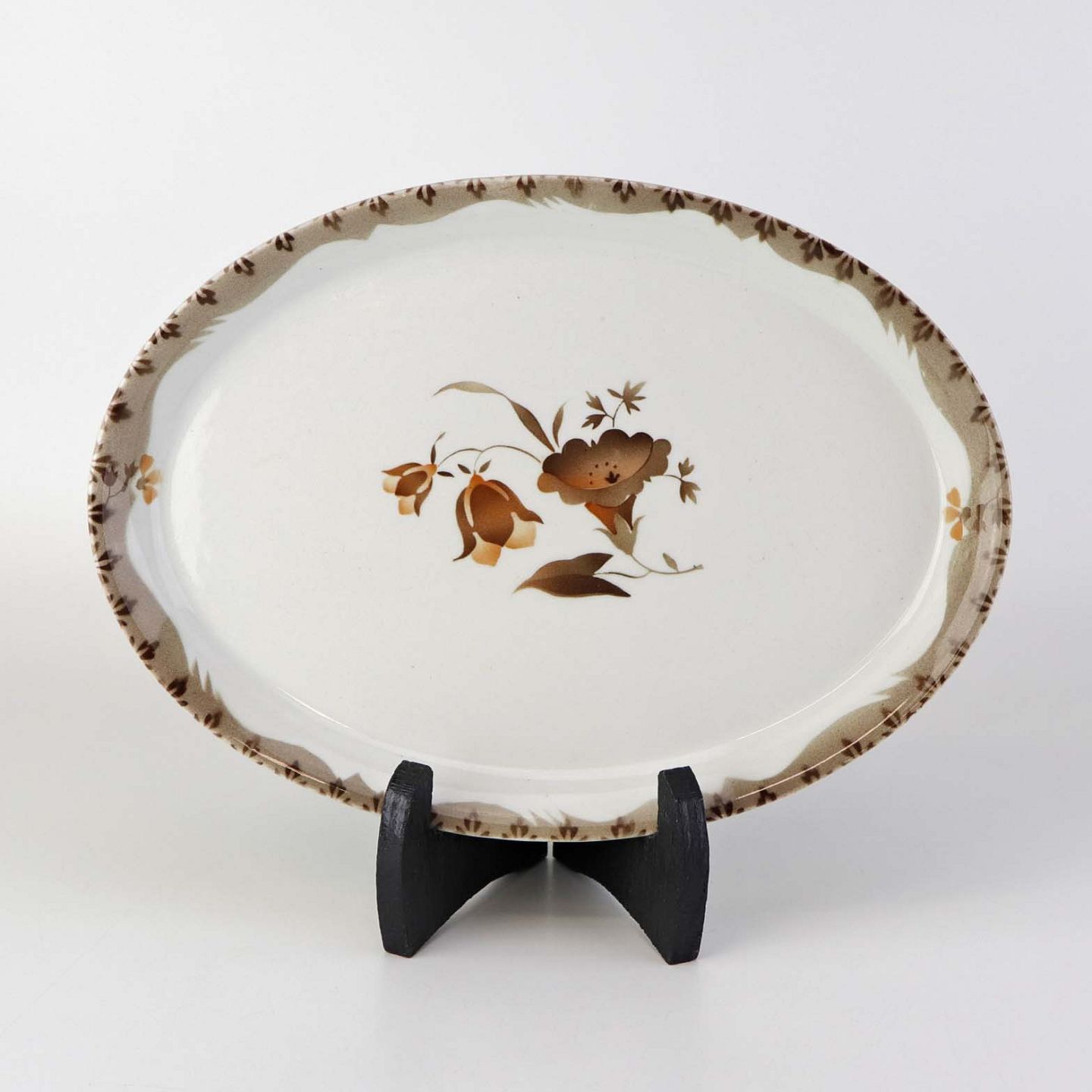 Stel i glat hvid fajance i stelform C med dekoration af brune snerleblomster og lysebrun kant med bladmotiv. Stellet blev produceret i perioden år 1930-1941