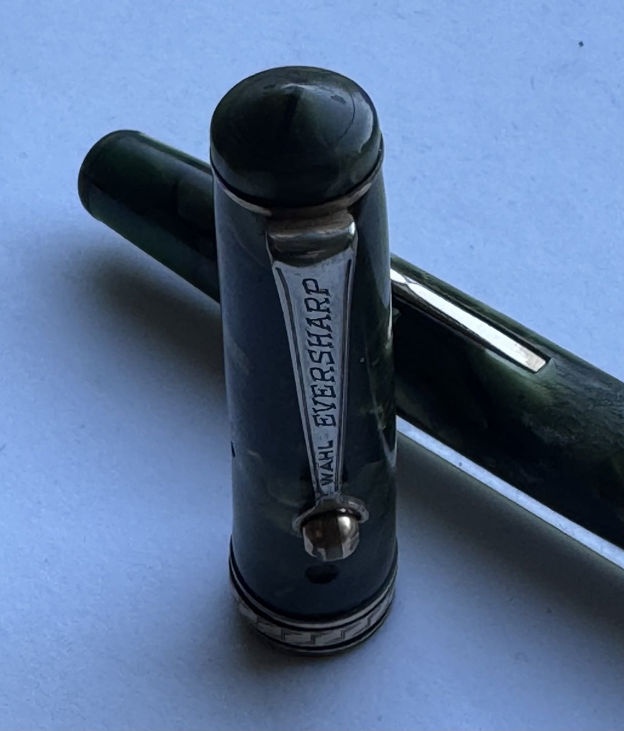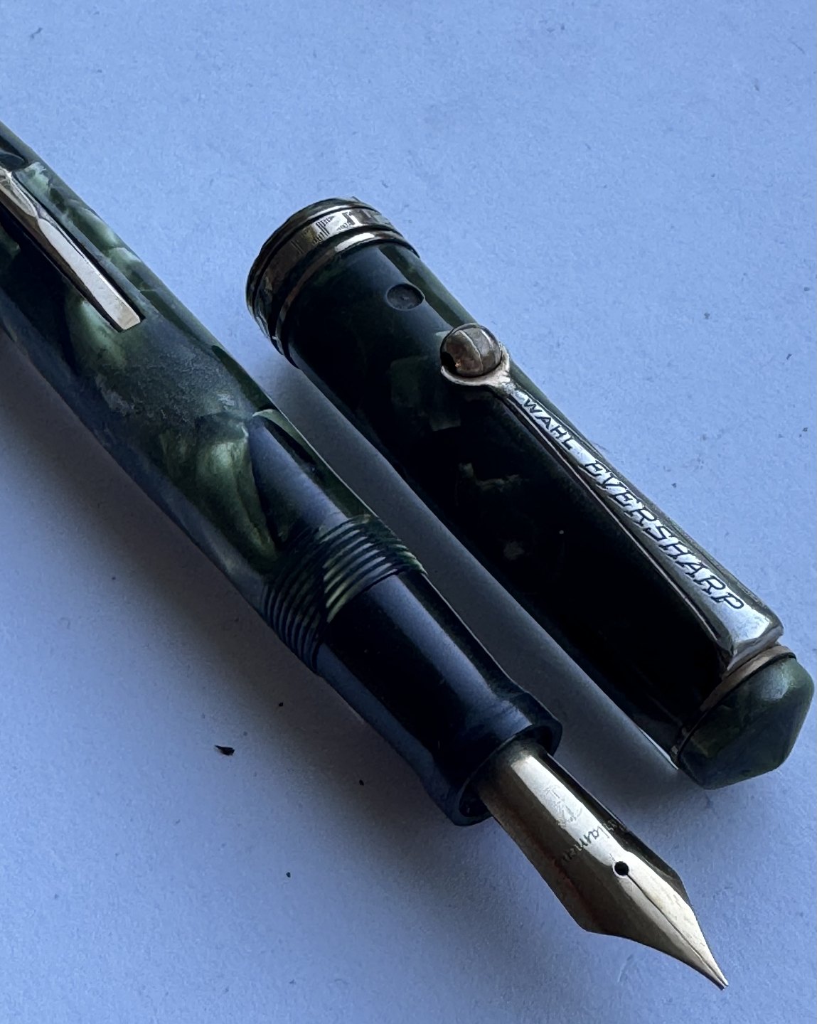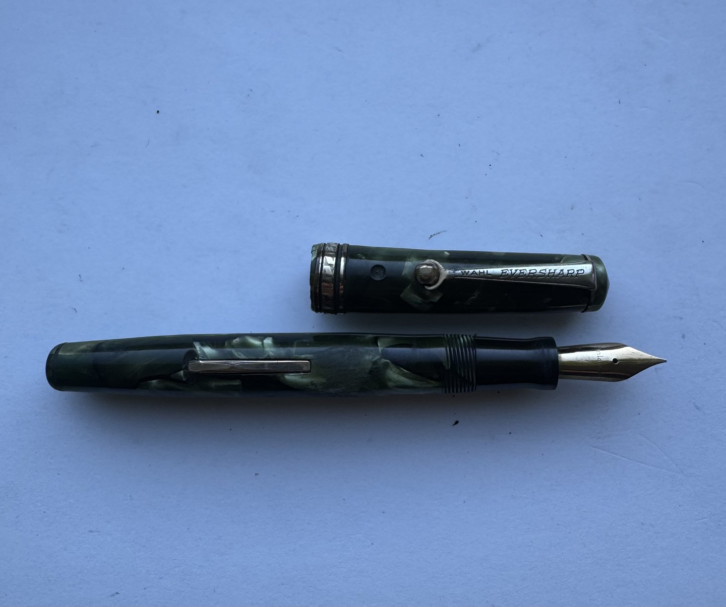 Grøn marmoreret Wahl Eversharp’en fyldepen med leverfiller. Fremstillet i U.S.A. i 1930’erne. Løst hættebælte. Spidsen er uoriginal til denne model. Ellers fremstår pennen i god stand uden skader eller reparationer. Fungerer dog ikke. Der skal isættes ny gummisæk før end den er funktionsdygtig igen. Ny gummisæk isættes mod en betaling på kr. 200,- Denne fyldepen er 12,7 cm