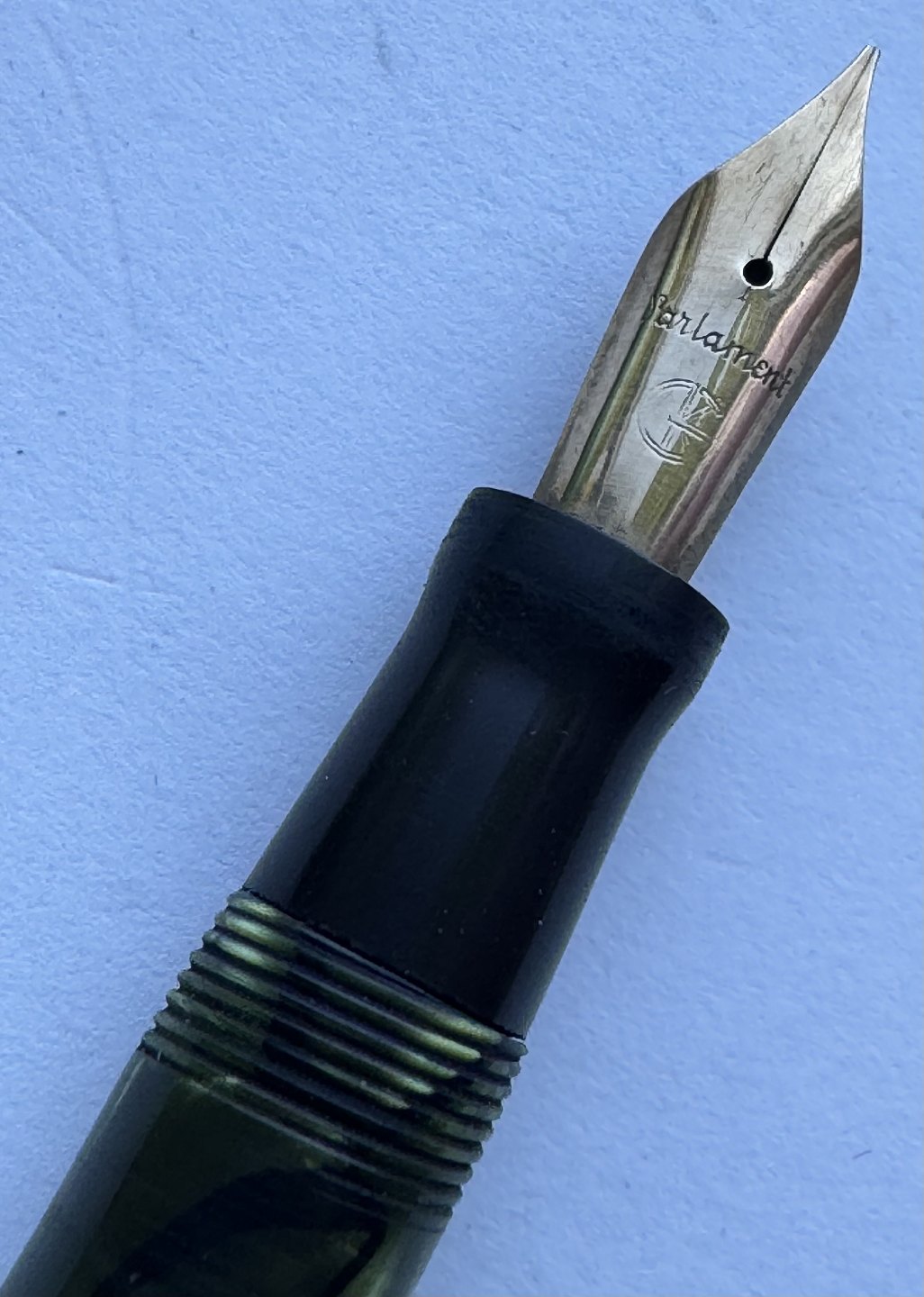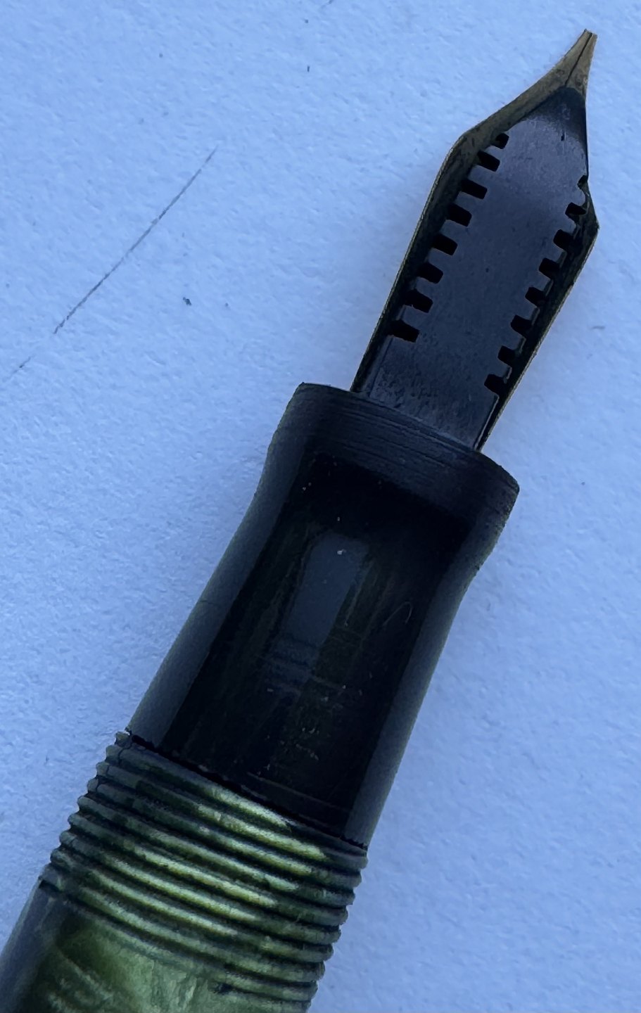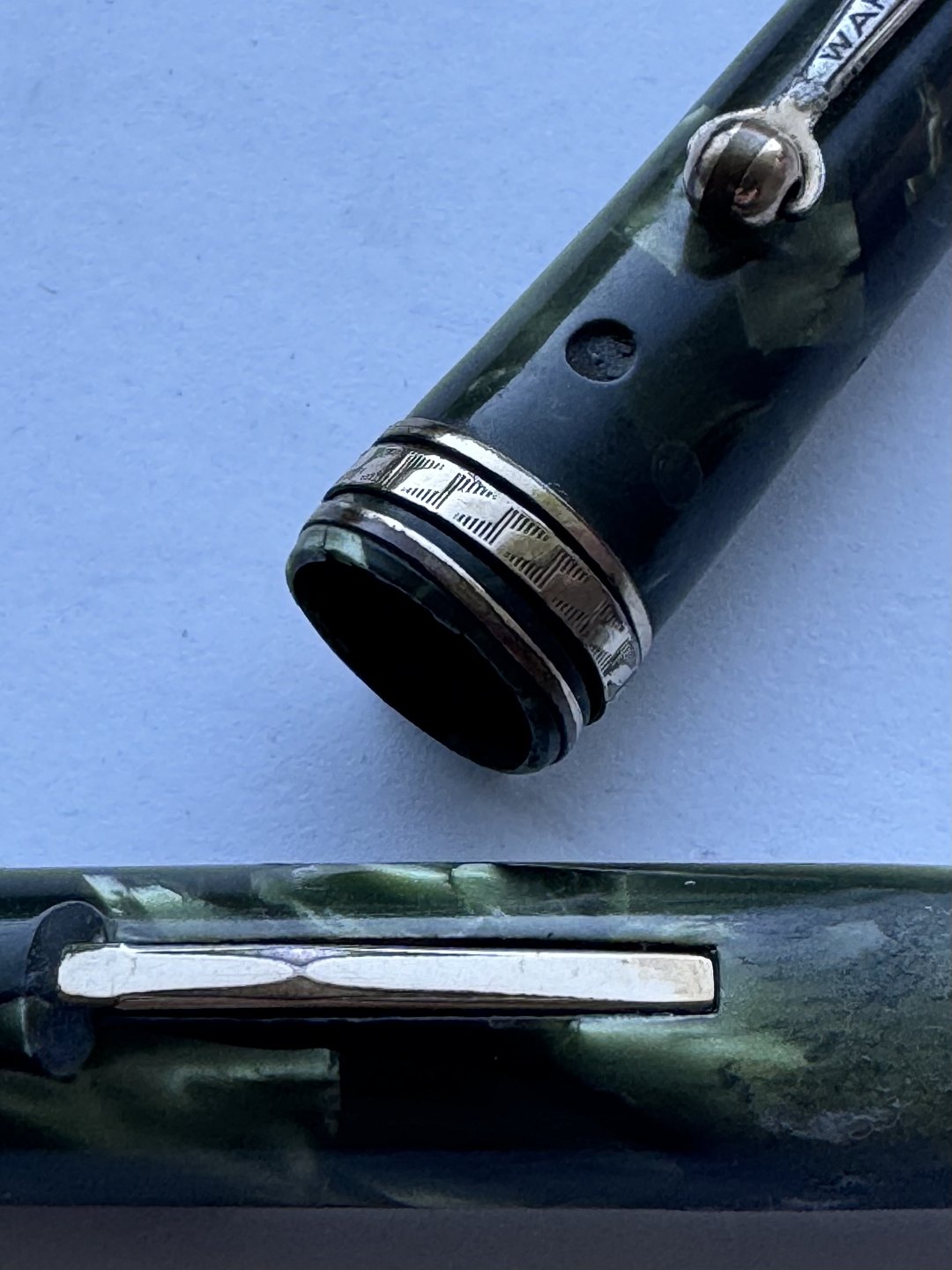 Grøn marmoreret Wahl Eversharp’en fyldepen med leverfiller. Fremstillet i U.S.A. i 1930’erne. Løst hættebælte. Spidsen er uoriginal til denne model. Ellers fremstår pennen i god stand uden skader eller reparationer. Fungerer dog ikke. Der skal isættes ny gummisæk før end den er funktionsdygtig igen. Ny gummisæk isættes mod en betaling på kr. 200,- Denne fyldepen er 12,7 cm