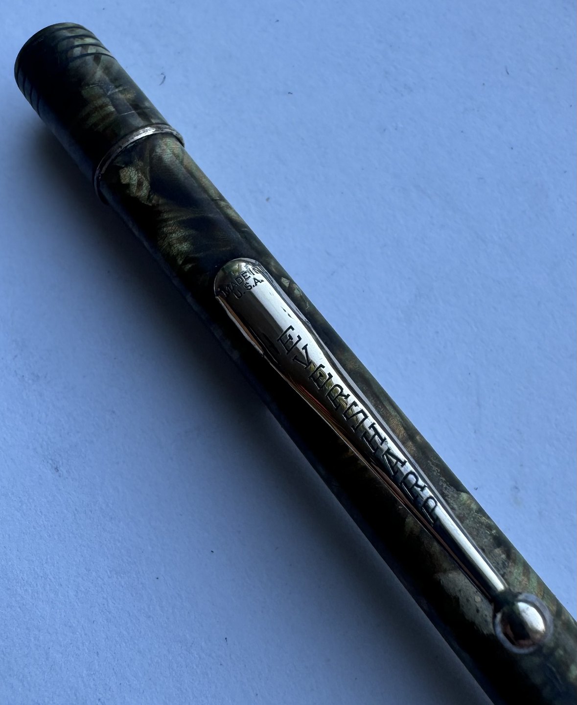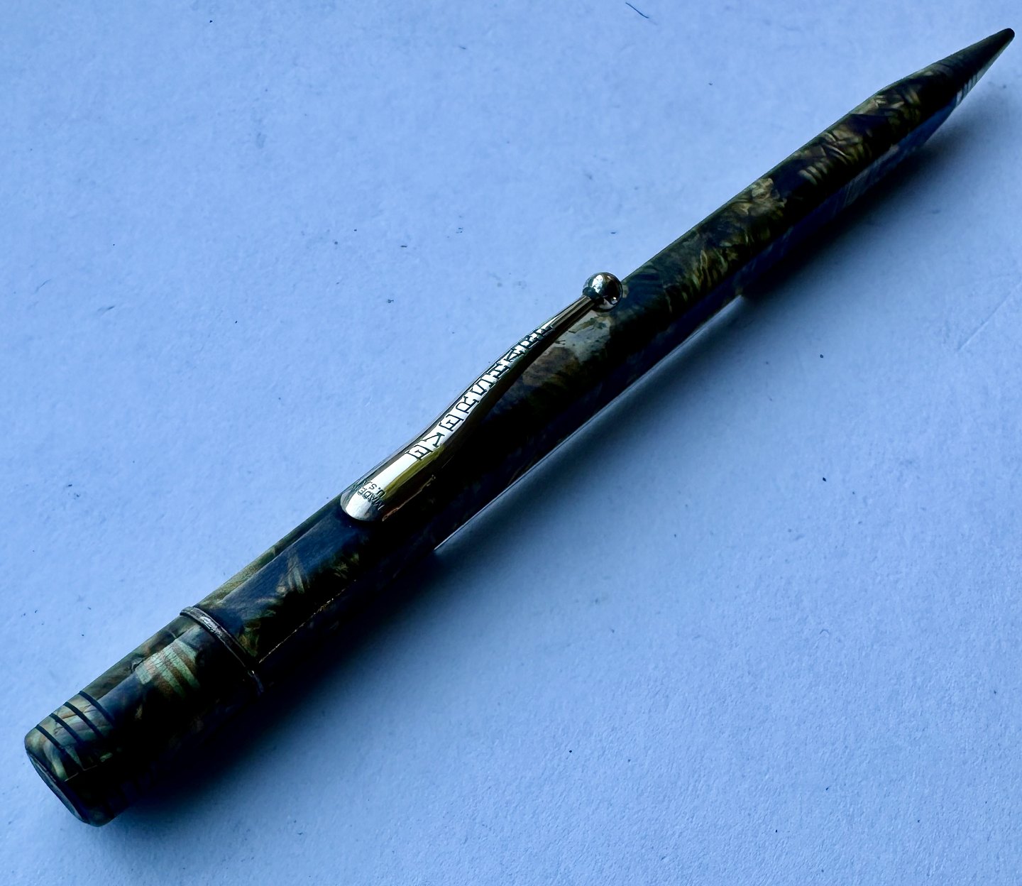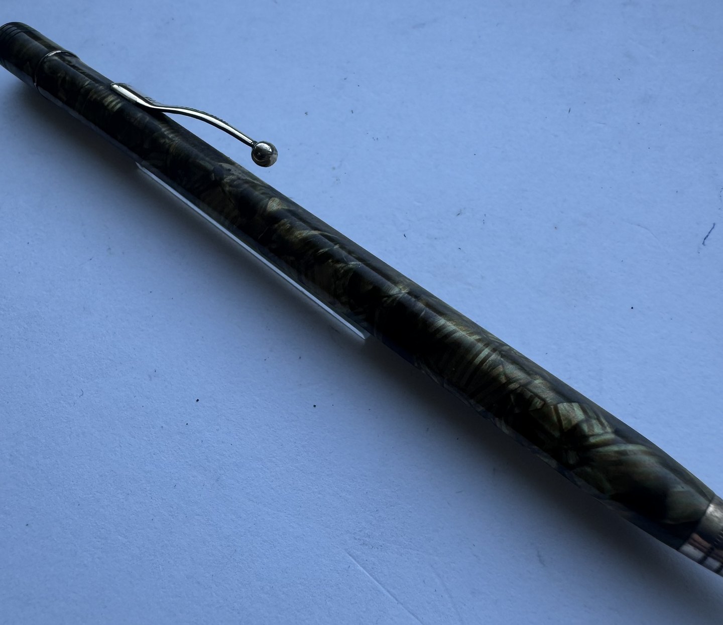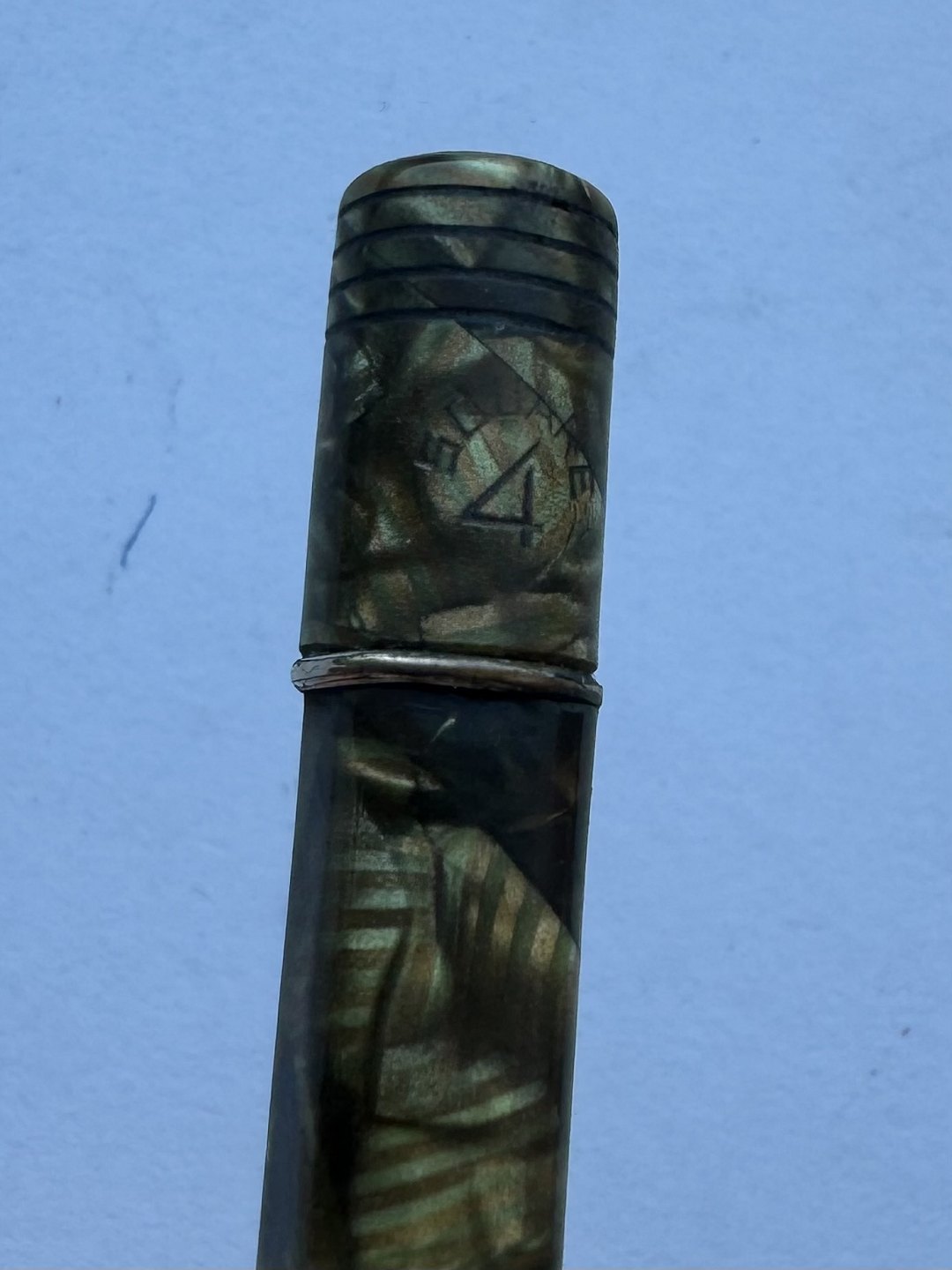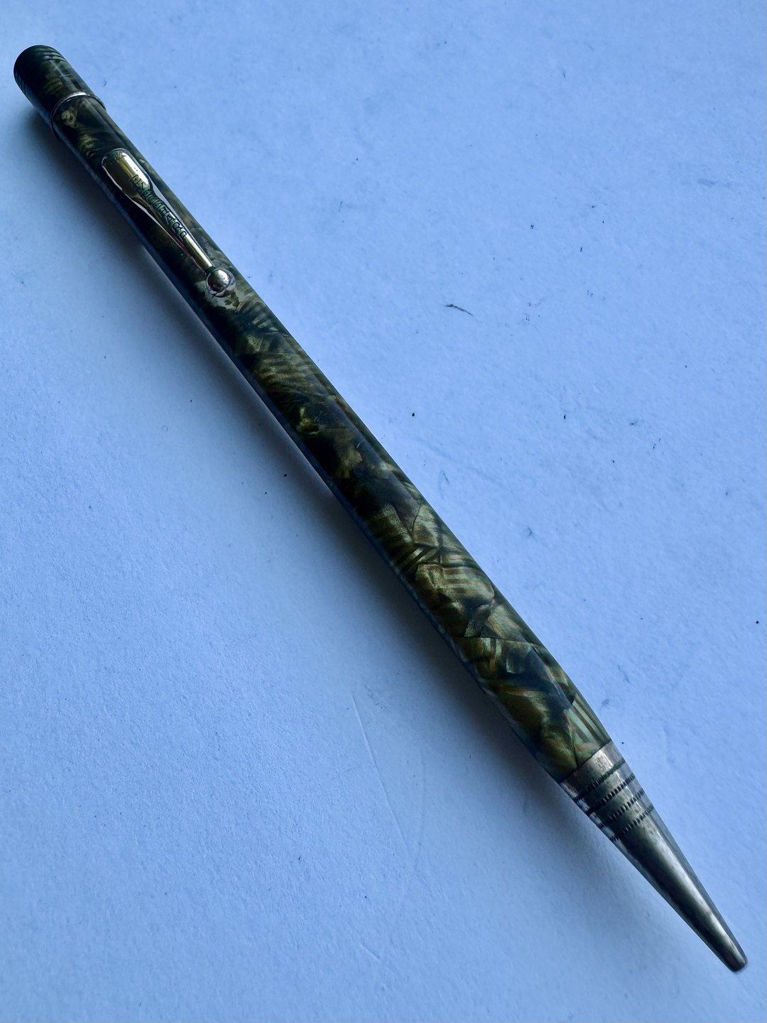 Lang slank fire-siddet “4 Square” grøn marmoreret Wahl Eversharp fra 1930’erne. Klar til at blive brugt. Ingen skader eller reparationer. Mål: 15,2 cm lang.