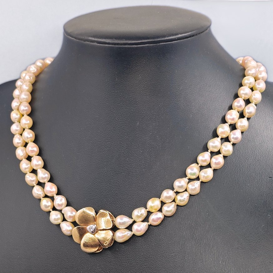 Text zugänglich auf Dänische: Ole Lynggaard, Charlotte Lynggaard; Blomsterlås af 14 kt. guld med brillant, inklusiv perlekæde
