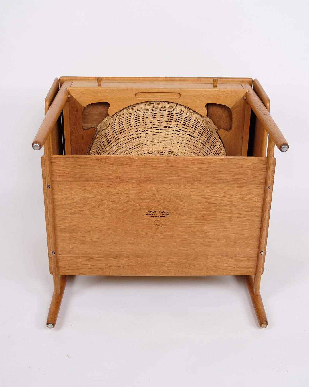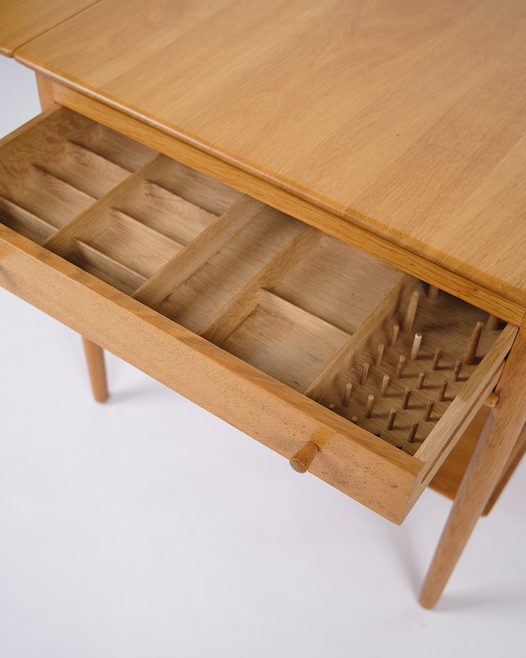 Sybord, model AT-33, designet af Hans J. Wegner og produceret af Andreas Tuck i 1950’erne. Bordet er udført i sæbebehandlet egetræ og indrettet med en praktisk hylde. Bordpladen kan udvides fra 64,5 cm til 118,5 cm, hvilket gør det både fleksibelt og funktionelt.