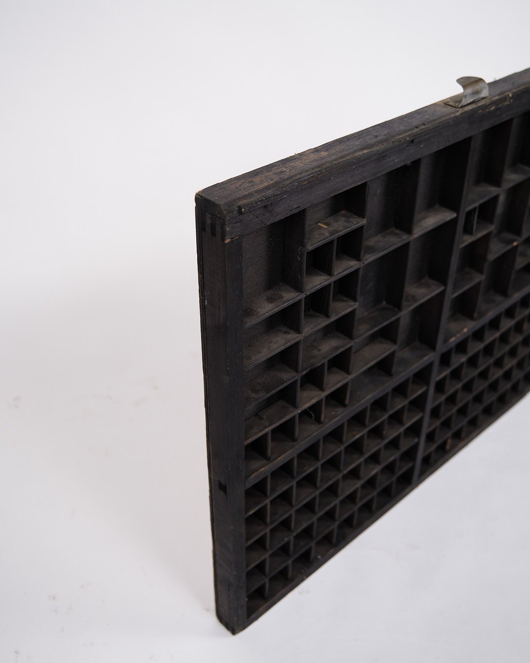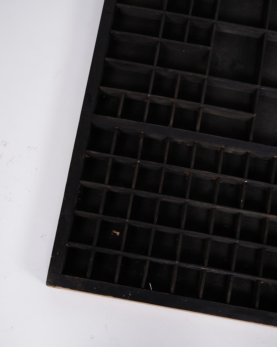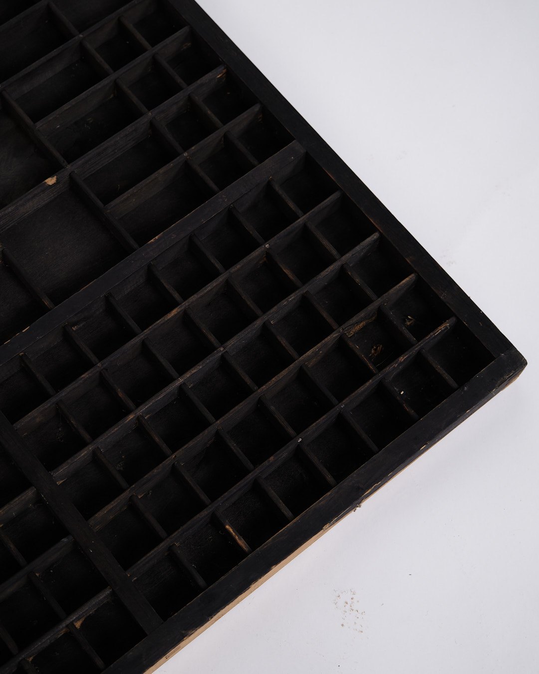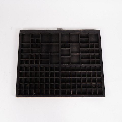 Gammel væghængt sættekasse fra 1930’erne. Sort bemalet træ med små rum.
