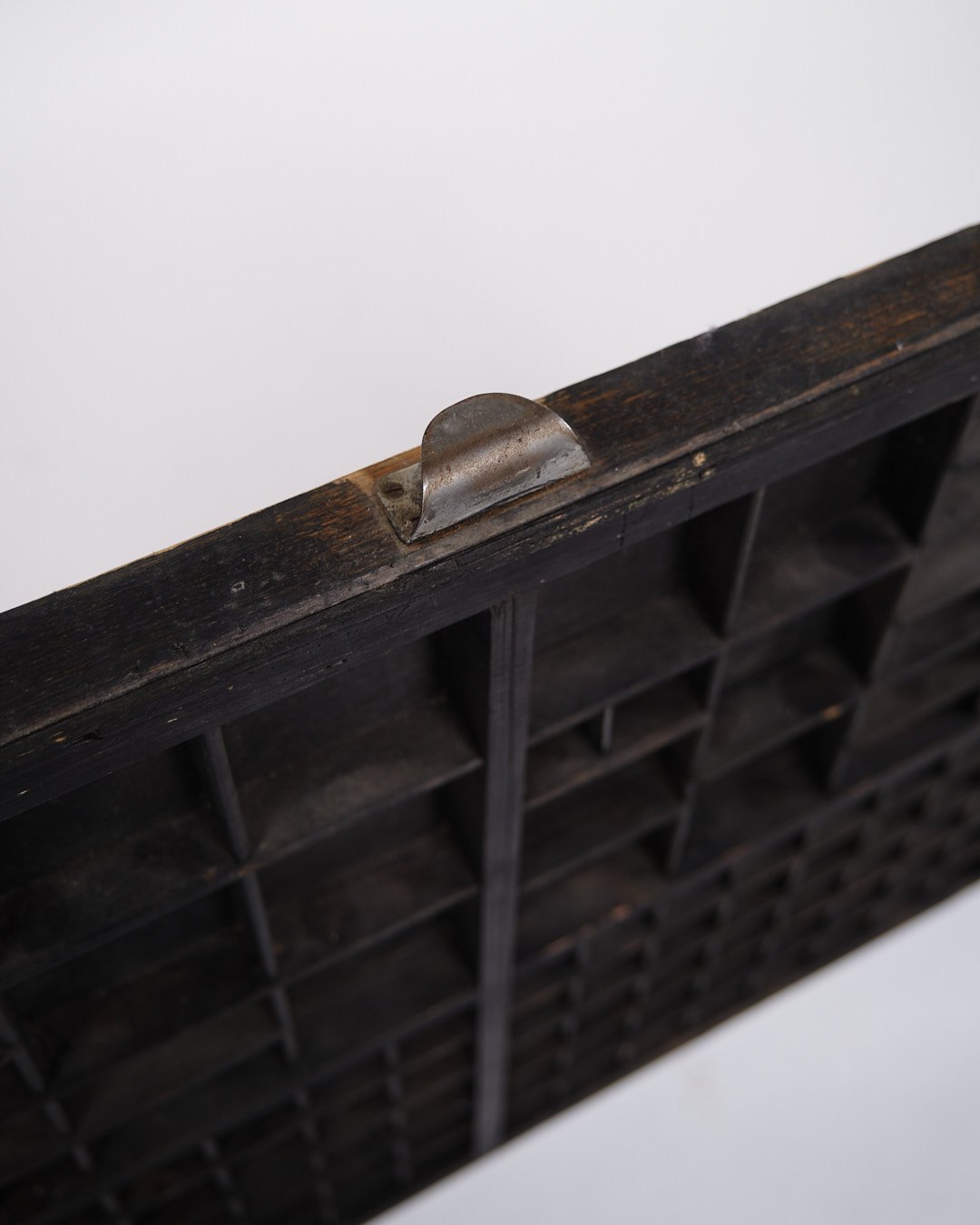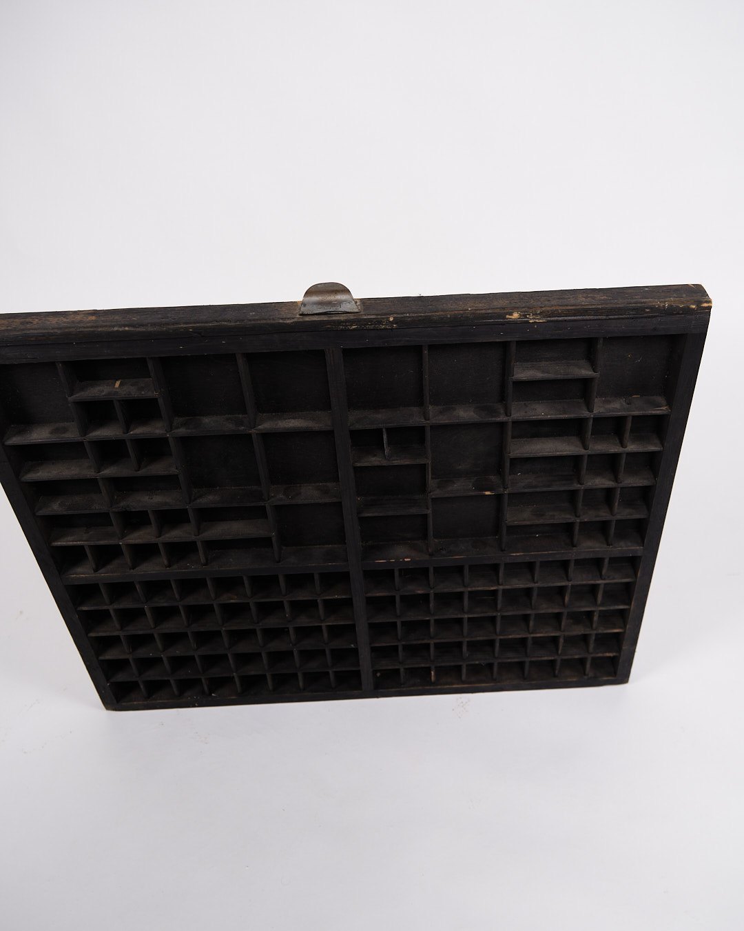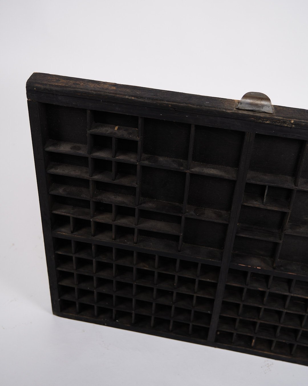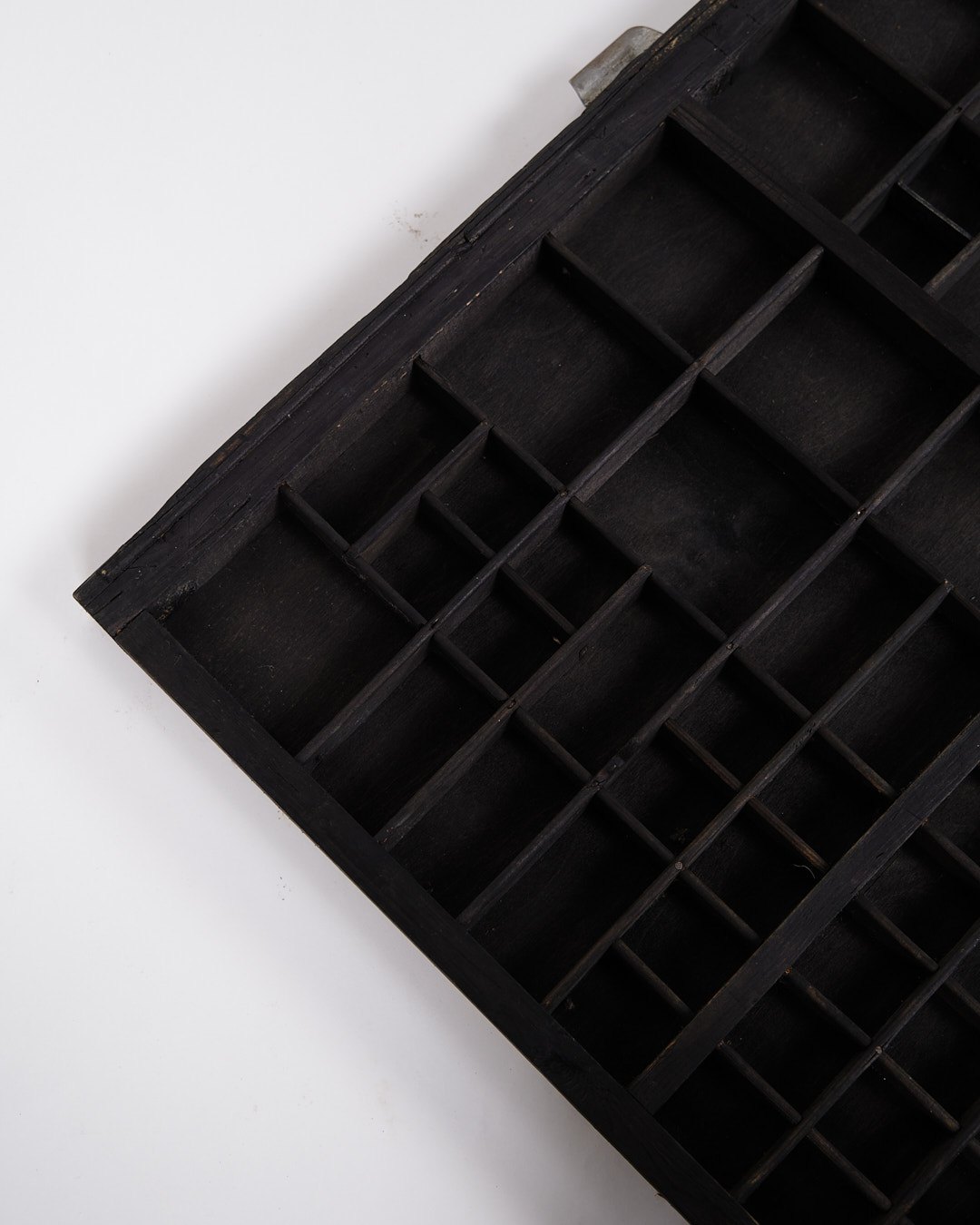 Gammel væghængt sættekasse fra 1930’erne. Sort bemalet træ med små rum.