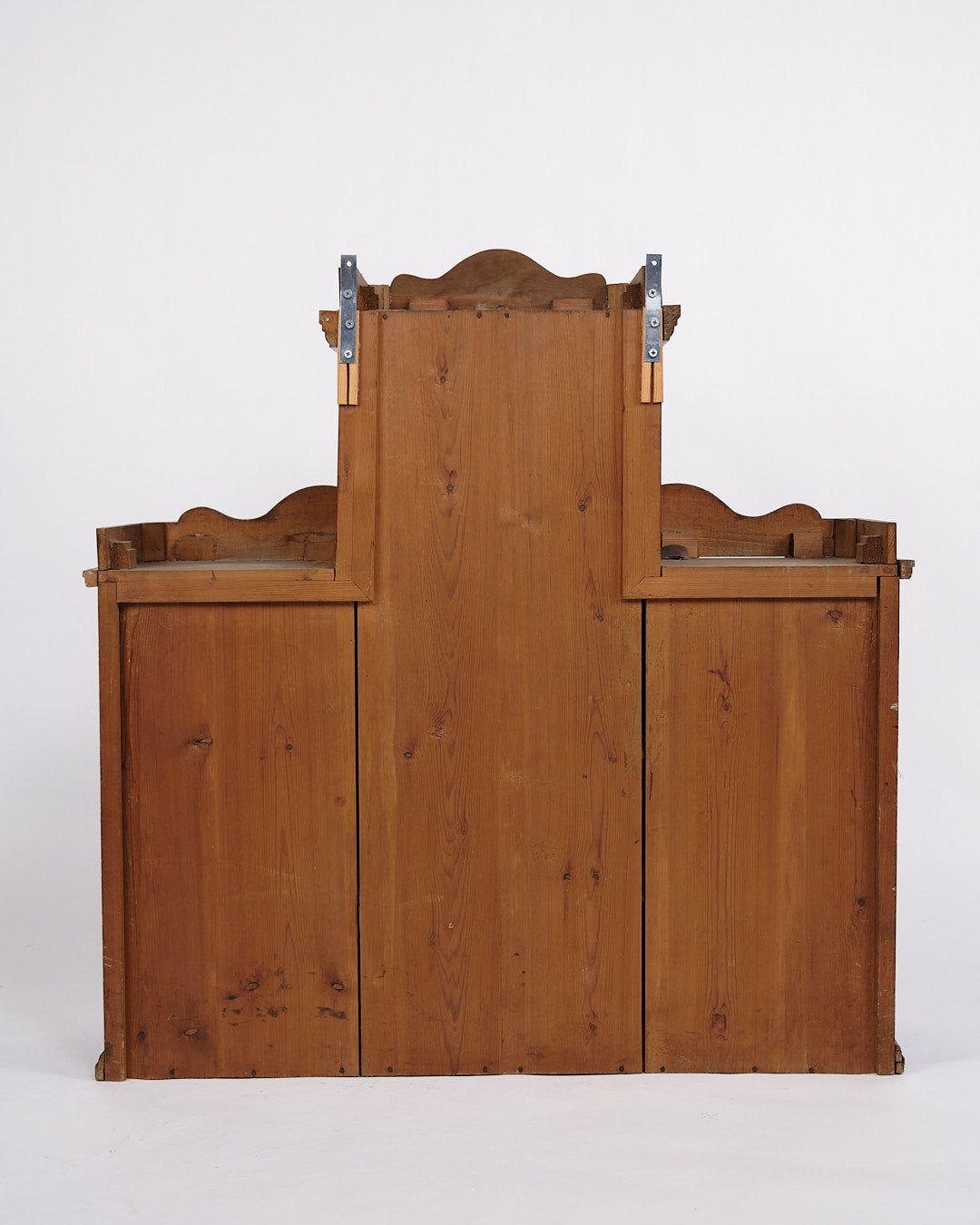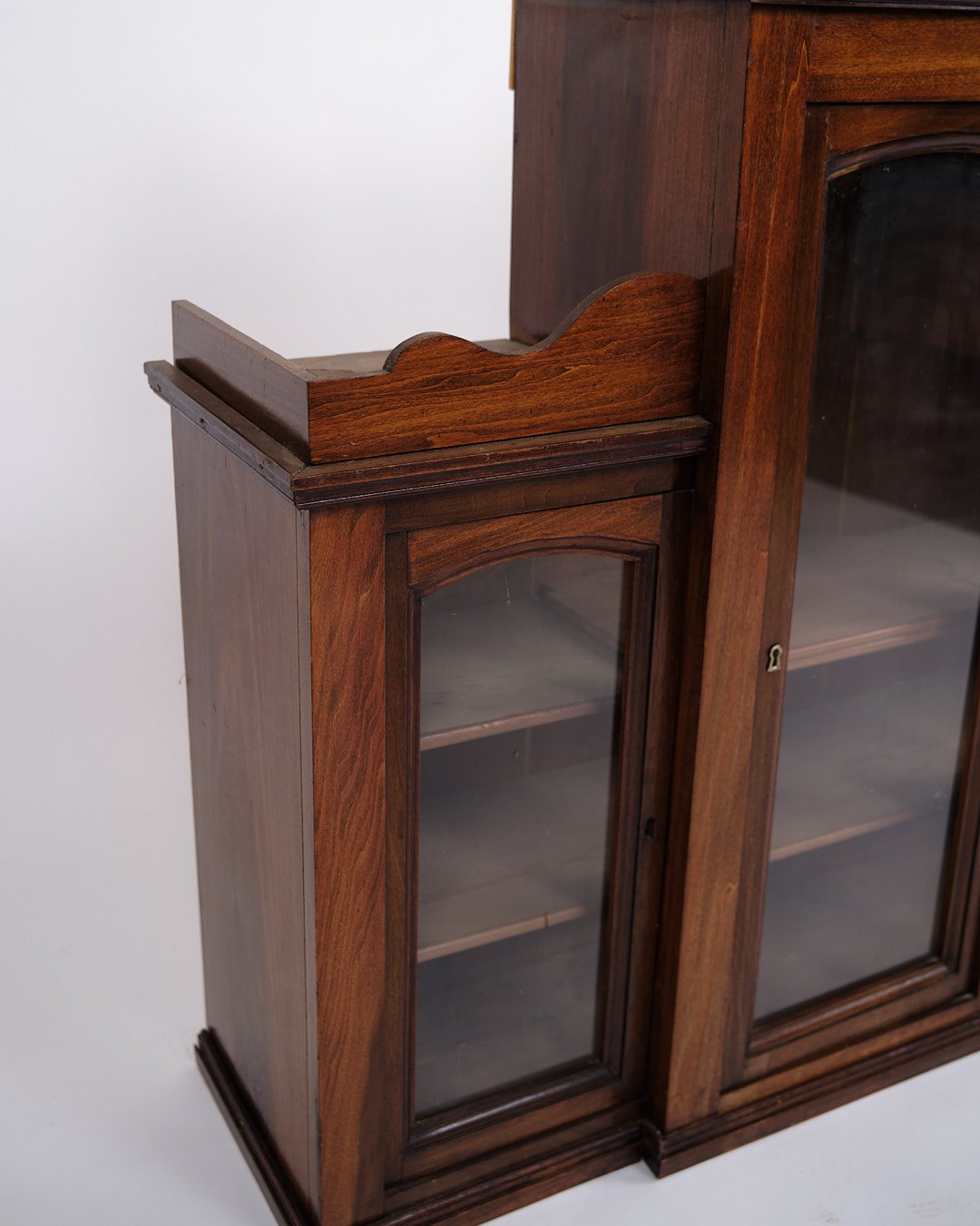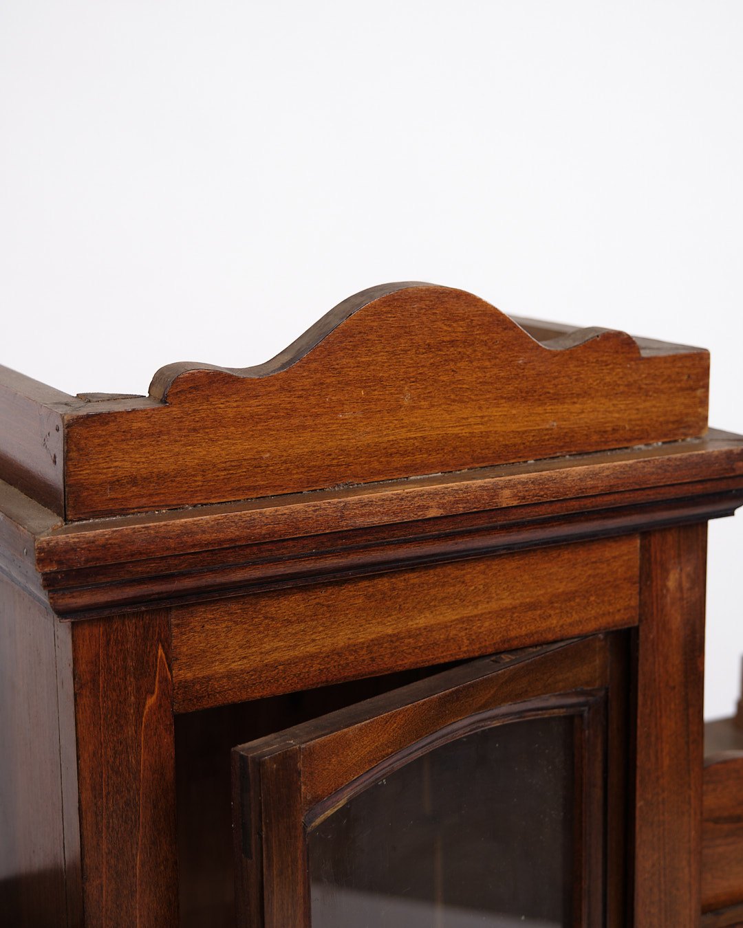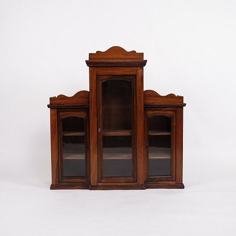 Text zugänglich auf Dänische: væghængt vitrineskab fra 1890’erne, udført i håndpoleret mahogni. Skabet har klassiske proportioner og fremstår med et tidstypisk design fra slutningen af 1800-tallet, hvor funktionalitet og dekorativt udtryk gik hånd i hånd.