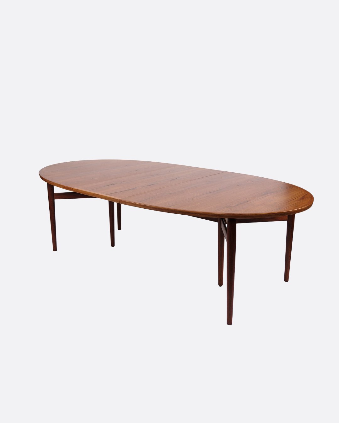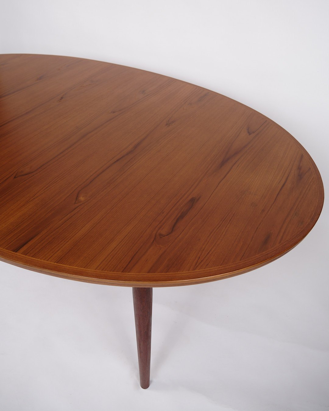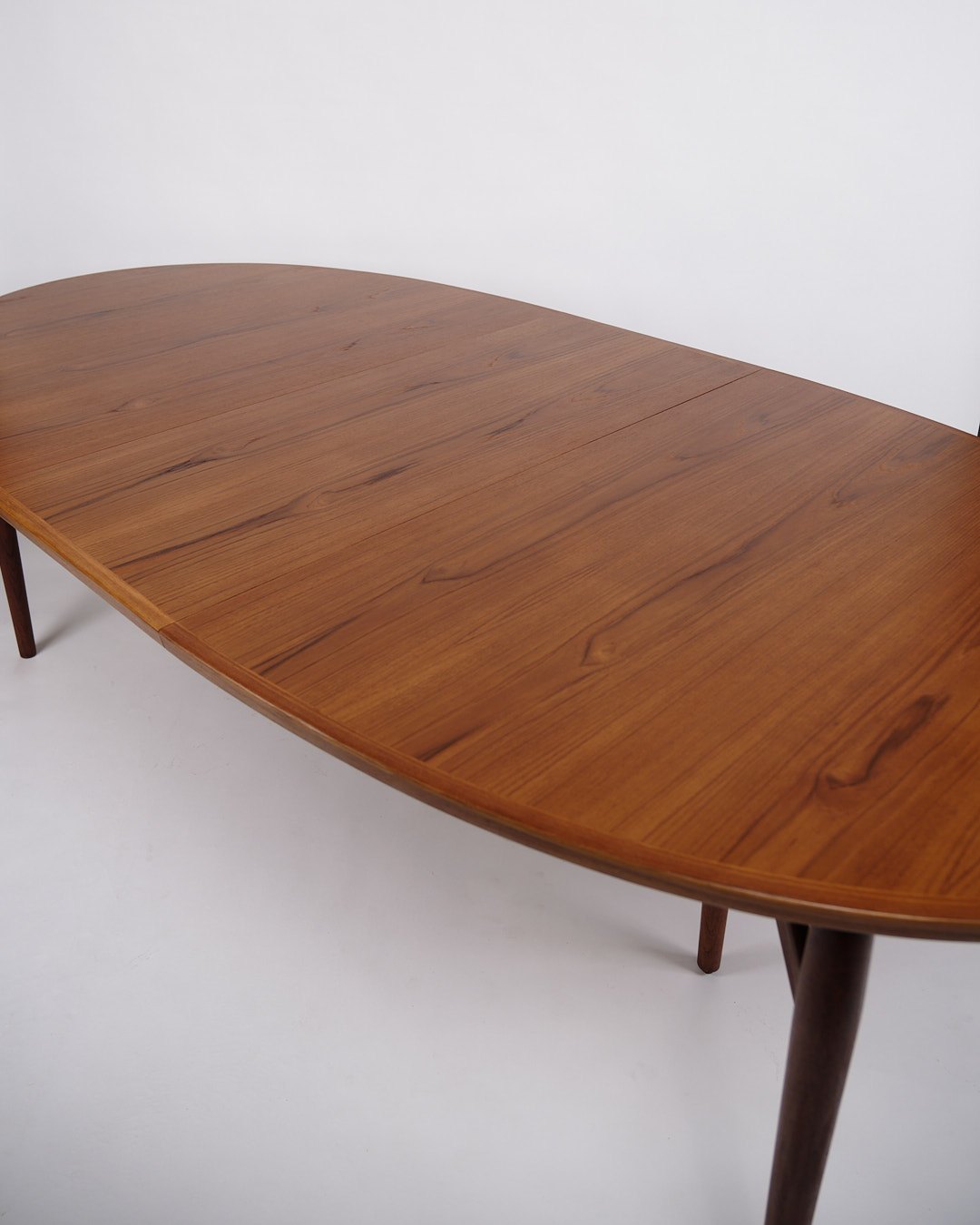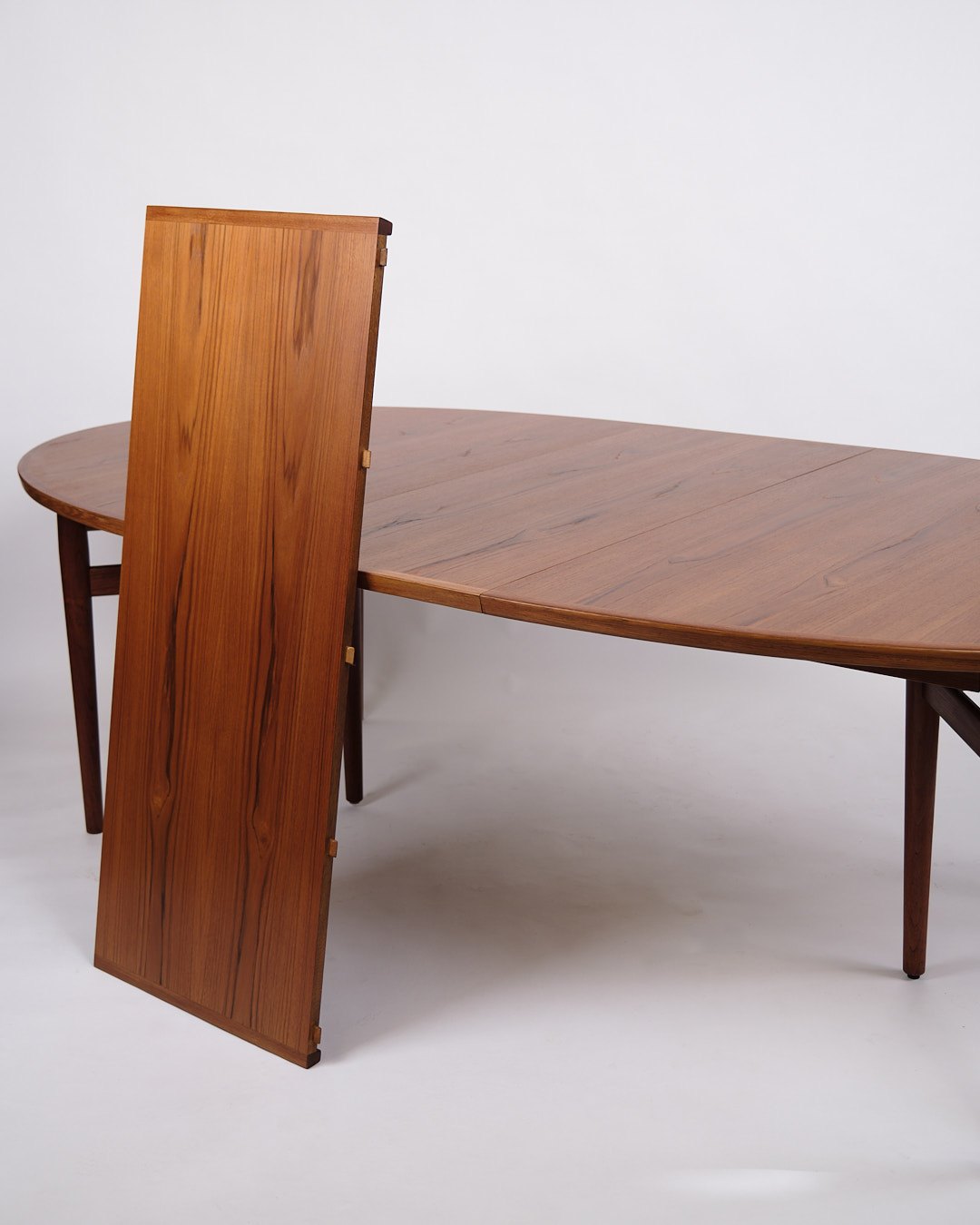 Text zugänglich auf Dänische: Stort ovalt spisebord designet af Arne Vodder og produceret af Sibast Møbelfabrik i 1960’erne. Bordet er udført i teaktræ og der lavet 2 tillægsplader á 50cm som følger med til bordet.