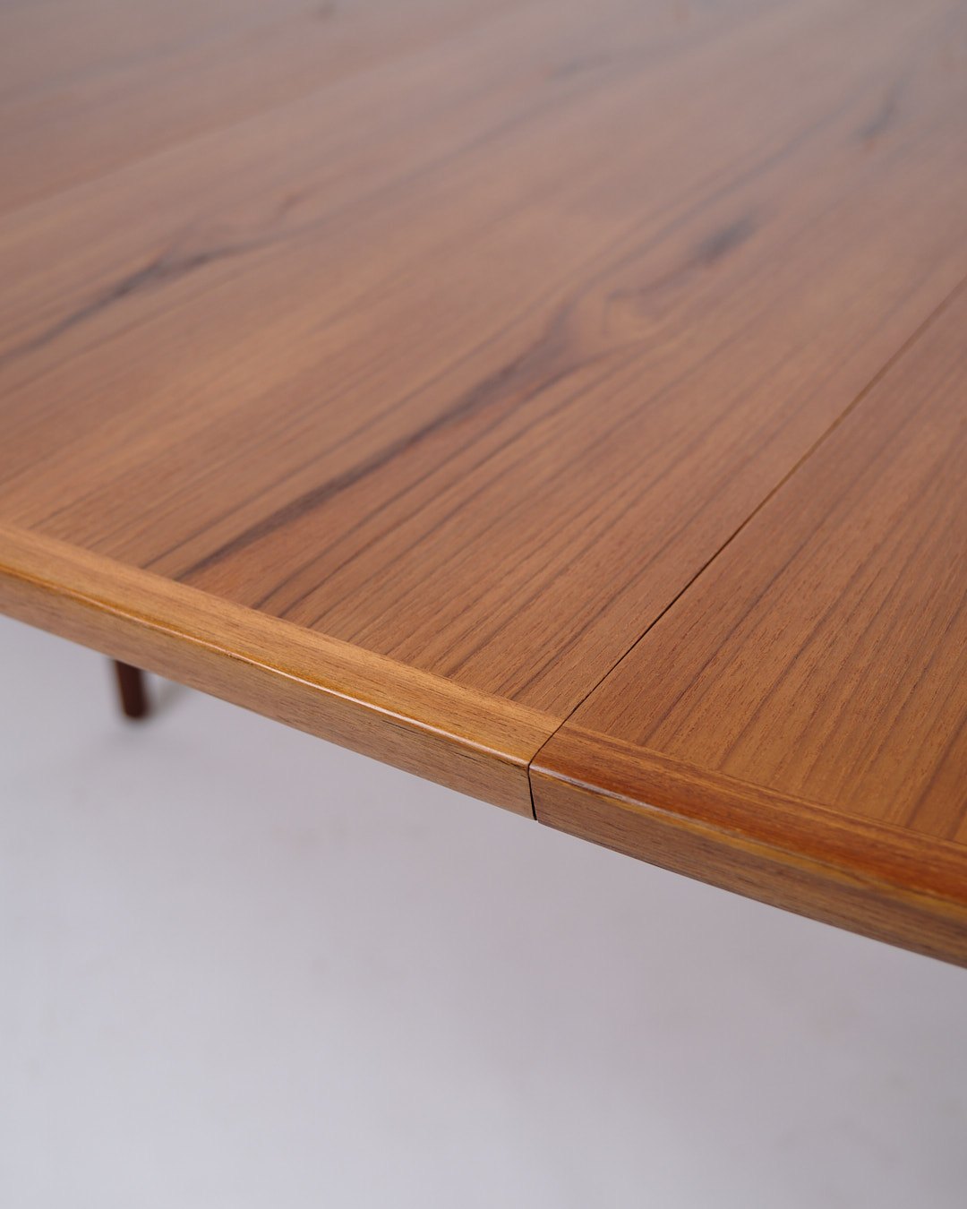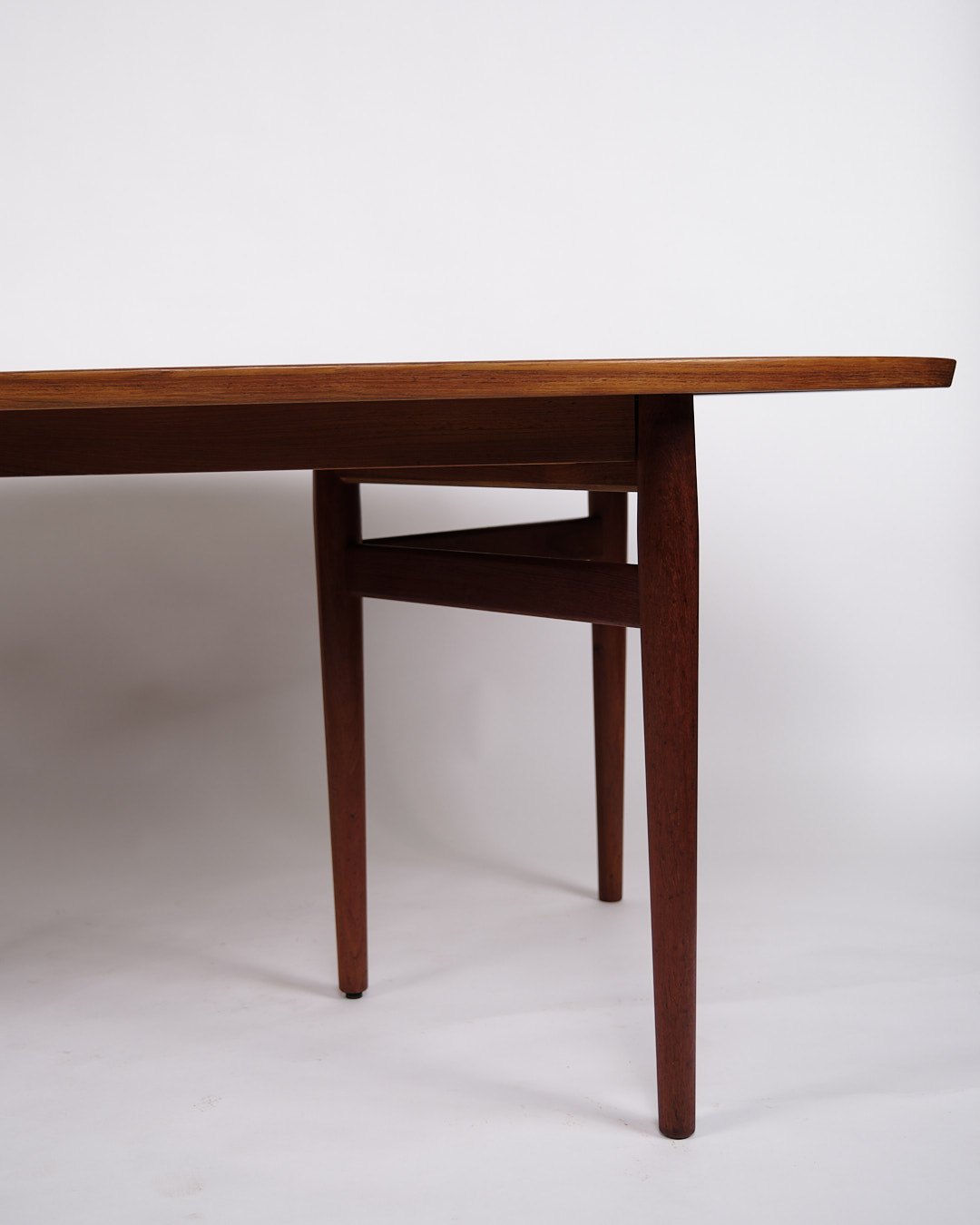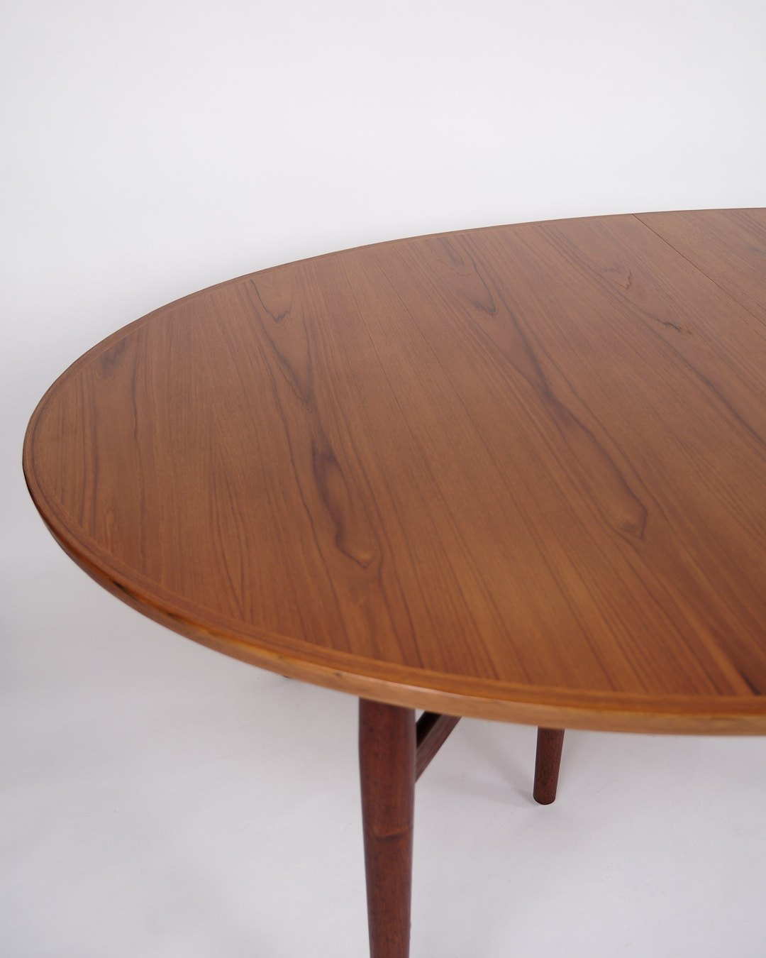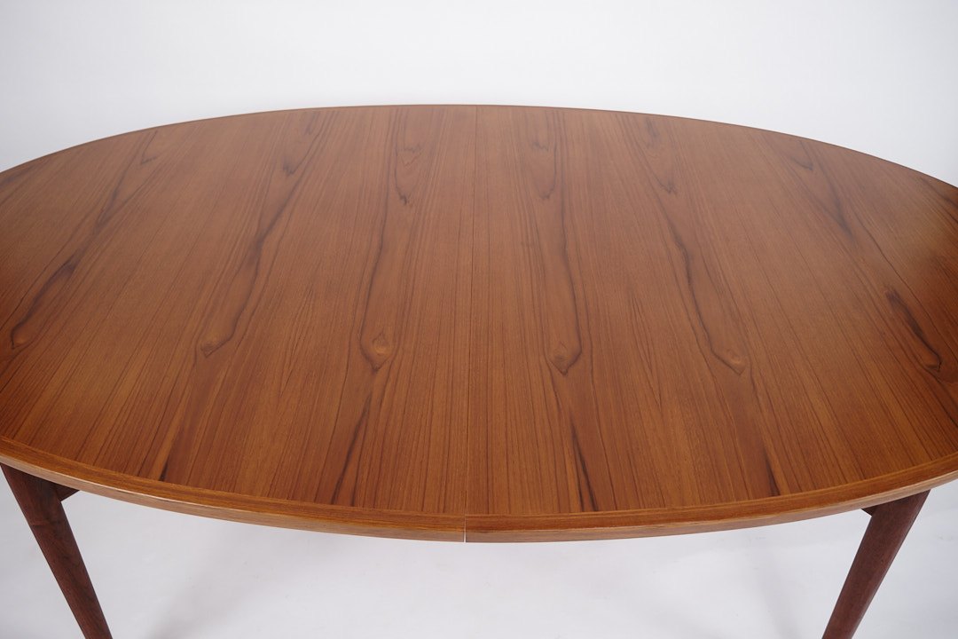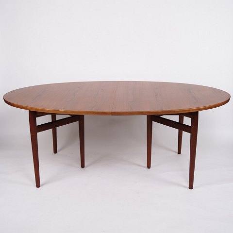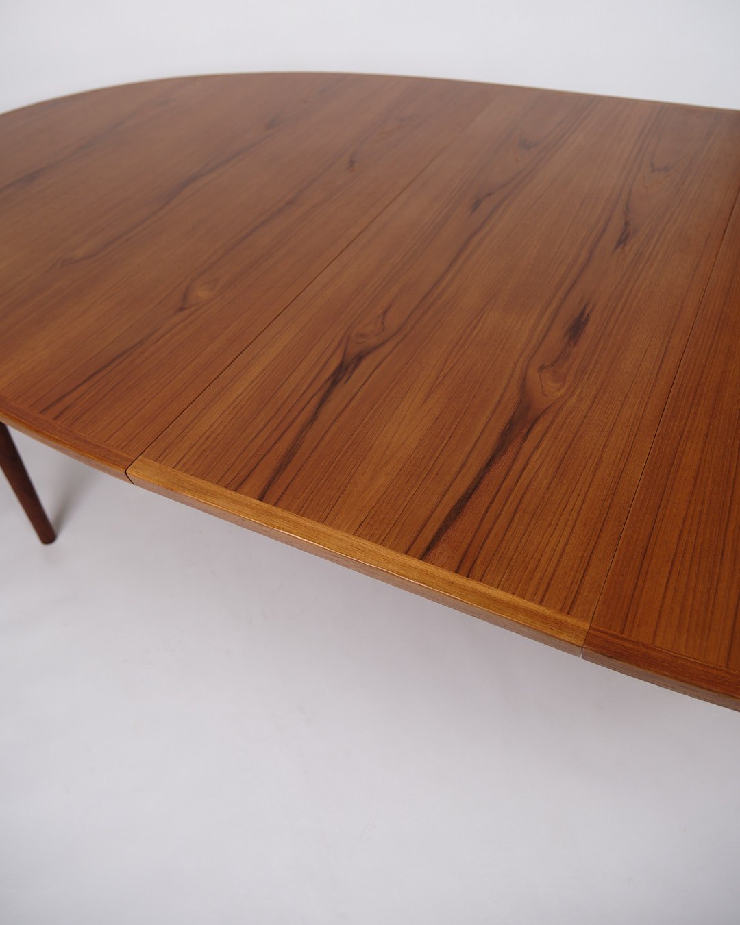 Text zugänglich auf Dänische: Stort ovalt spisebord designet af Arne Vodder og produceret af Sibast Møbelfabrik i 1960’erne. Bordet er udført i teaktræ og der lavet 2 tillægsplader á 50cm som følger med til bordet.