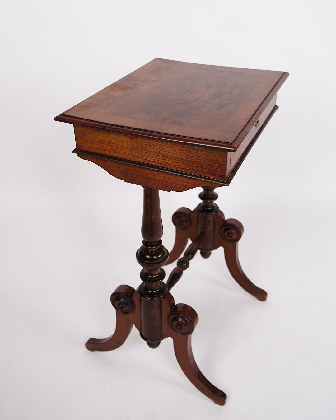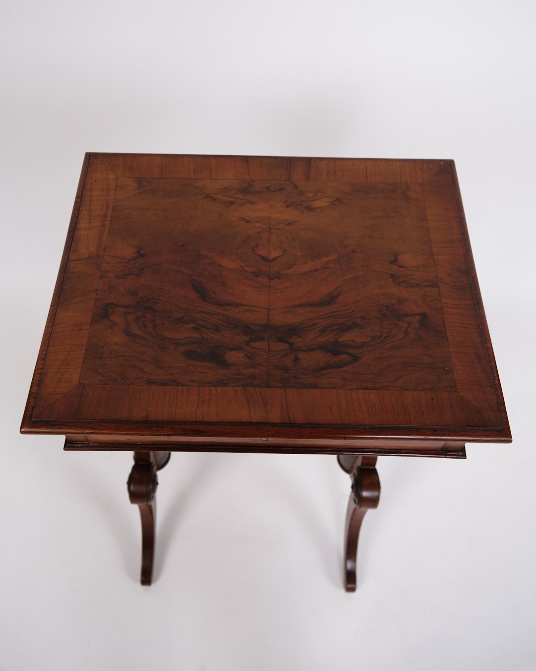 Text zugänglich auf Dänische: Antikt sidebord i håndpoleret mahogni fra 1880’erne. Med skuffe og drejede ben.