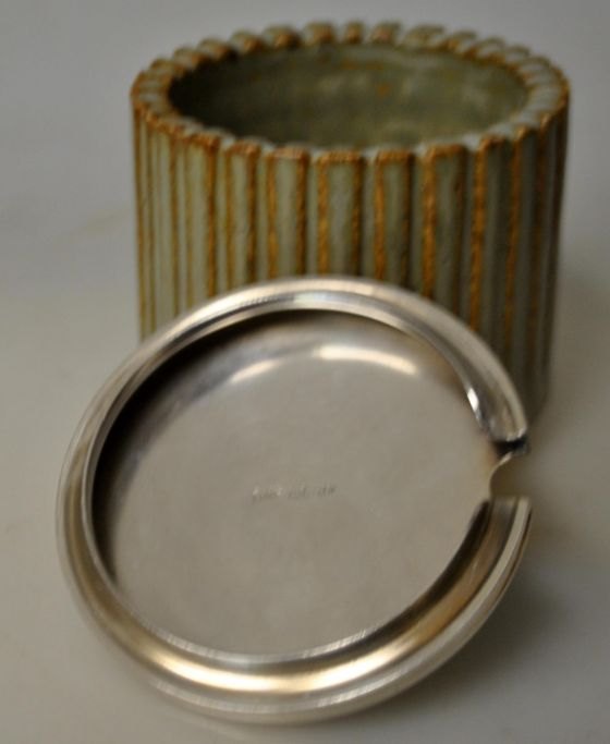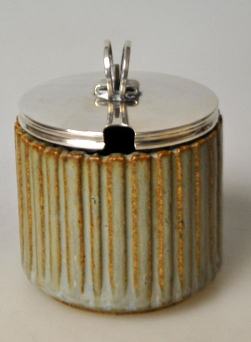 Bang, Arne (1901 - 1983) Dänemark: Geriffeltes Marmeladen topf aus Steingut Nr. 128. Graugrüne Glasur. Mit versilbertem Deckel, Hugo Grün, Kopenhagen. Signiertes Monogramm. Deckel bezeichnet: H. Gr. für Hugo Grün. H: 8,5 cm.