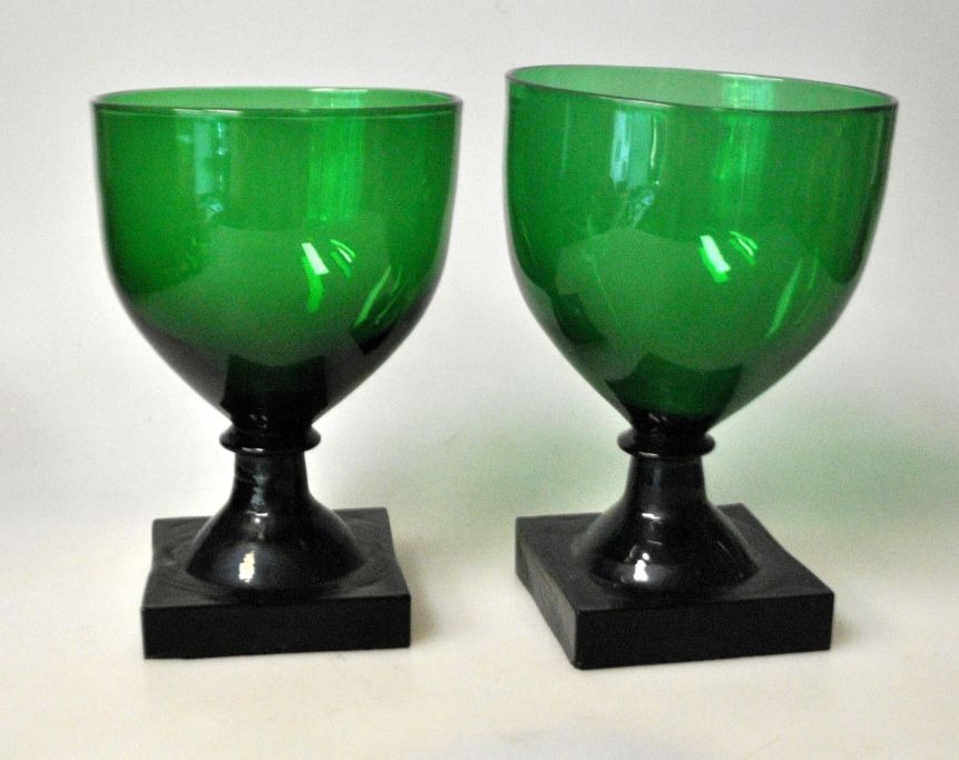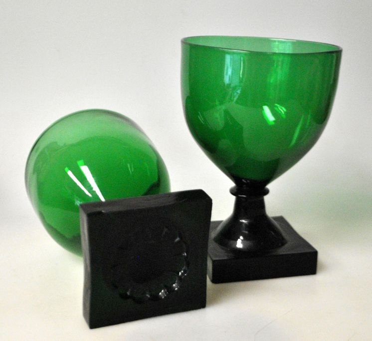 Weinglas „Gorm der Alte“, 19. Jahrhundert. Ganz aus grünem Glas. Quadratischer, gepresster Fuß mit Muster unter dem Boden und Kugelschliff. Höhe: 13 cm.