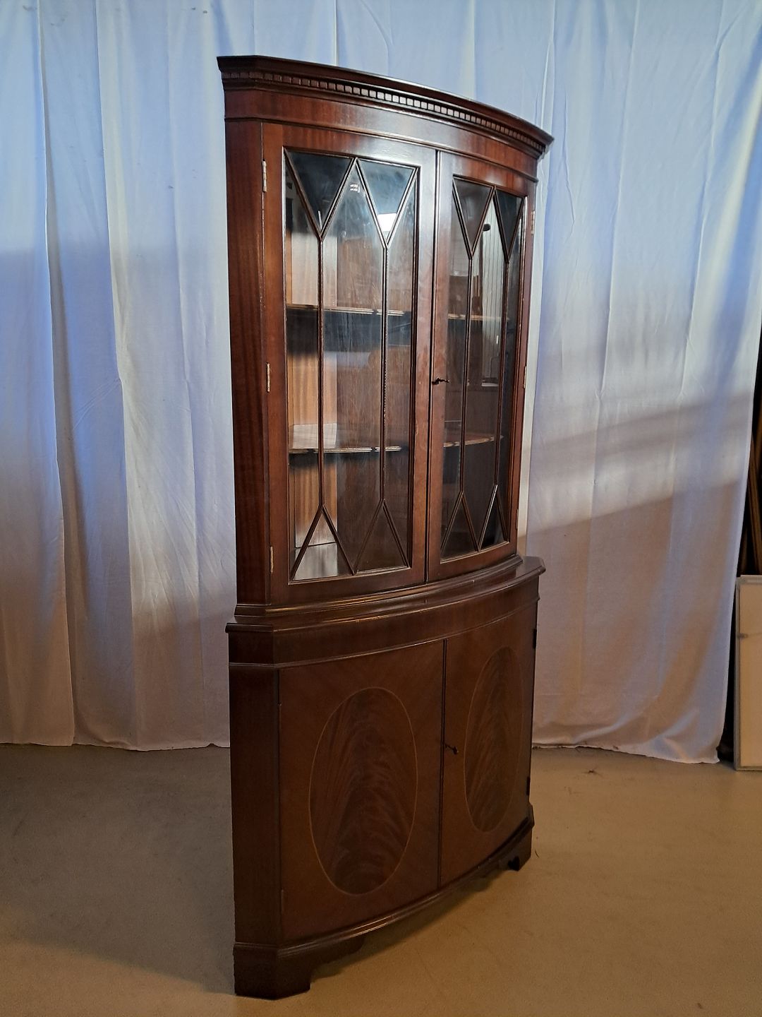 Hjørneskab i fineret mahogni, fra 1980erne.