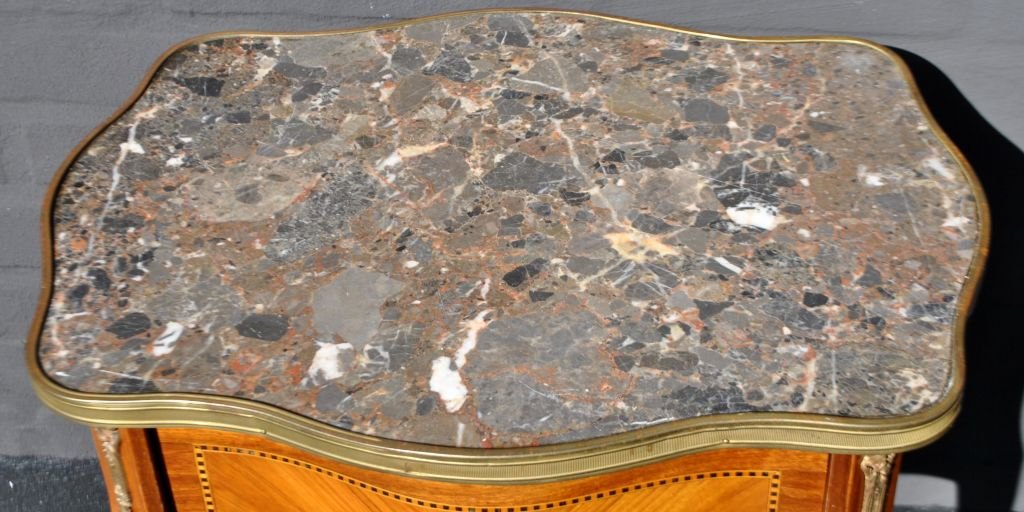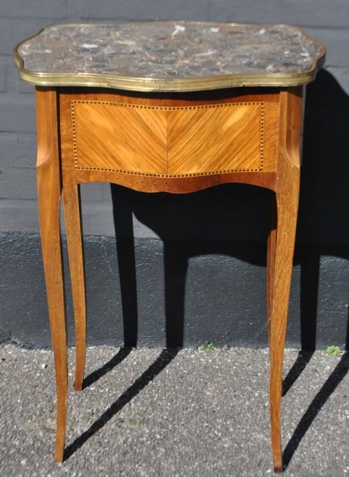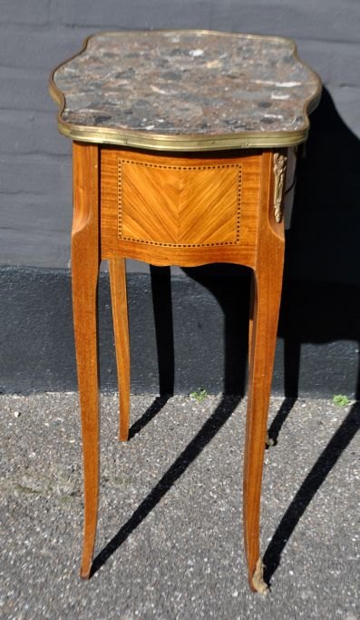 Französischer Lampentisch, 20. Jahrhundert. Mit Intarsien. Mit Messingkante und bunter Marmorplatte. Mit Bronzeschuh. H: 69 cm. B: 47 cm. T: 36 cm.