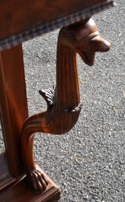 Konsole aus Mahagoni, spät Empire, ca. 1840. Dänemark. Mit Säulen in Form von Greifen mit Löwenfüßen. Rückseite mit Spiegel. H.: 87 cm. B.: 71 cm. T.: 36 cm.