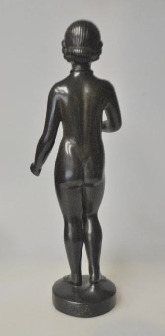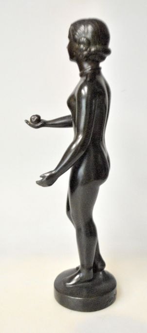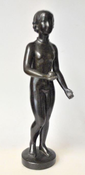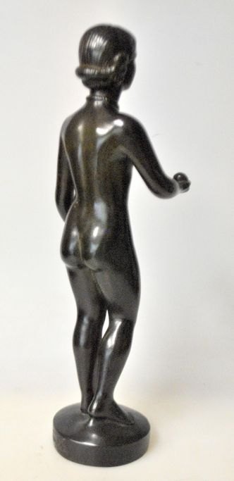 Andersen, Just (1884 - 1943) Dänemark: Figur, Ydun. Nr. D 2307. Patiniertes Disco-Metall. Signiert. H: 29 cm. Erstmals produziert 1942. Der nordischen Mythologie zufolge war sie die Göttin der ewigen Jugend und Hüterin der verjüngenden goldenen Äpfel. Perfekter Zustand!