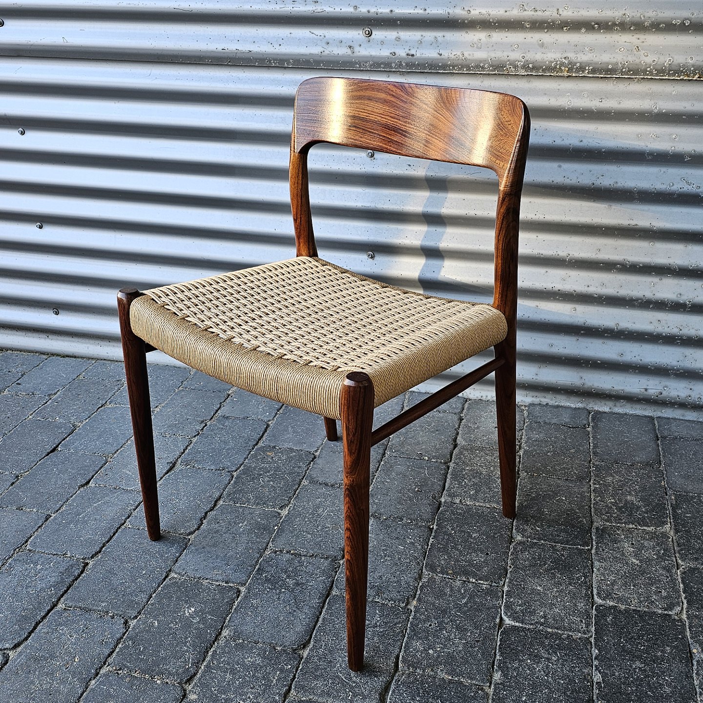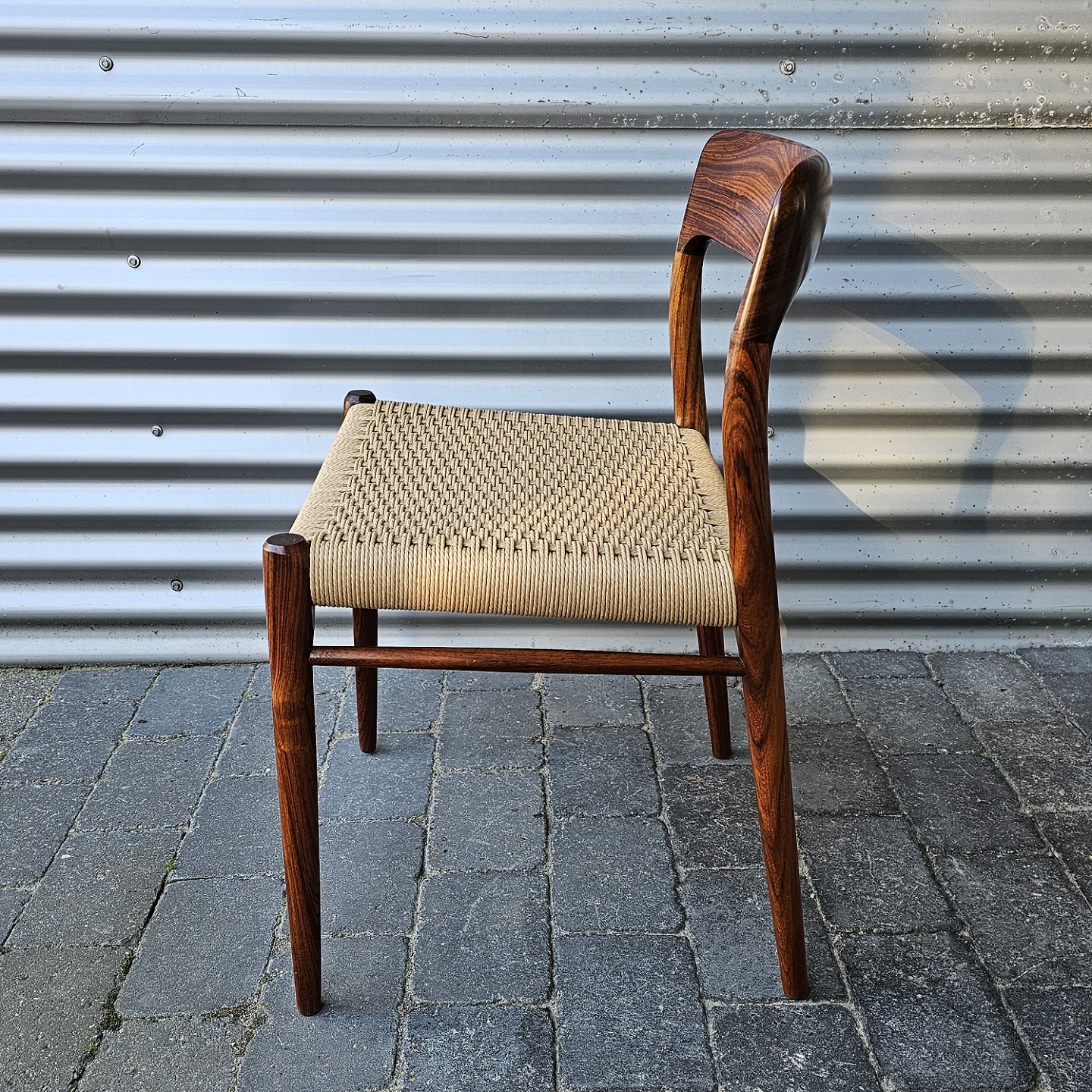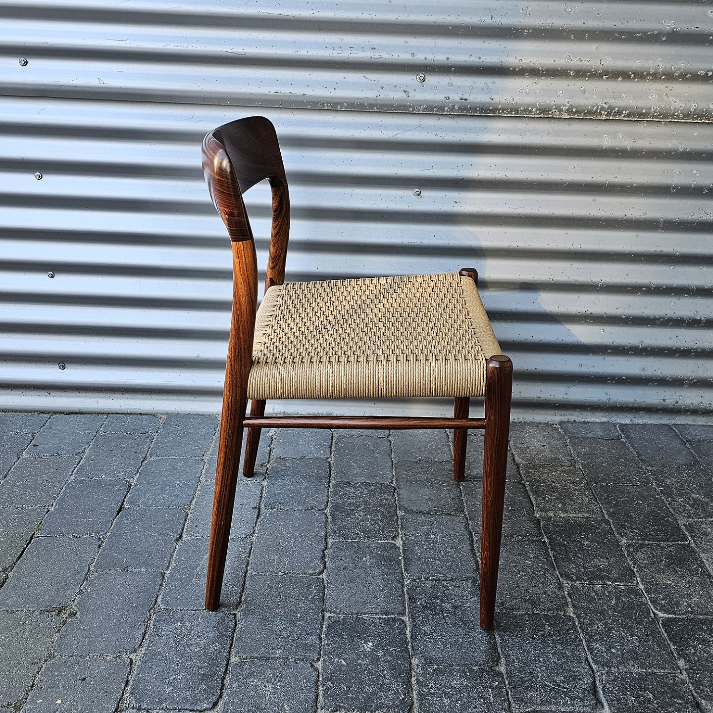 Text zugänglich auf Dänische: Sæt med seks styk spisebordsstole model 75 i palisander med ny flettede sæder. Et sjældent sæt med meget flot palisander træ.