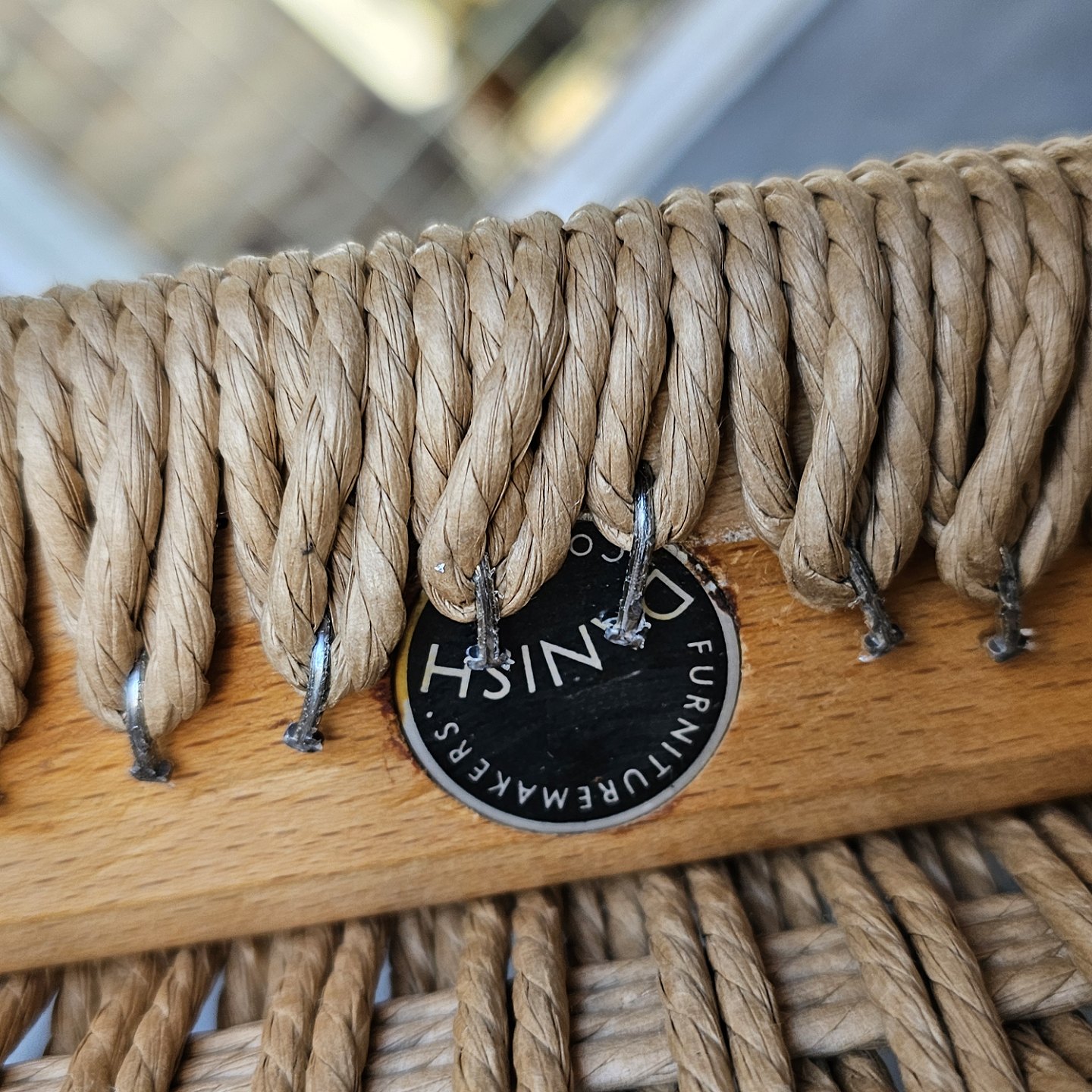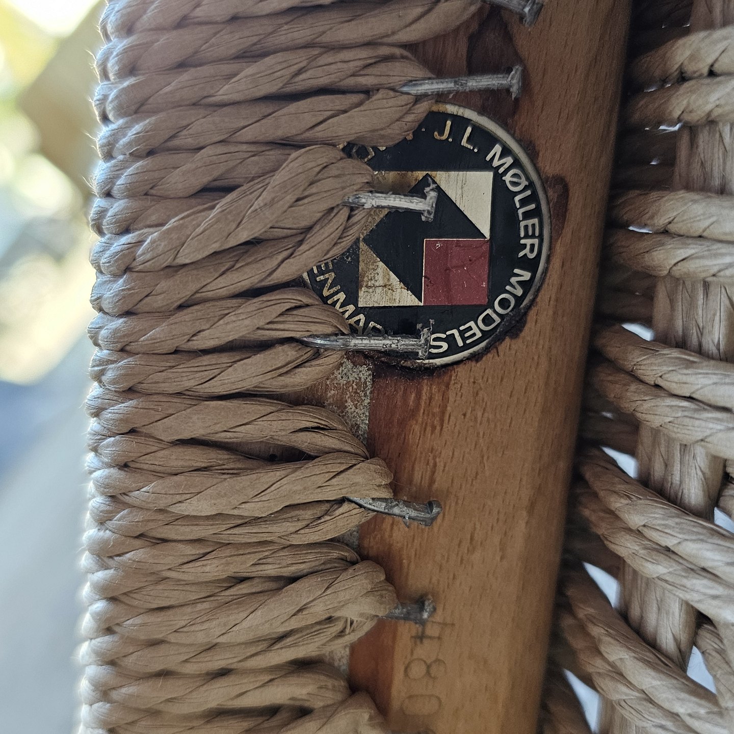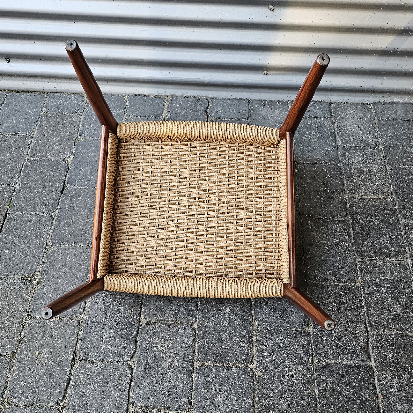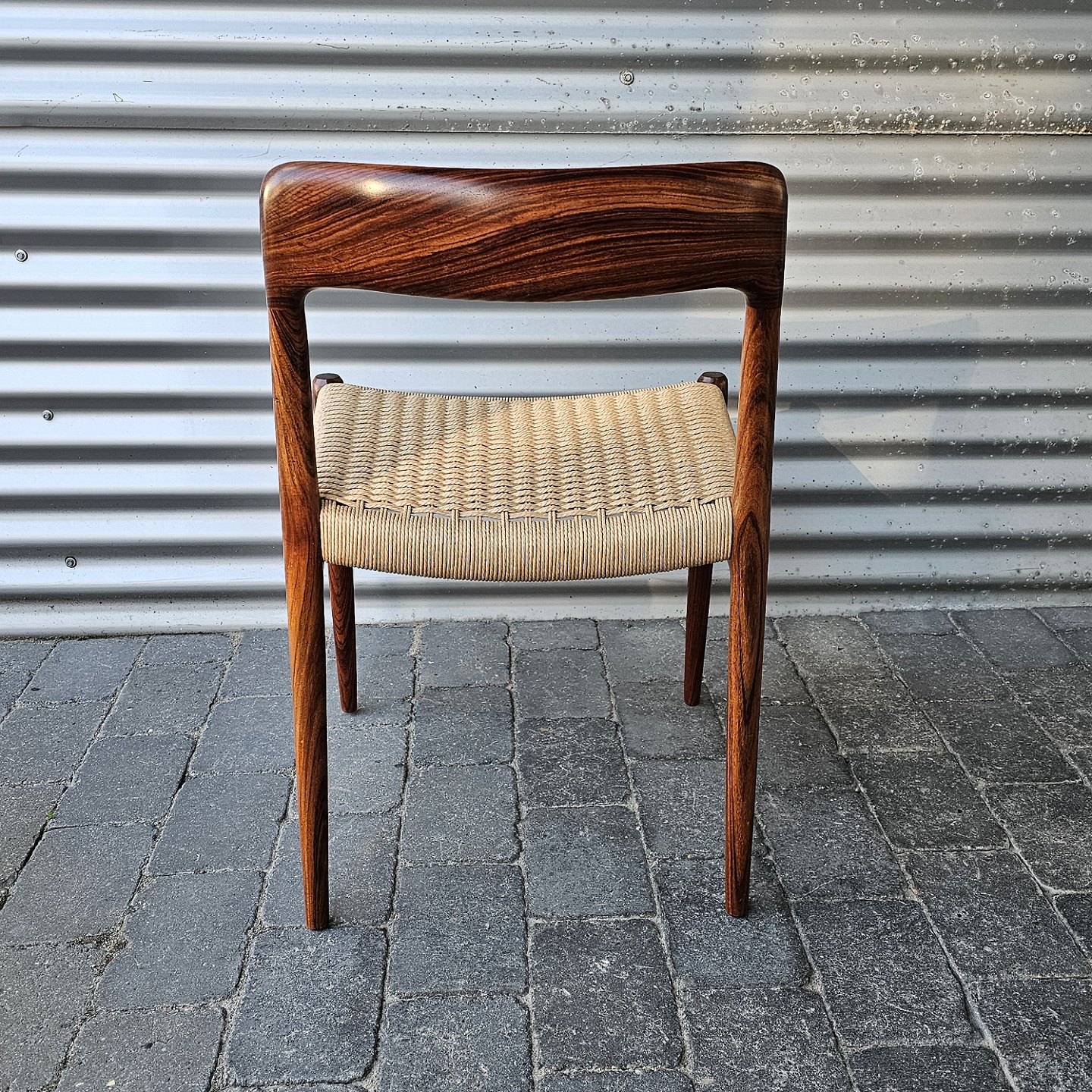 Text zugänglich auf Dänische: Sæt med seks styk spisebordsstole model 75 i palisander med ny flettede sæder. Et sjældent sæt med meget flot palisander træ.