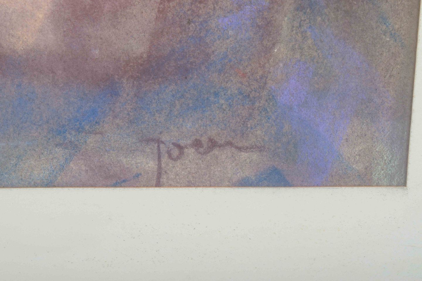Et følsomt og drømmende portræt i dæmpede farvetoner, hvor de bløde linjer og det let slørede ansigt giver billedet en meditativ og næsten tidløs karakter. Den røde hovedbeklædning står som en varm kontrast til de kølige violette og grønne nuancer i baggrunden. Jordells arbejde med kridt fremhæver det sarte og stoflige udtryk, der giver motivet en særlig poesi.