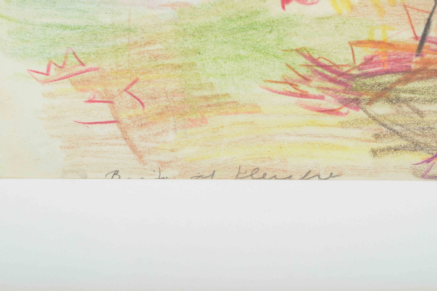 Et koloristisk værk af den svenske kunstner Brita af Klercker, udført i bløde men ekspressive pastelstrøg i grønne, røde og gule nuancer. Kompositionen har et lyrisk og næsten musikalsk præg, hvor farveflader og linjer skaber rytme og bevægelse.