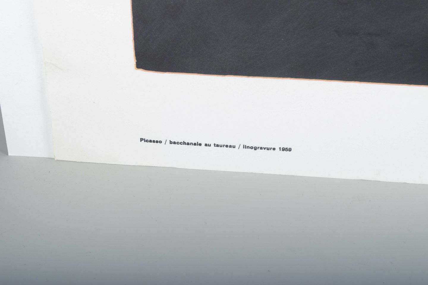 Et livfuldt og koloristisk værk af Pablo Picasso, udført som linoliumstryk i 1960, der viser en bacchansk scene med figurer og tyr i en stiliseret, næsten arkaisk form.