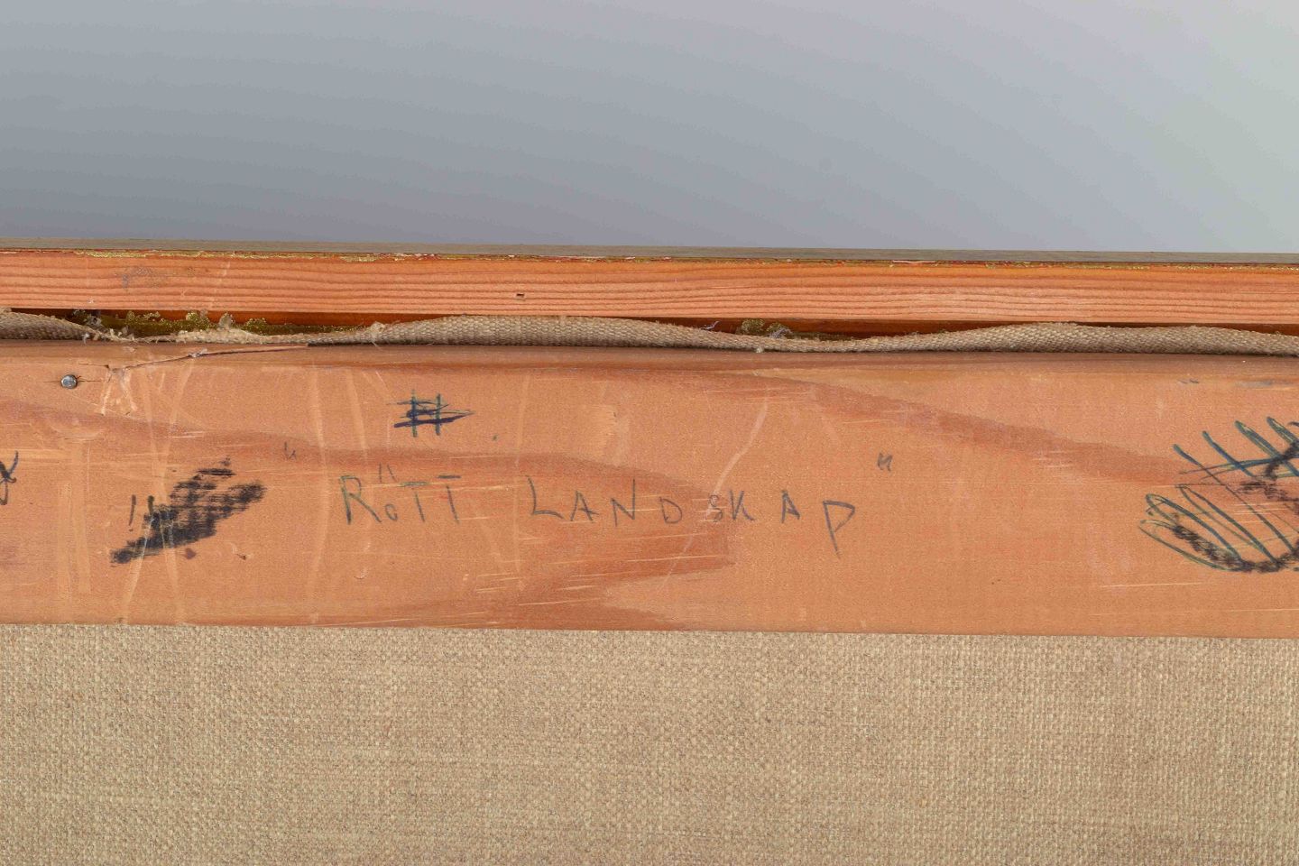 Et ekspressivt landskabsmaleri af den svenske kunstner Sven Erik Markhed. Værket er kendetegnet ved brede, pastose penselstrøg i jordnære røde og brune nuancer, afbrudt af grønne felter og et blåt himmelbånd. Et typisk eksempel på Markheds abstrakte fortolkning af naturen fra 1970’erne–1980’erne.
