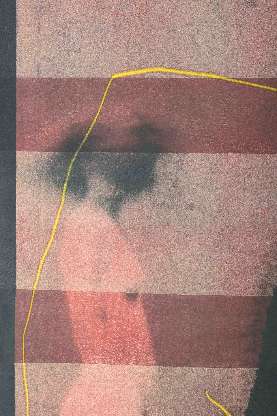 Et karakteristisk grafisk værk af den uruguayanske kunstner Juan Cano, hvor han kombinerer figurative og abstrakte elementer gennem lagdeling af felter og spontane streger. Motivet viser en stiliseret kvindefigur i kombination med geometriske felter og ekspressive gule linjer, hvilket skaber en stærk visuel kontrast.