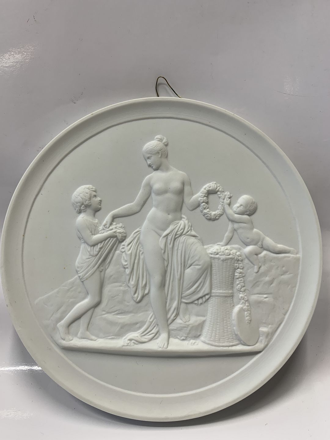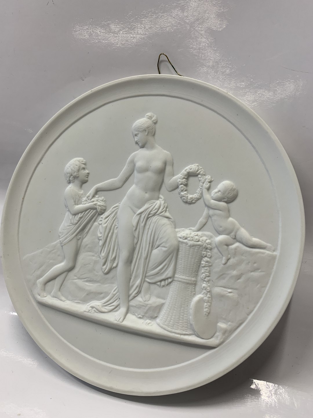 Royal Copenhagen Bisquit platte af Thorvaldsen "Barndom og Forår." 14 cm.