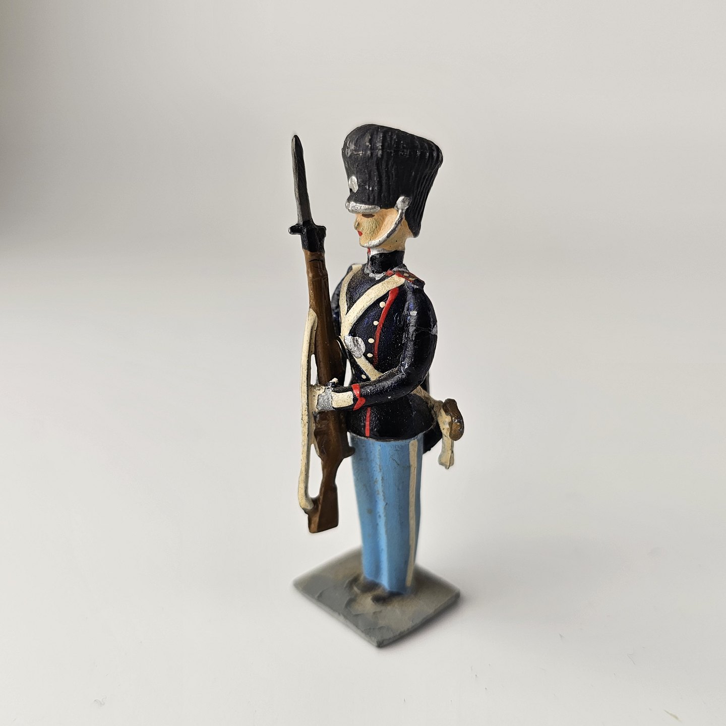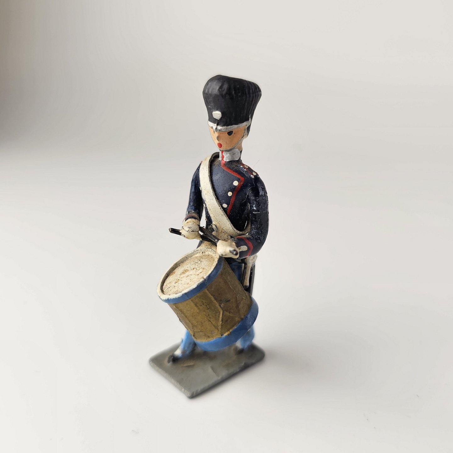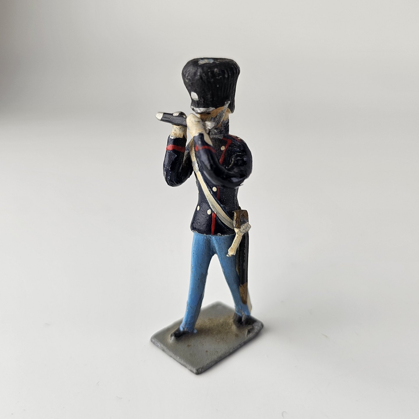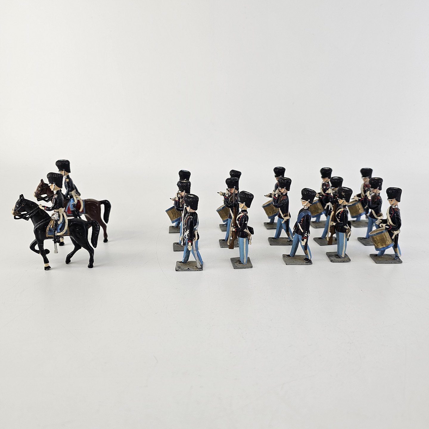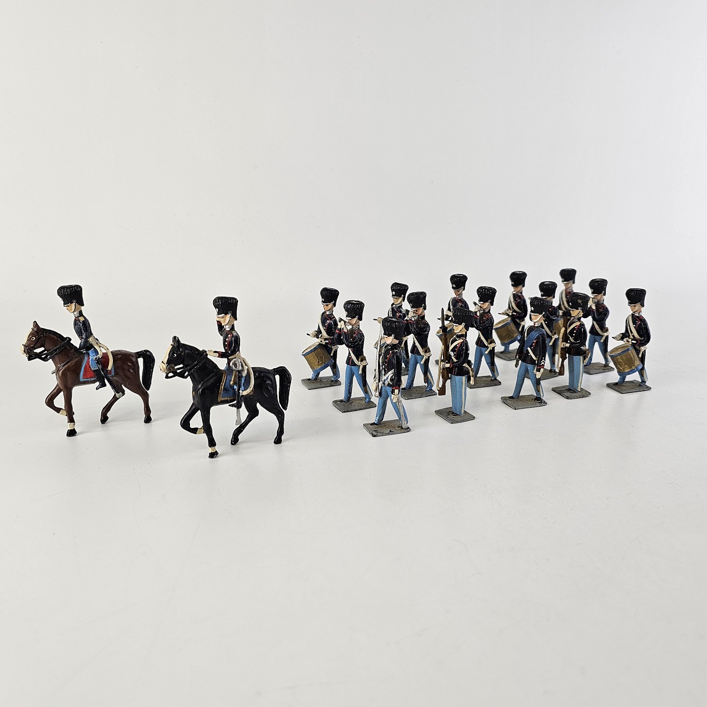 17 figurer af livgarder med bjørnehuer i tin, to til hest og 15 gående med trommer, fløjter, eller våben