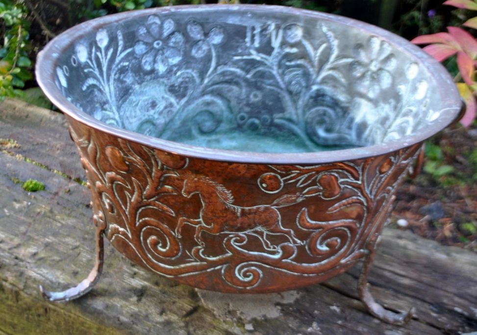 Kupferner Blumentopf, 18. Jahrhundert. Dänemark. Gestempelt: 175?. Die letzte Zahl ist teilweise durch die Dekoration verdeckt. Mit drei Beinen und zwei Griffen. Mit getriebenen Dekorationen aus Blumen, Bäumen, Pferden, Vögeln und Hirschen an der Seite. H: 19 cm. Durchmesser: 32,5 cm.
