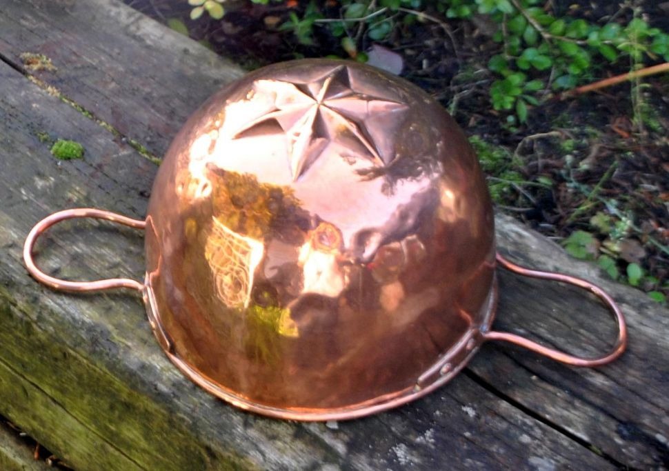 Pateten- oder Fleischgericht, Kupfer, 19. Jahrhundert. Dänemark. Mit zwei Henkeln und sternförmiger Verzierung. Durchmesser: 21,5 cm. Durchmesser inkl. Henkel: 37,5 cm. H: 14 cm. Keine sichtbaren Stempel.
