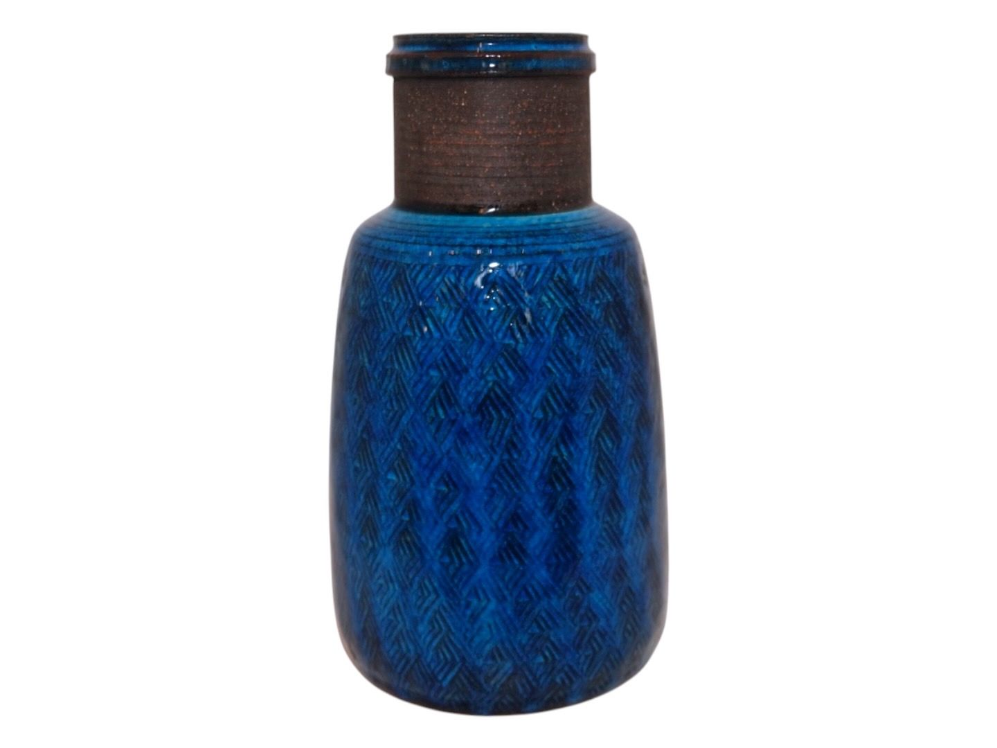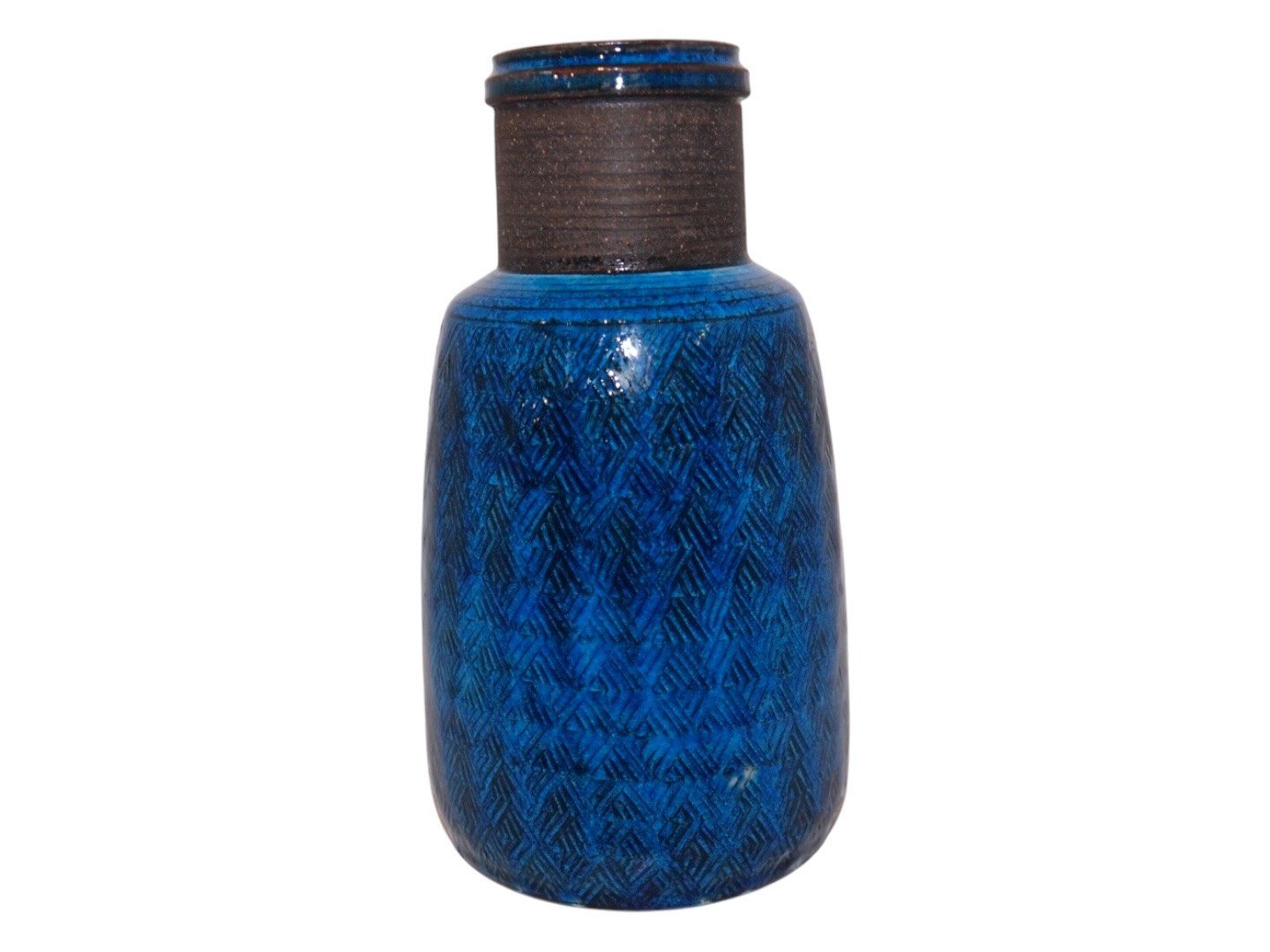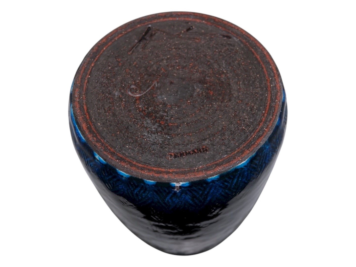 Der er et lille afslag på bundkanten samt lidt hvide glasurfejl på vasen, se fotos.