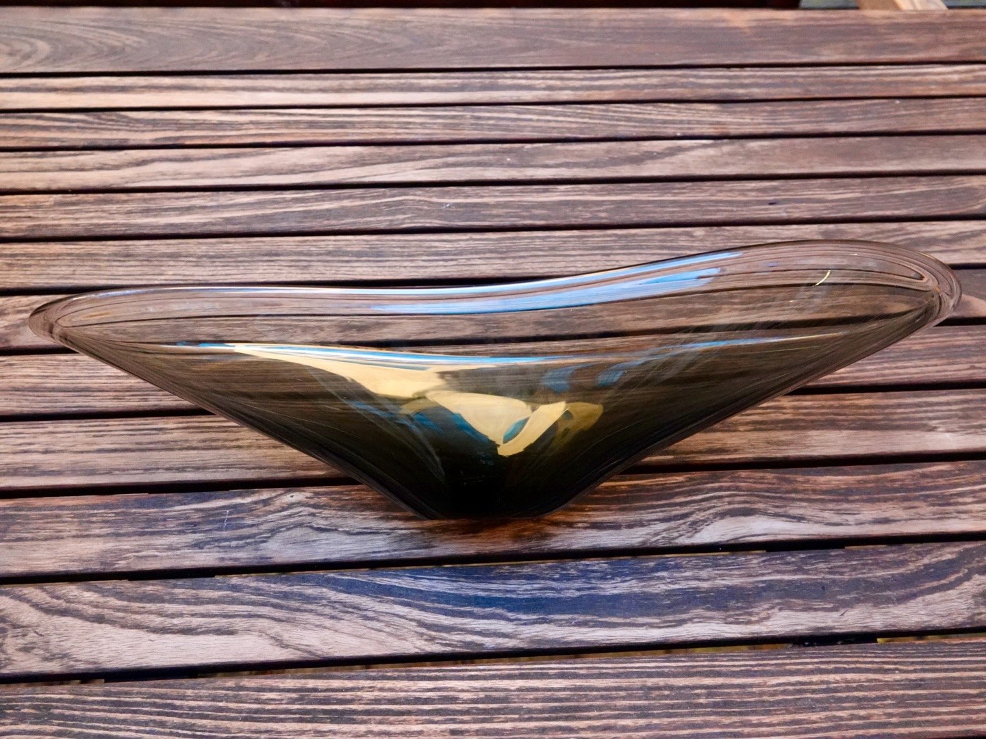 Formentlig Svensk glasværk men kunne også være Holmegaard, ekstra lang bordskål i røgfarvet glas.
